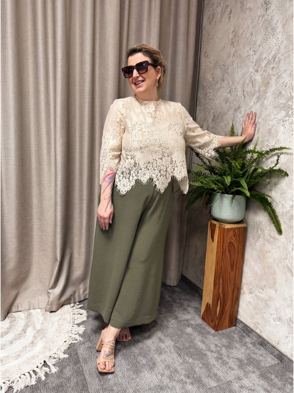 Culotte kalhoty v odstínu Khaki přinášejí do outfitu klidnou, sebevědomou eleganci v přírodně laděné barvě, která působí sofistikovaně a snadno se kombinuje. Volný, rovný střih a pohodlná guma v pase zajistí, že kalhoty krásně sedí a přirozeně kopírují siluetu bez nepříjemného stažení.