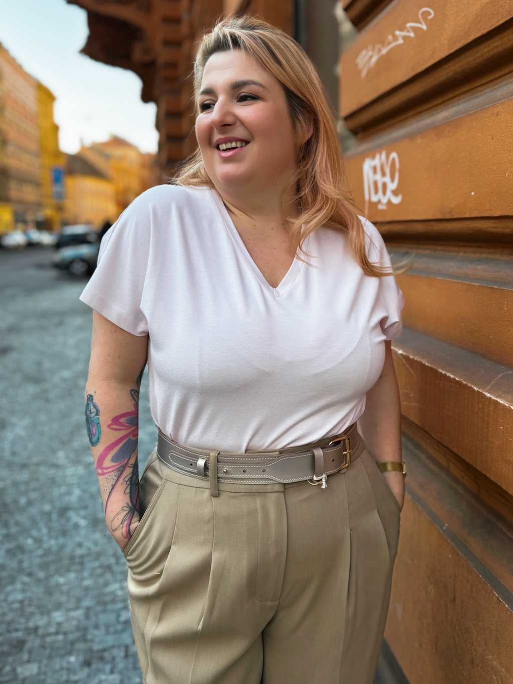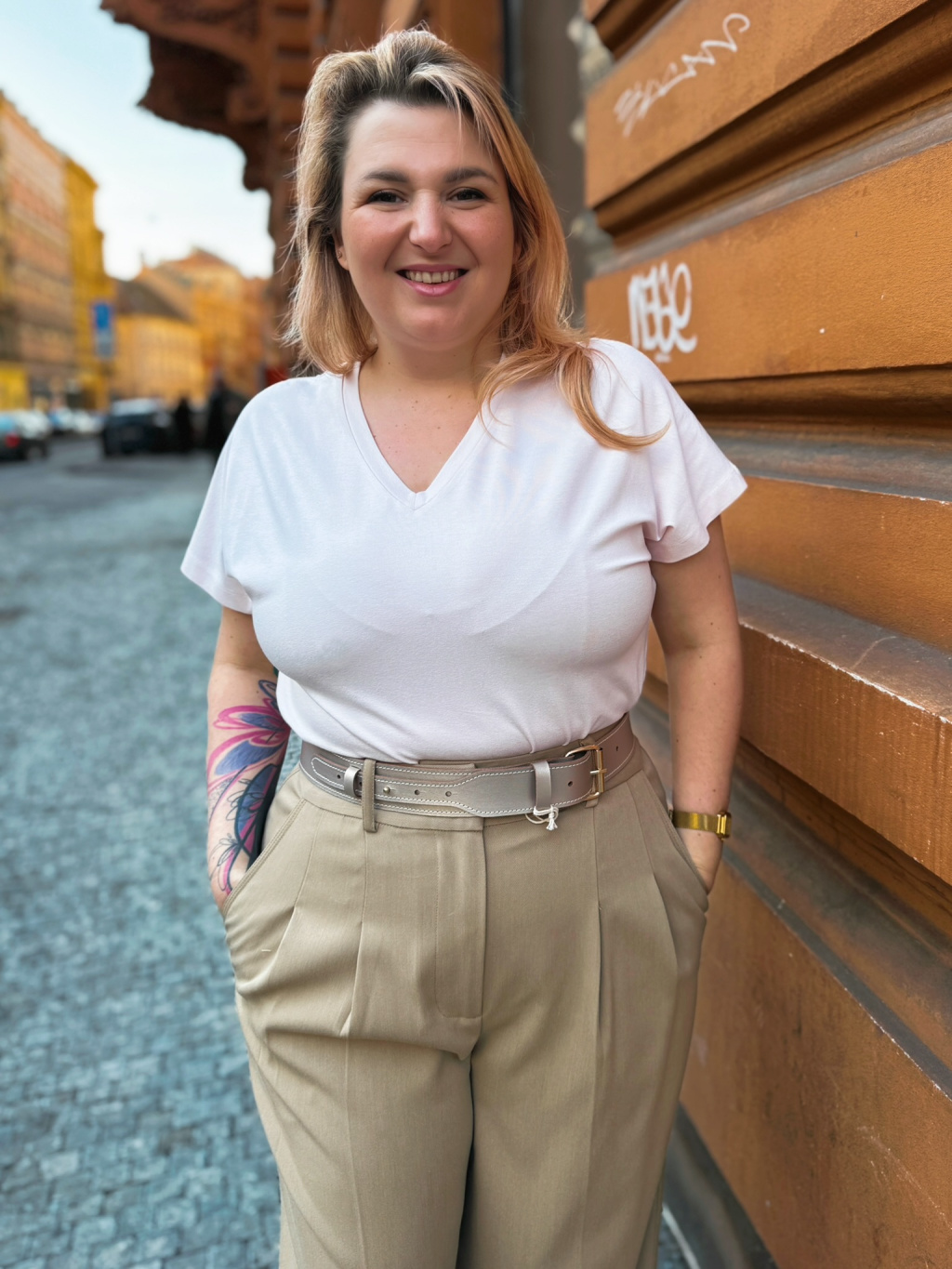 Top Badu v bledě růžové variantě působí jemně, svěže a velmi žensky. Hebká viskóza je maximálně komfortní na nošení a ideální i pro teplejší dny, kdy oceníte její prodyšnost a lehkost. Rovný, klasický střih a výstřih do V dodávají topu elegantní jednoduchost, která krásně funguje samostatně i jako základ vrstvení. Tento odstín snadno rozzáří celý outfit a přinese mu lehkost bez zbytečné okázalosti. Užijte si pocit nenucené elegance, která vás bude provázet po celý den