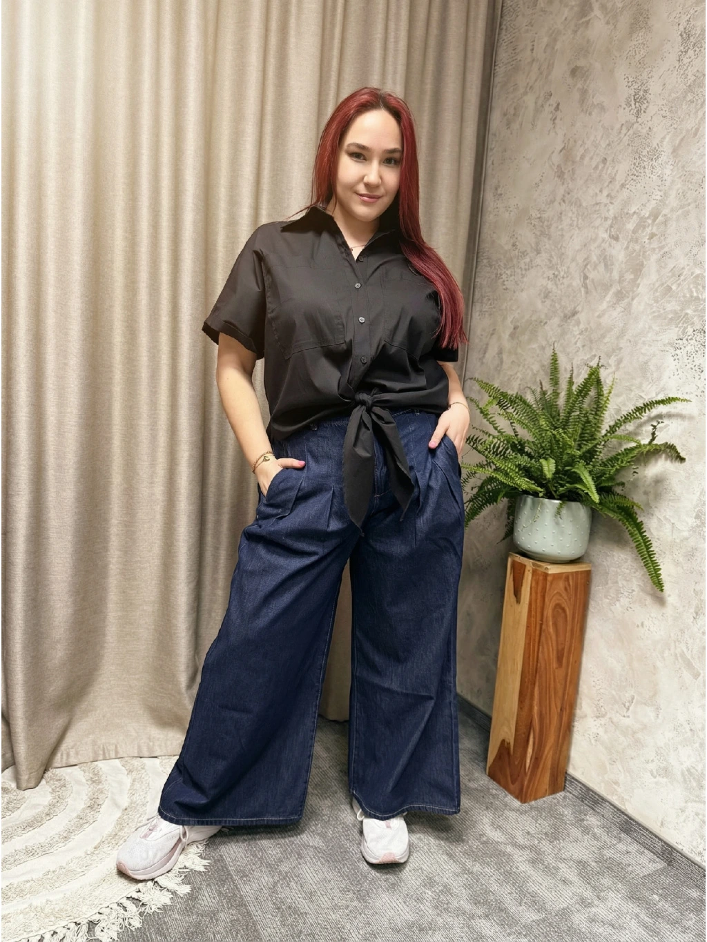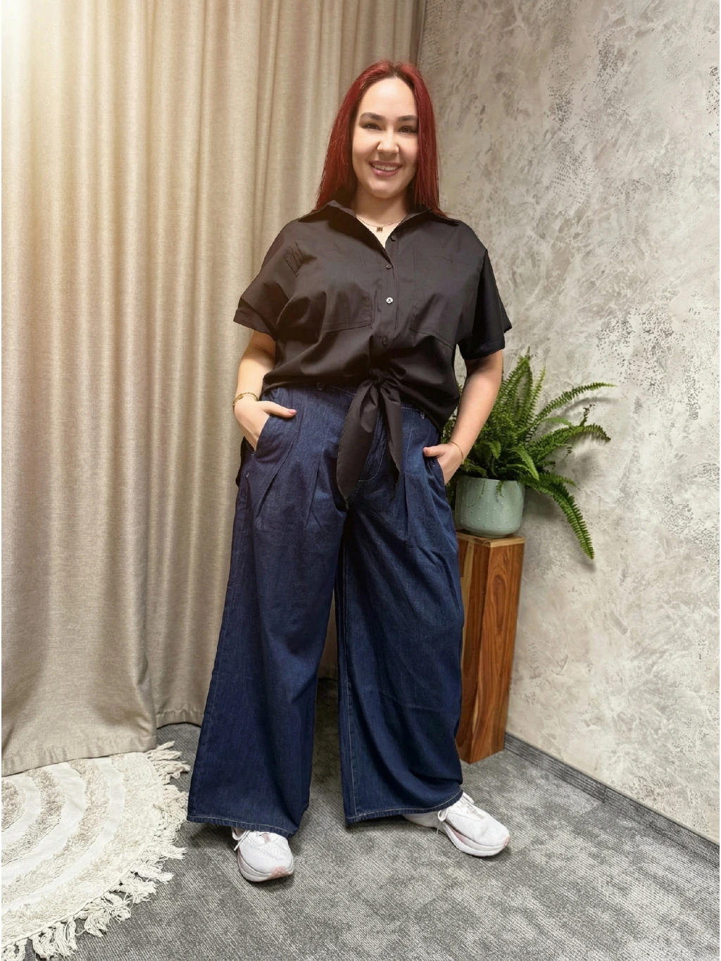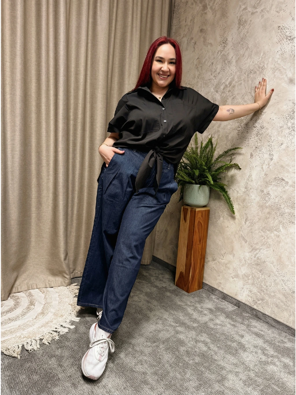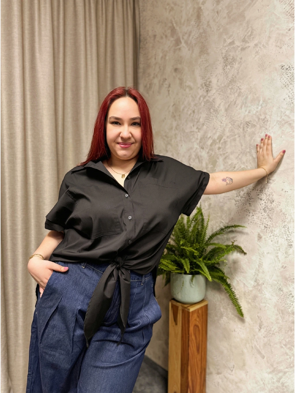 Černá barva dodává košili nadčasový, sofistikovaný charakter a skvěle ladí jak s denimem, tak s neutrálními i výraznějšími tóny. Díky uzlu v pase ji snadno zkombinujete s kalhotami do pasu i sukní – opticky prodlužuje nohy a zvýrazňuje pas, aniž by působila upnutě.