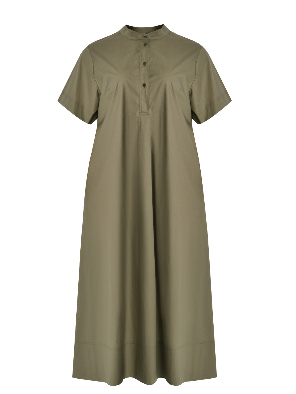 Khaki barva podtrhuje charakter šatů a skvěle pracuje s kontrastními doplňky. Stačí přidat pásek pro zvýraznění pasu nebo je nosit volně pro uvolněný, elegantní vzhled.