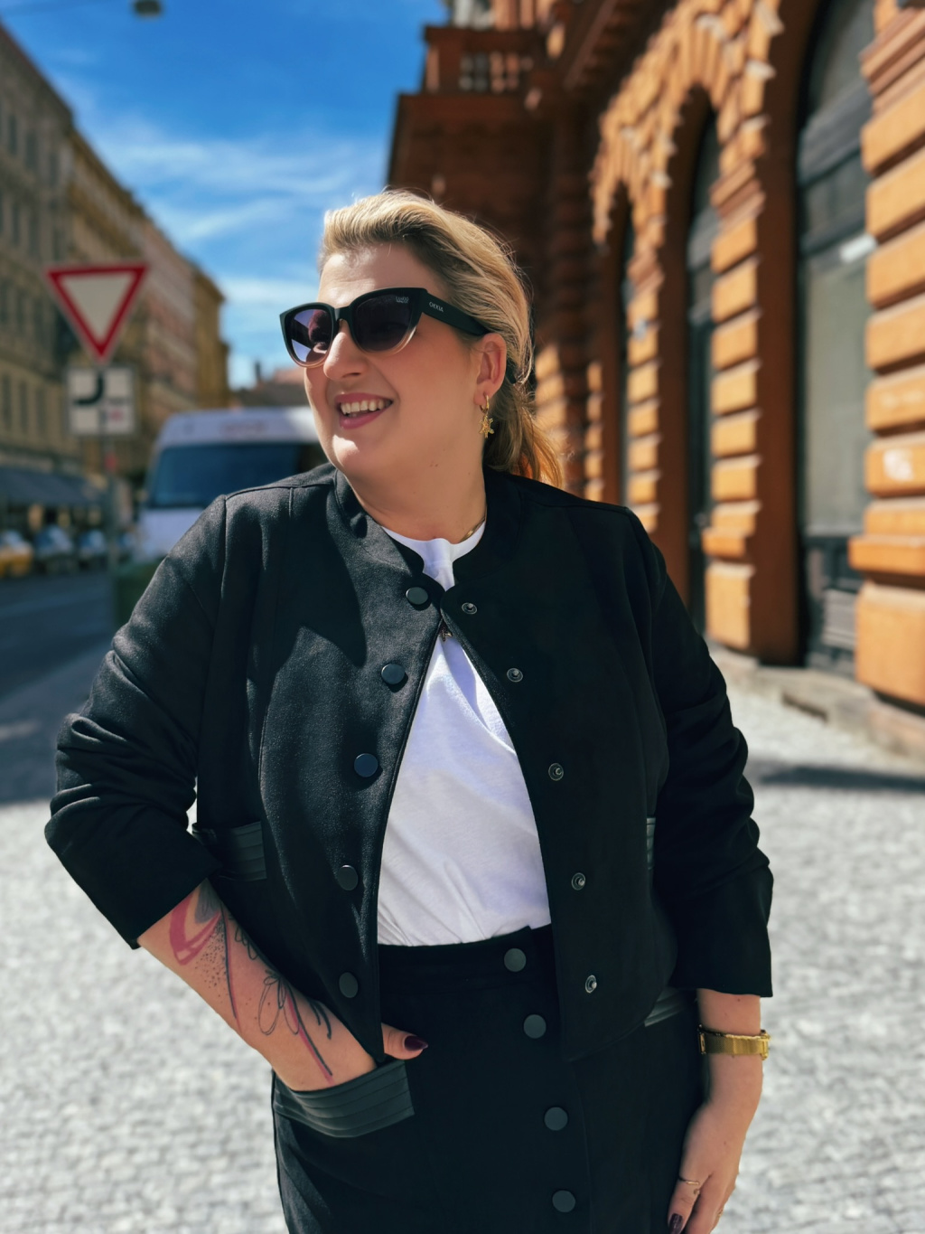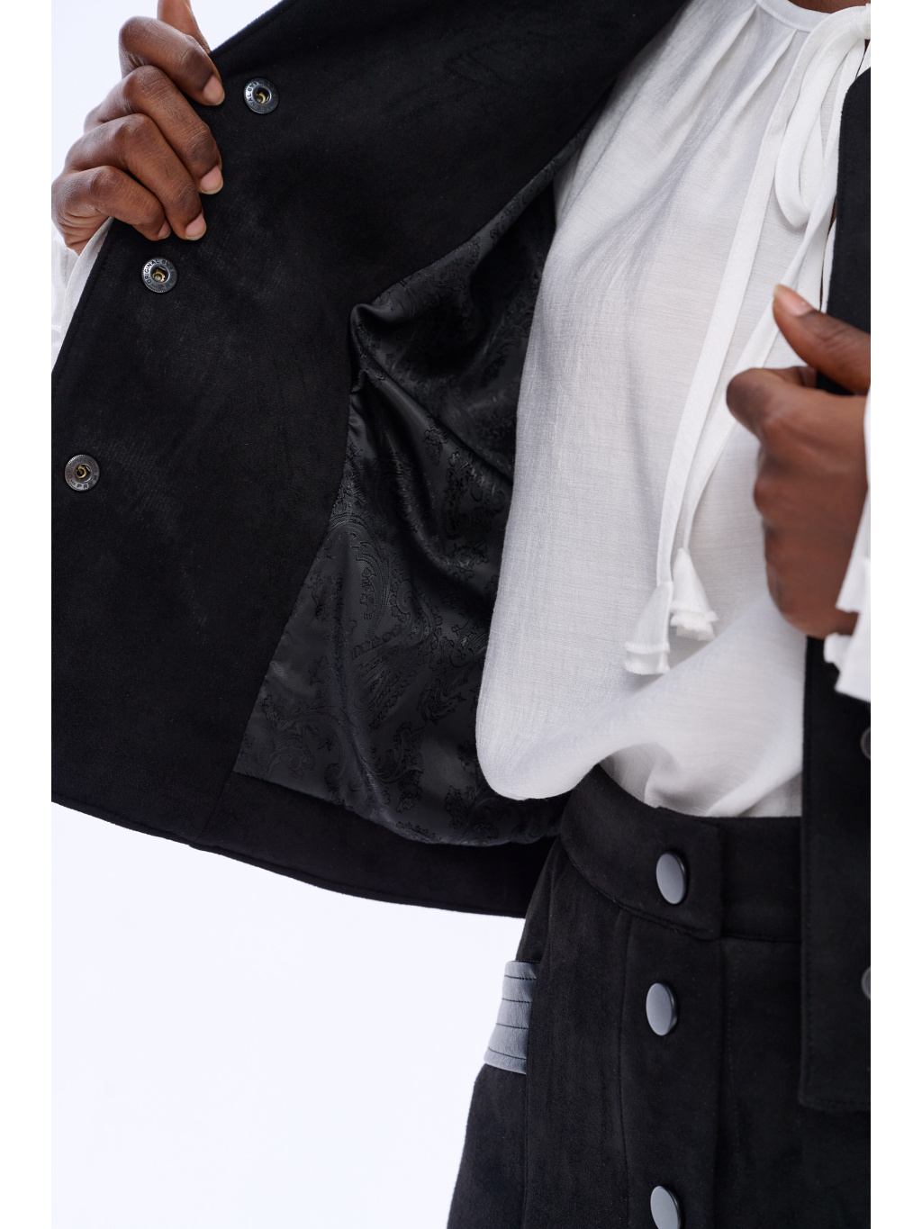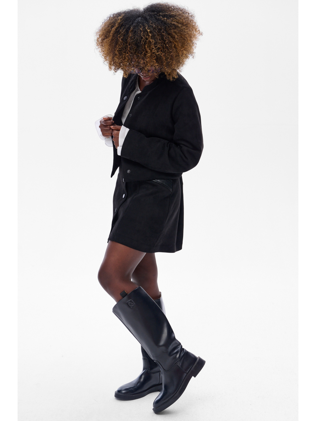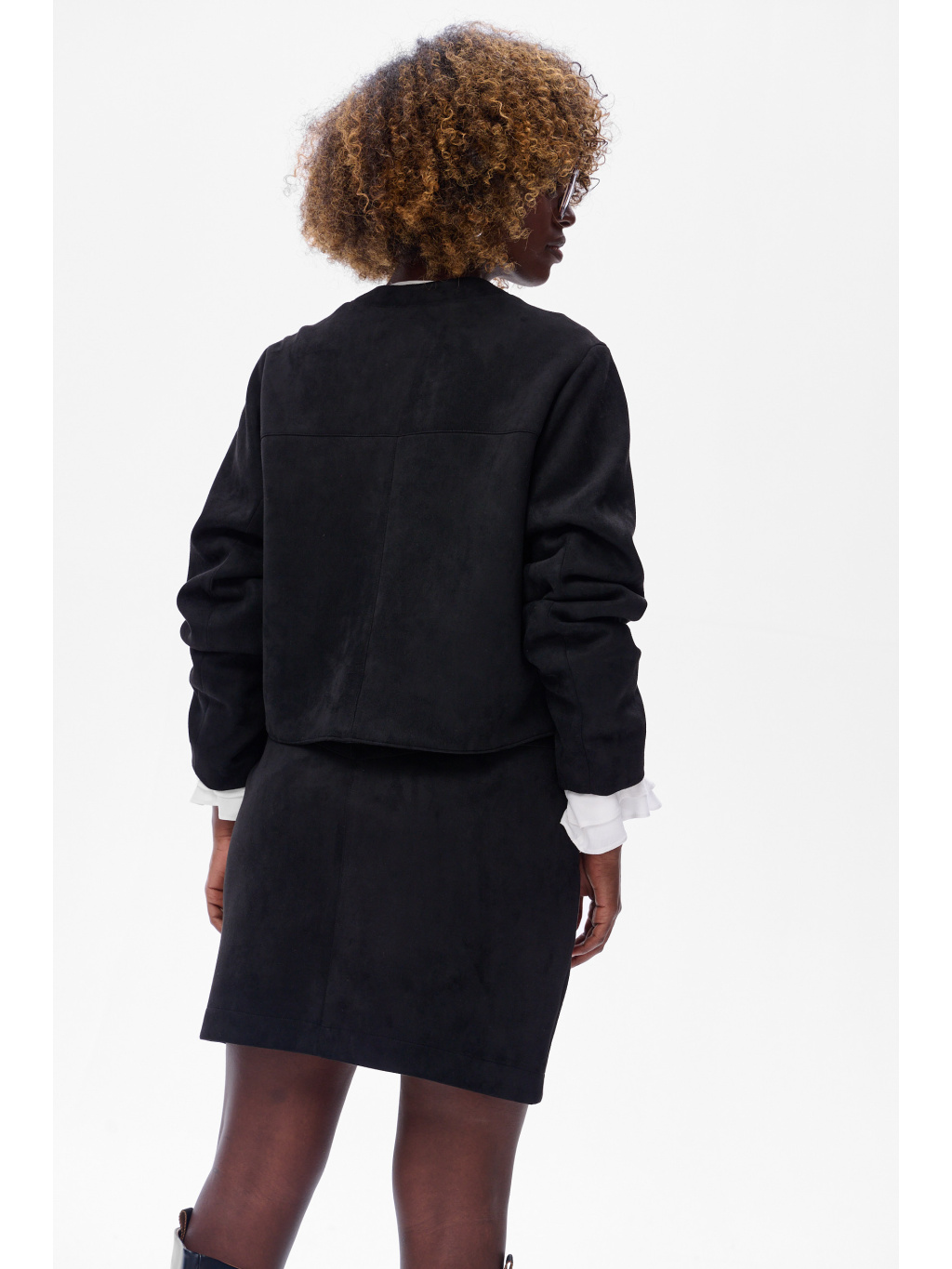Kabátek má rovný, lehce boxy střih se zapínáním na knoflíky a decentními koženkovými detaily u kapes, které mu dodávají šmrnc. Je perfektní jak k sukním, tak ke kalhotám, a když ho zkombinuješ s koženkovou sukní ze stejné kolekce, vznikne nadčasový komplet, který působí velmi sofistikovaně.