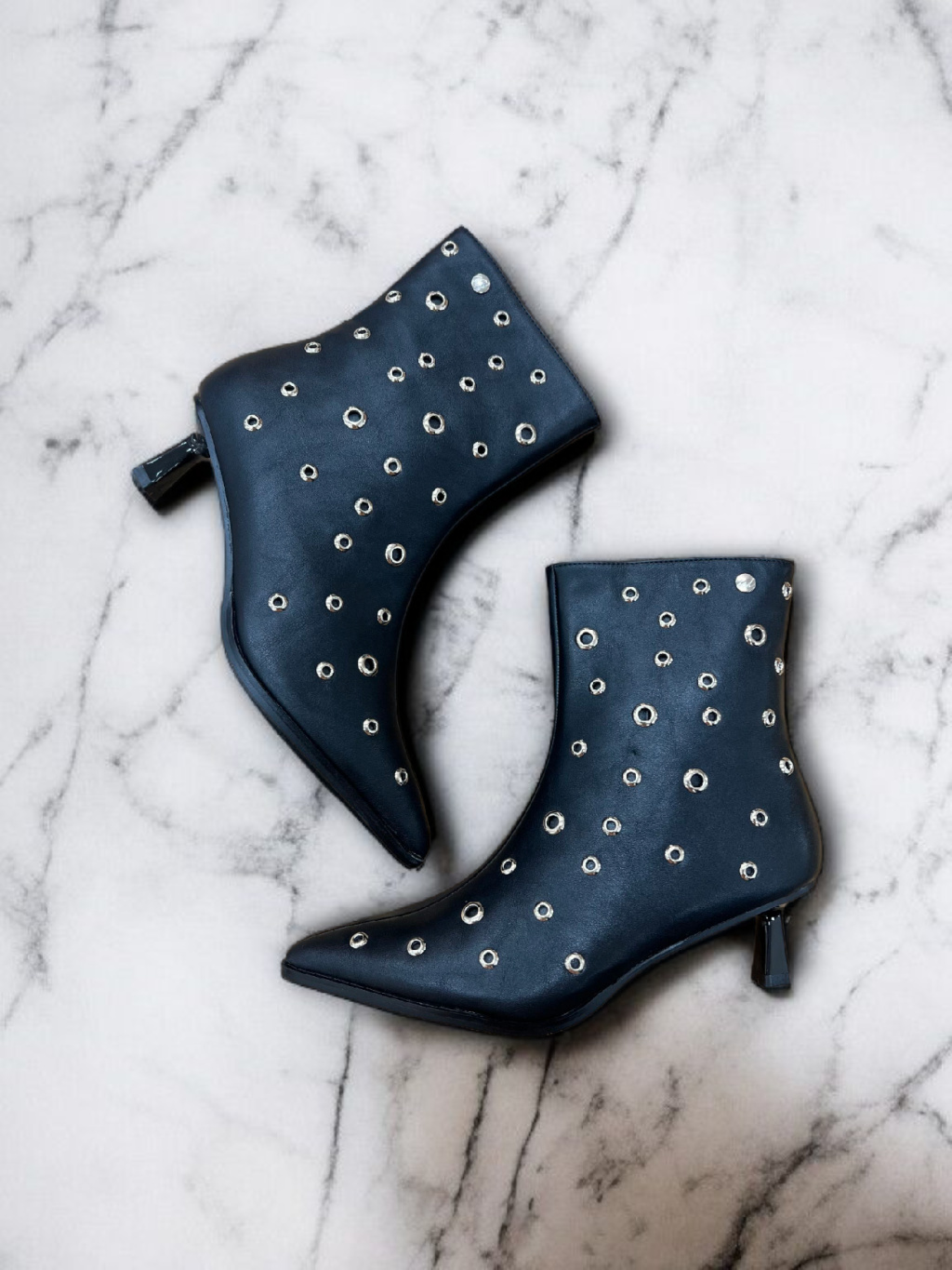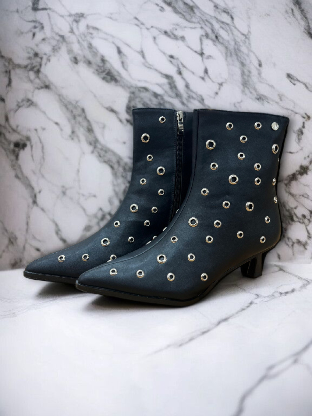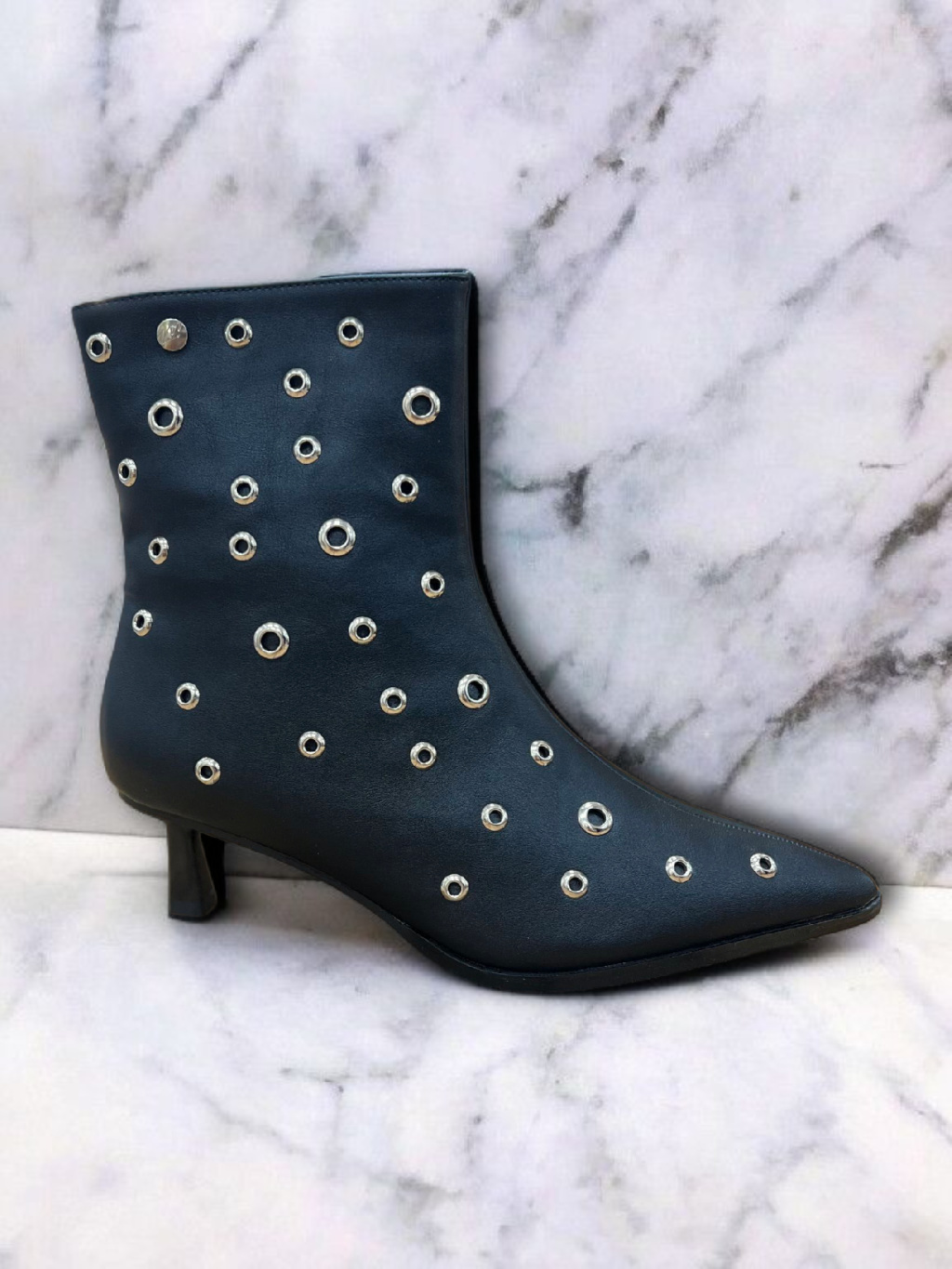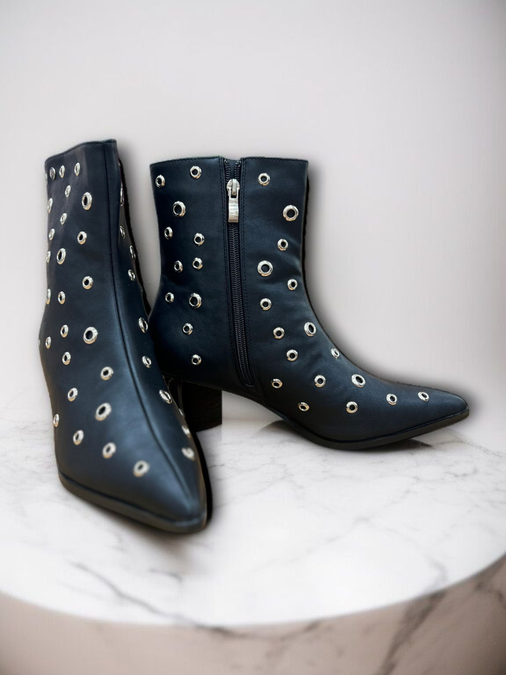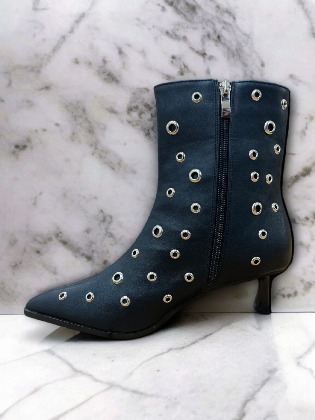 Kotníkové kozačky od španělské značky Top3 Project jsou vyrobené z luxusní veganské kůže s jemně lesklým povrchem, který působí elegantně a zároveň rebelsky. Černý základ zdobí stříbrné cvoky, které dodávají botám osobitý charakter a dělají z nich výrazný kousek, jenž pozvedne i ten nejjednodušší outfit.