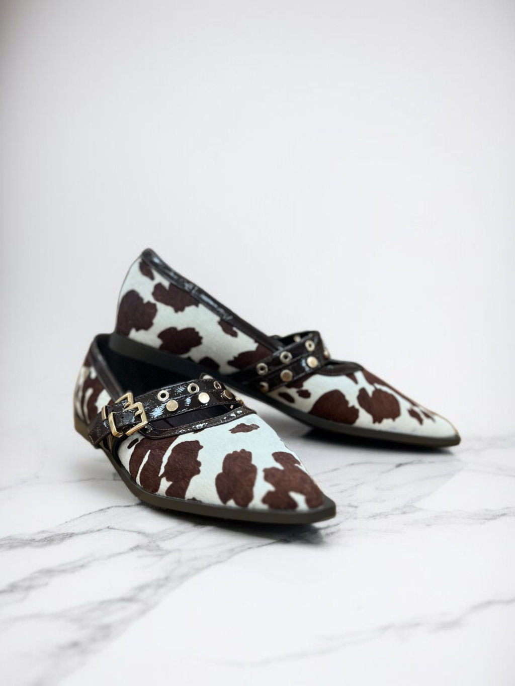 Tyto kožené balerínky jsou skutečným módním statementem. Originální kravský print v kontrastní kombinaci hnědé a bílé barvy okamžitě zaujme a dodá tvému outfitu nevšední šmrnc. Elegantní špičatý střih prodlužuje siluetu nohy a pásek přes nárt s ozdobnými cvočky působí nejen prakticky, ale i velmi stylově.