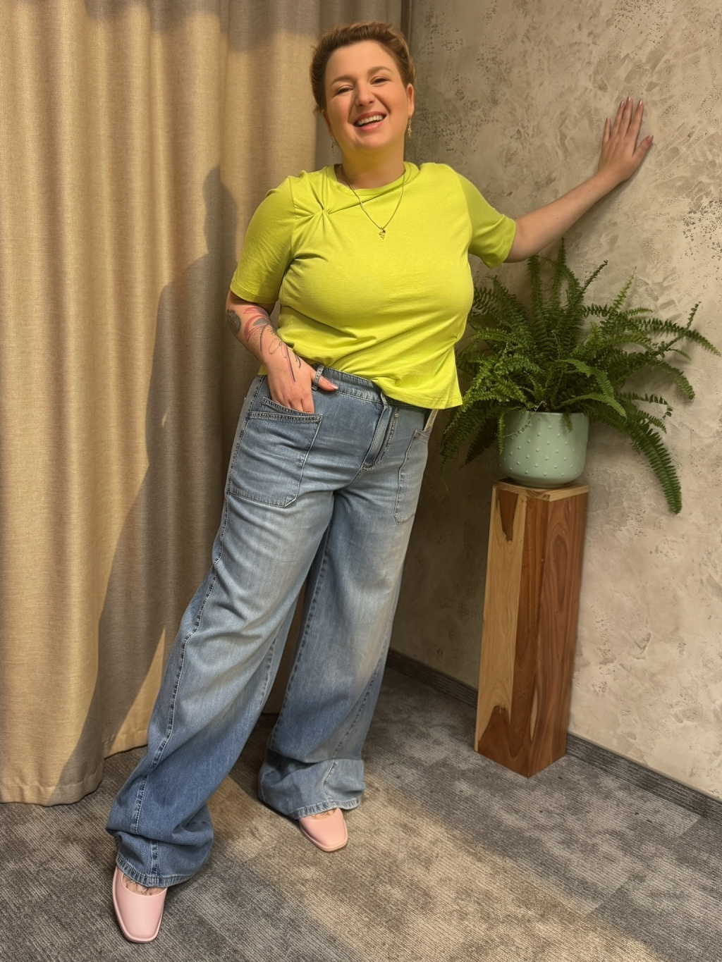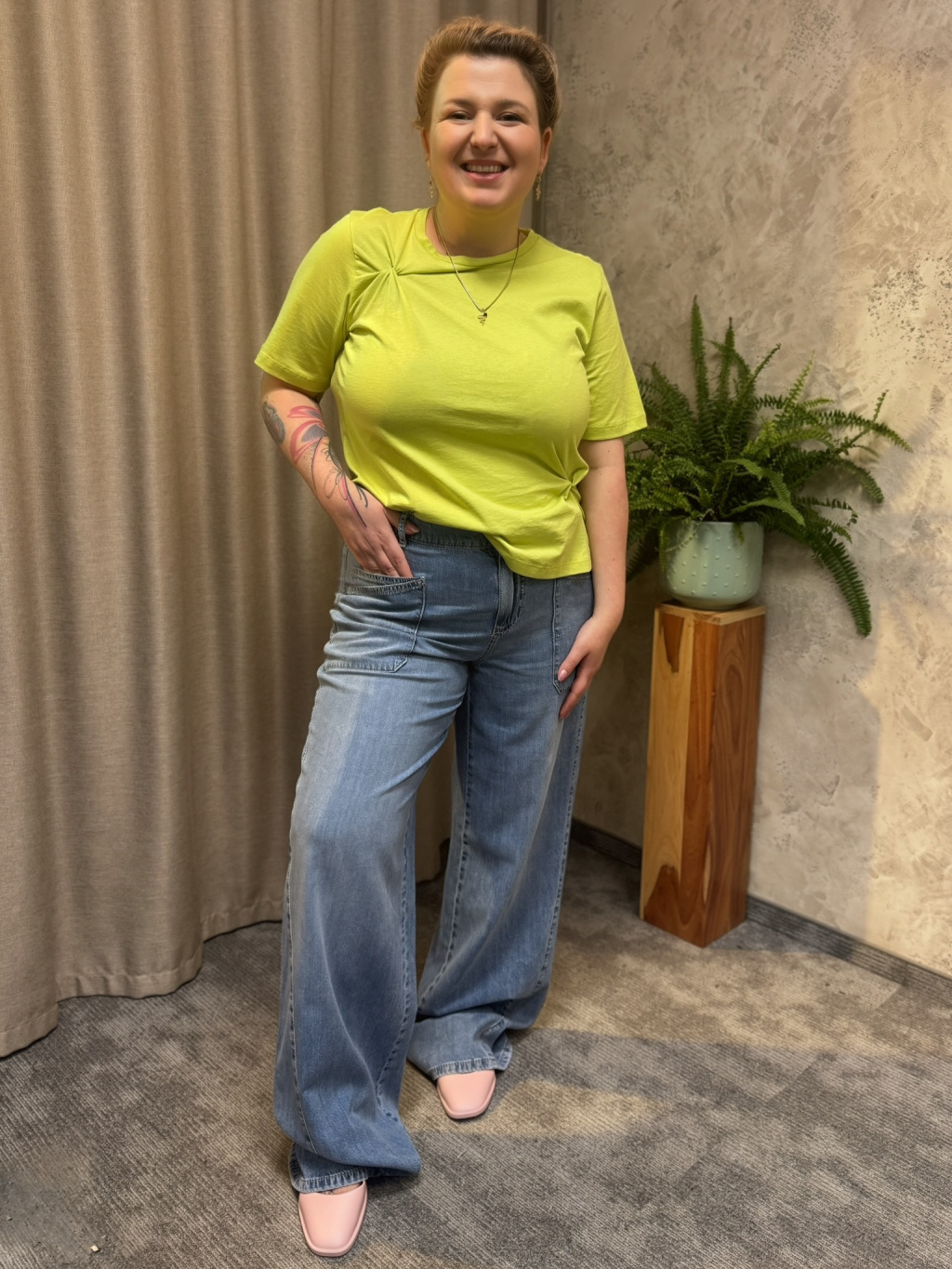 - 🧵 Široké, rovné nohavice – vytváří moderní siluetu, maskují stehna i lýtka