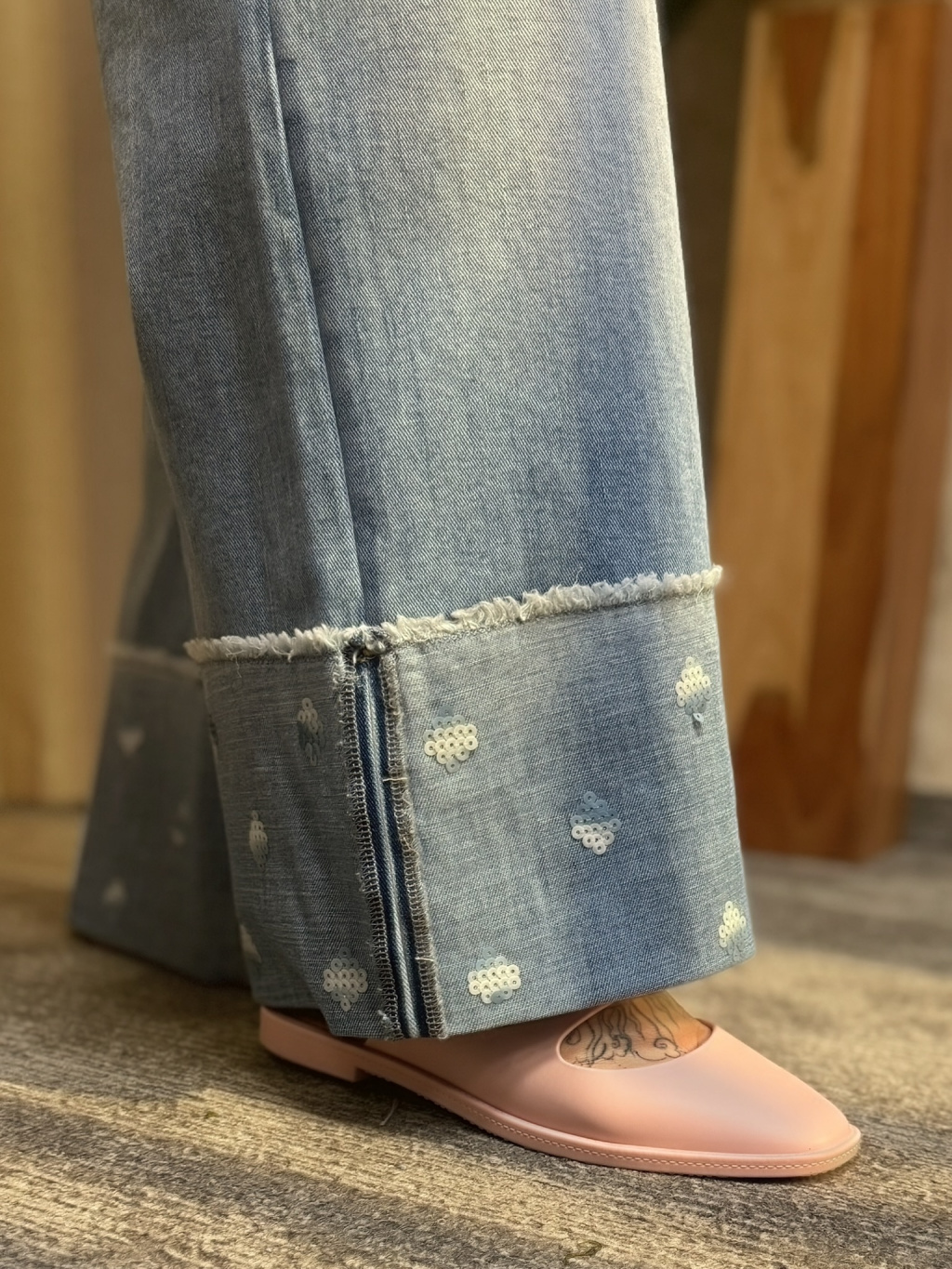 - 📏 Výrazný spodní lem – ohrnutý efekt s drobnými „opotřebovanými“/dekorativními detaily dodává džínám jedinečný charakter