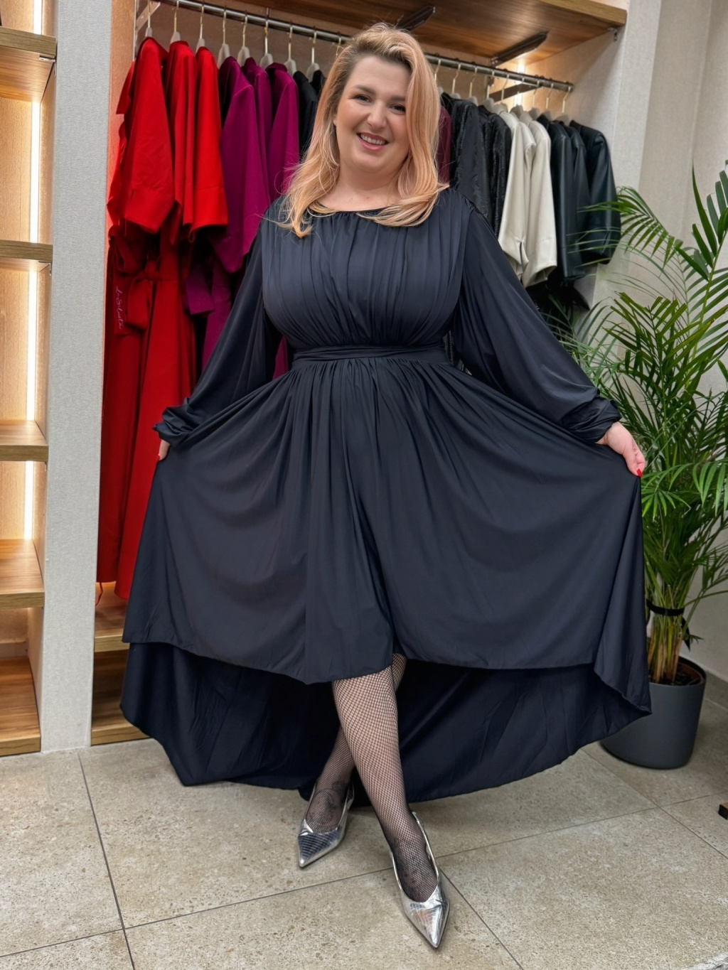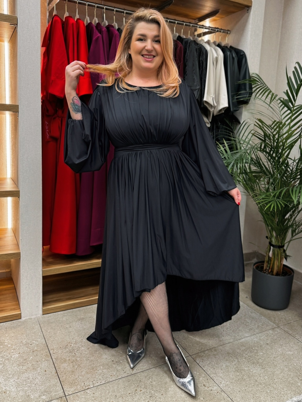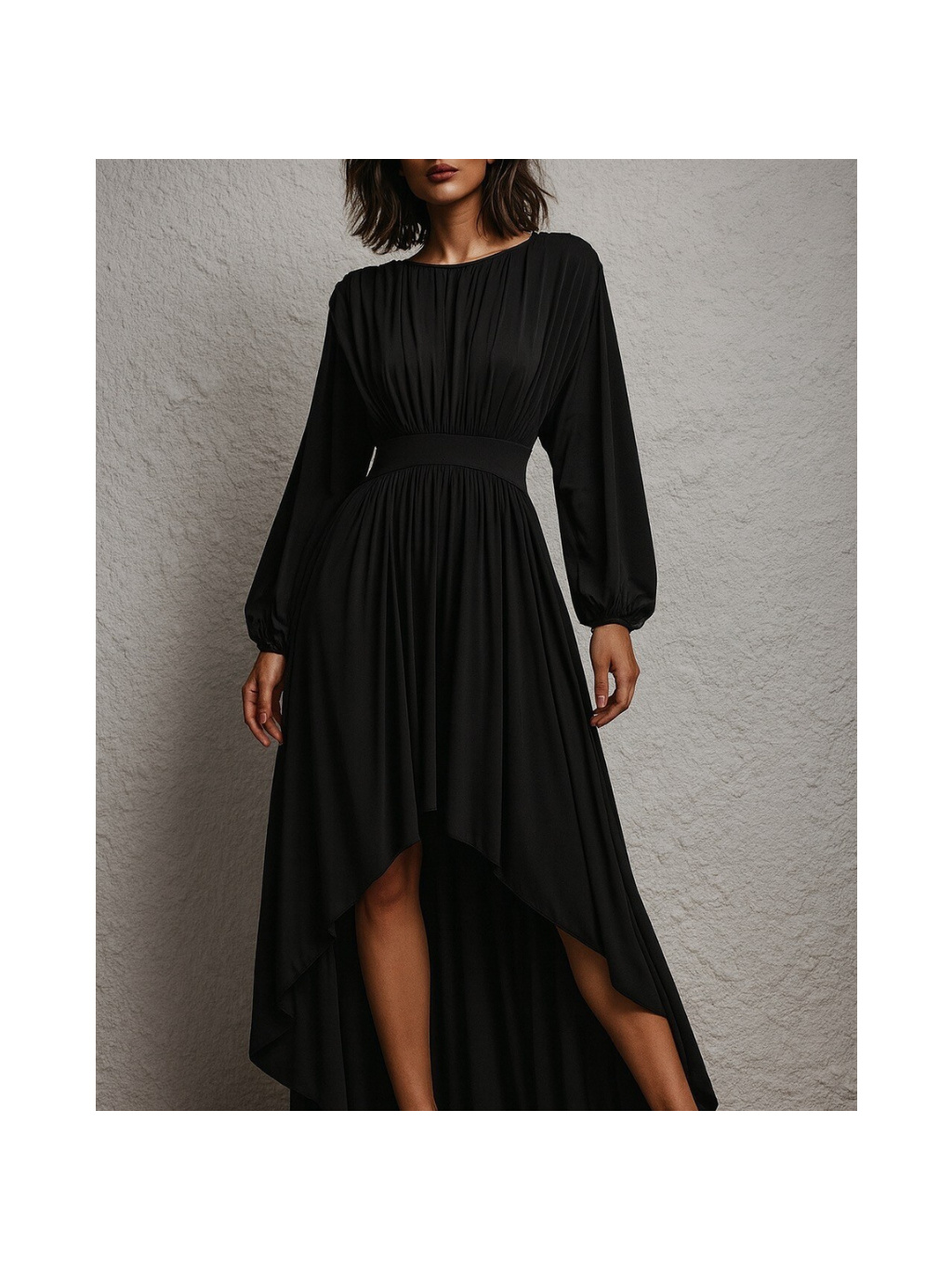 Pevný pás v pase vytváří krásnou siluetu, zatímco jemně řasené balonové rukávy zakončené gumičkou působí elegantně a zároveň pohodlně. Zapínání na zip v zadní části zajišťuje perfektní usazení na postavě. Černá barva podtrhuje nadčasovost modelu a dává vyniknout střihu i detailům.