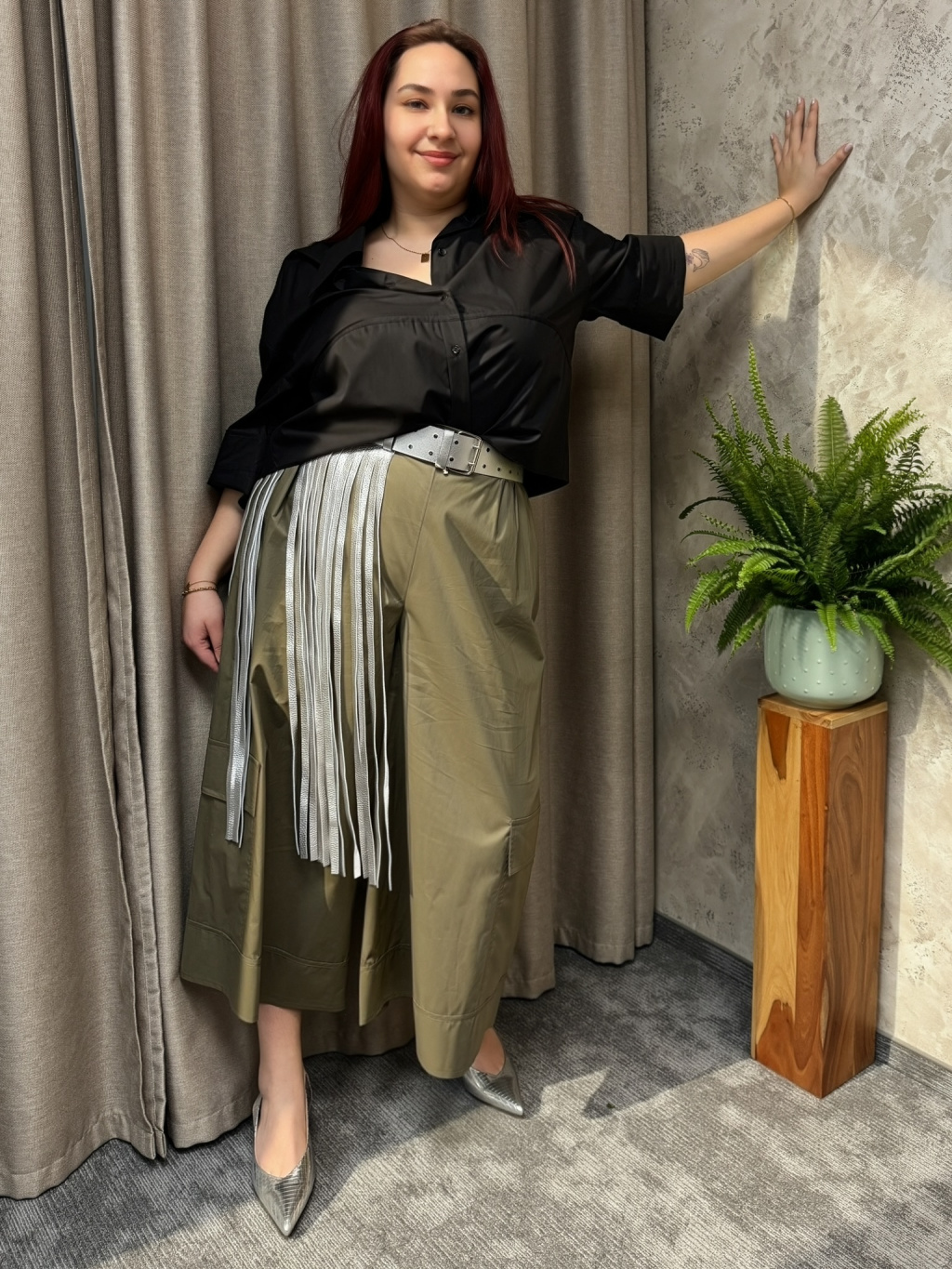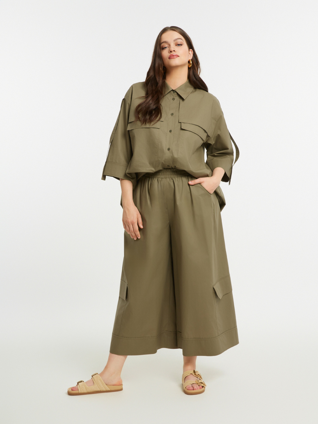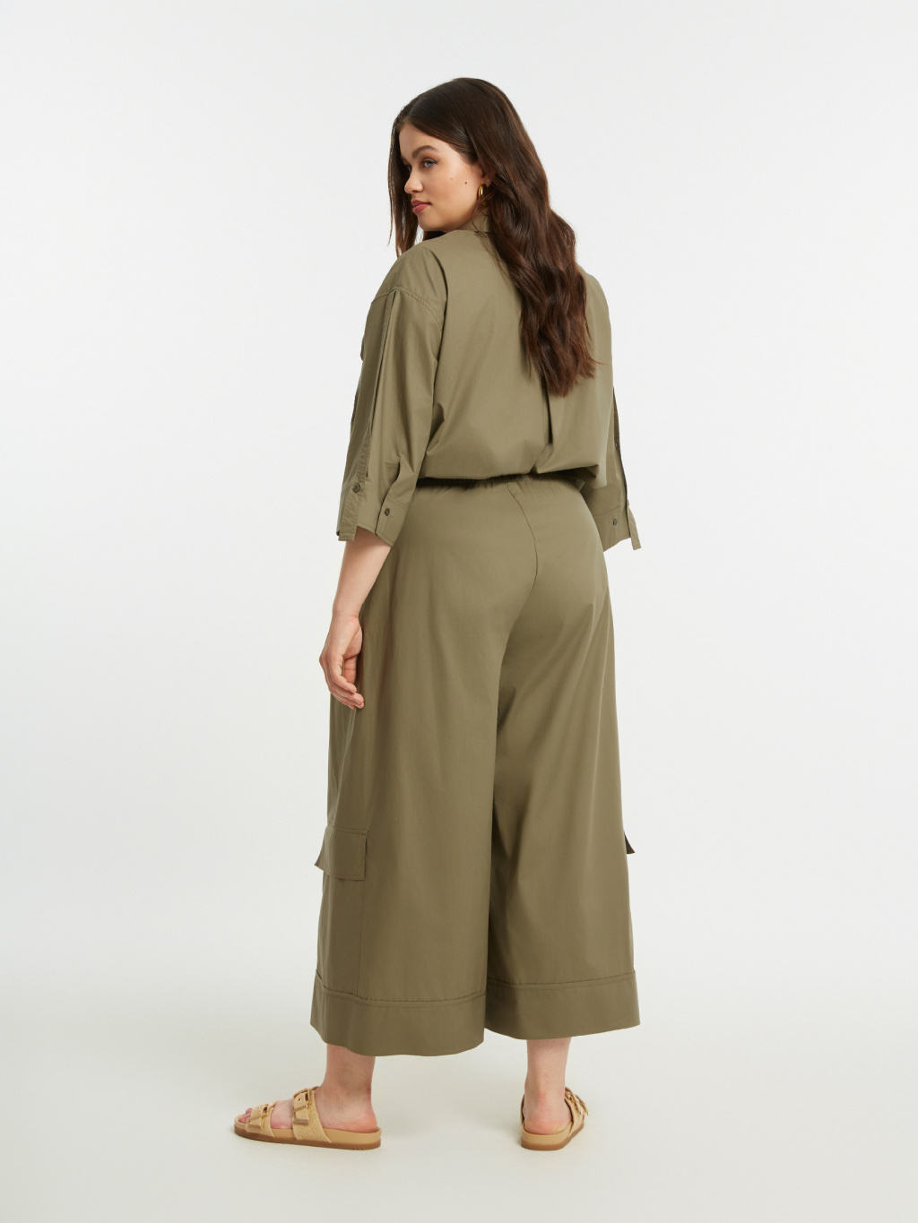 Khaki tón podtrhuje nadčasový, lehce utilitární charakter modelu, který doplňují výrazné kapsy na nohavicích. NOEMI se snadno kombinuje s kratšími košilemi, jednoduchými topy i splývavými halenkami, kde vynikne její objem a silueta. Výsledkem je moderní, uvolněný outfit, který si zachovává eleganci i praktičnost.