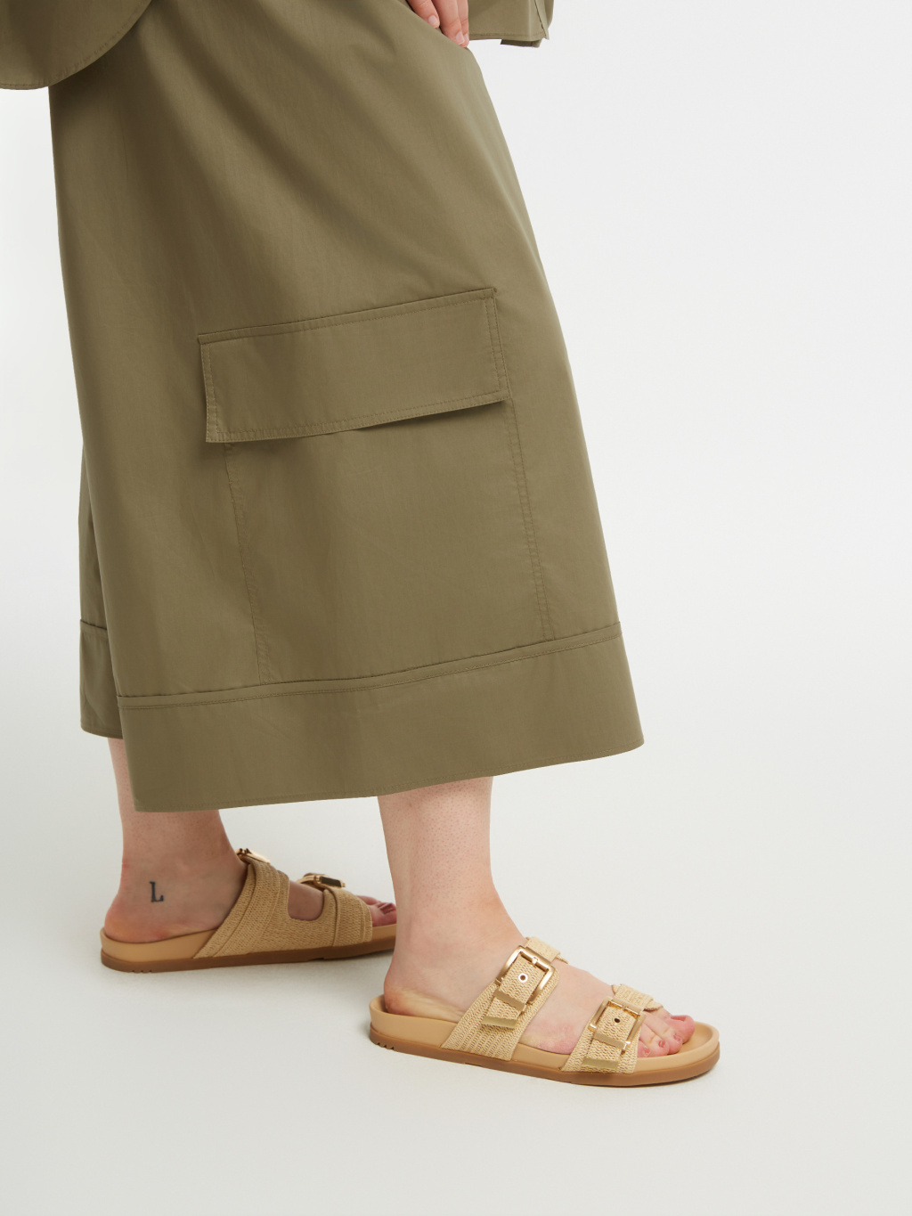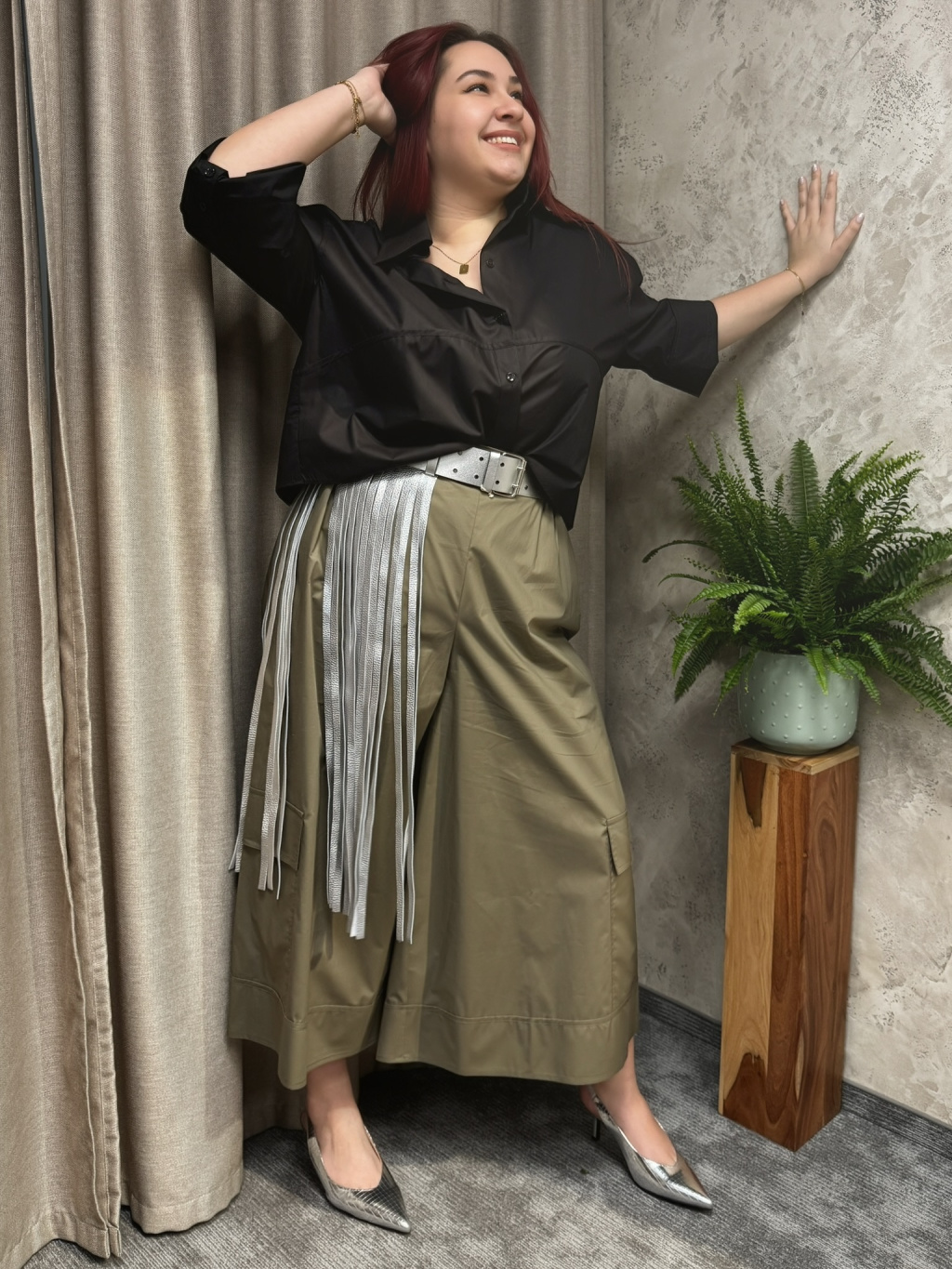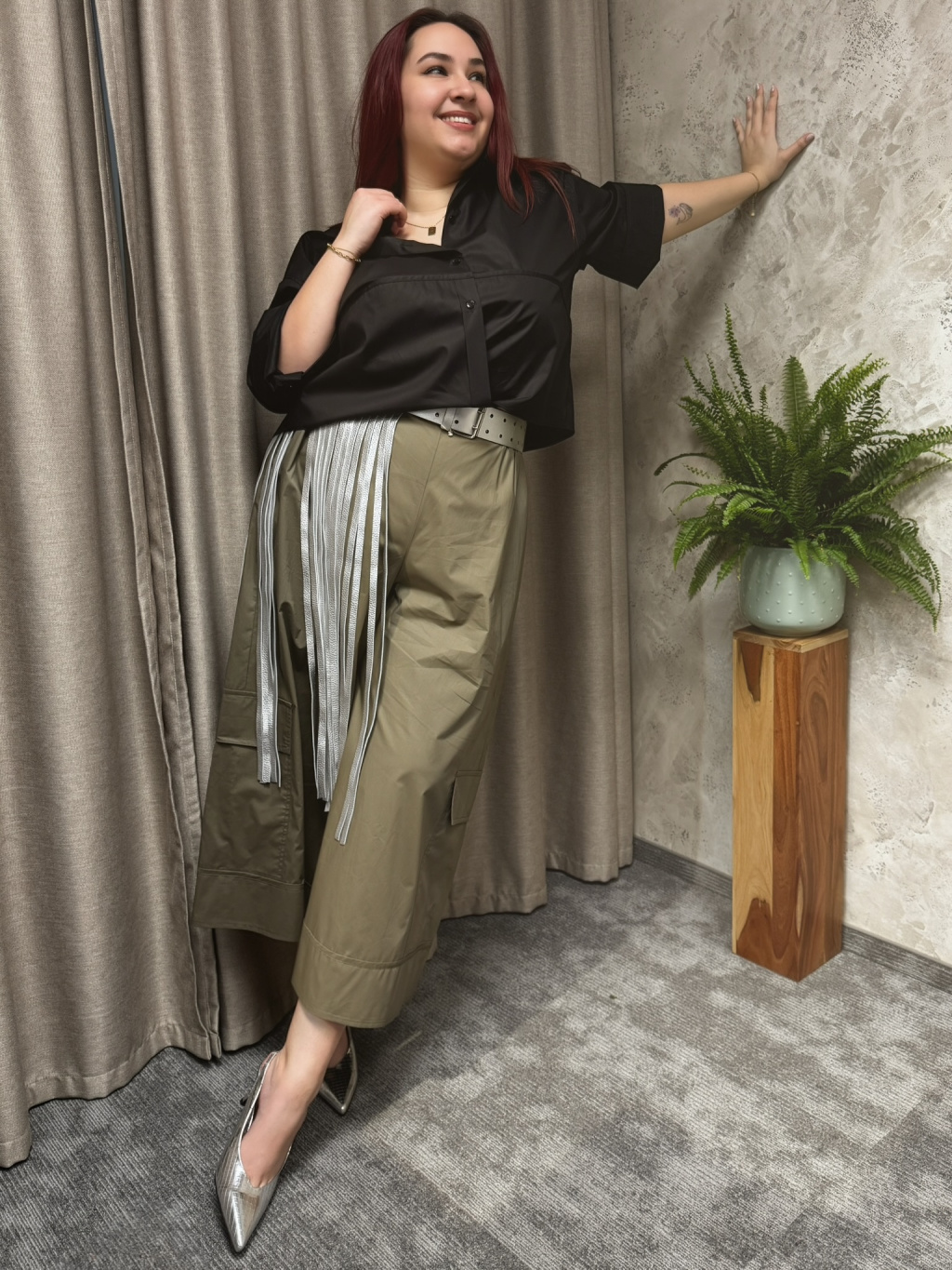 Khaki tón podtrhuje nadčasový, lehce utilitární charakter modelu, který doplňují výrazné kapsy na nohavicích. NOEMI se snadno kombinuje s kratšími košilemi, jednoduchými topy i splývavými halenkami, kde vynikne její objem a silueta. Výsledkem je moderní, uvolněný outfit, který si zachovává eleganci i praktičnost.