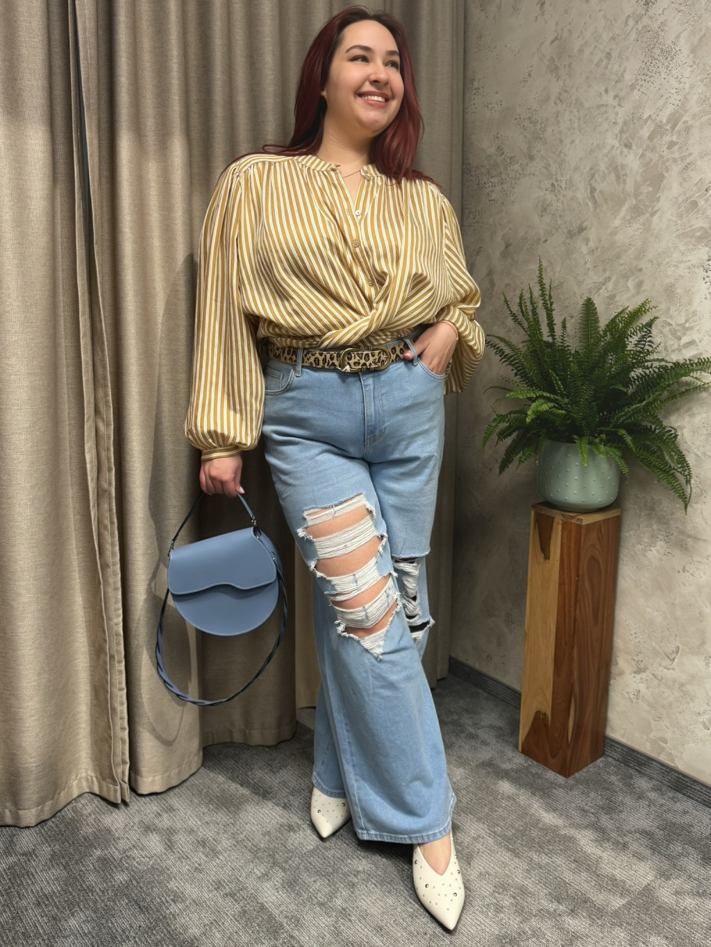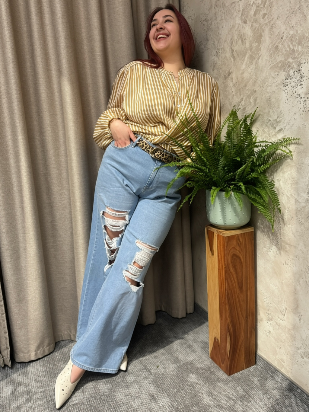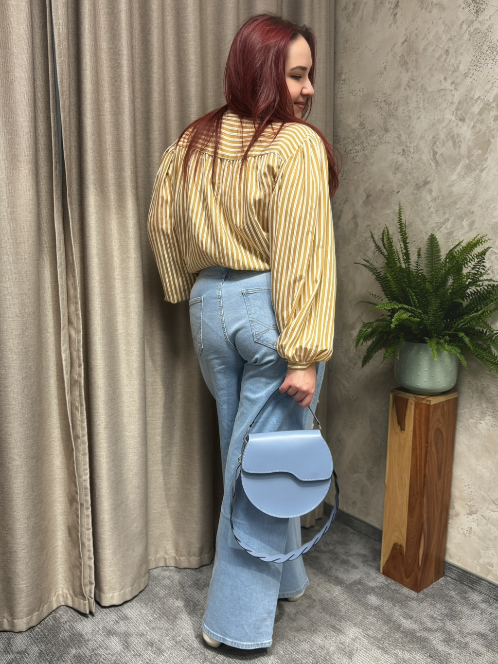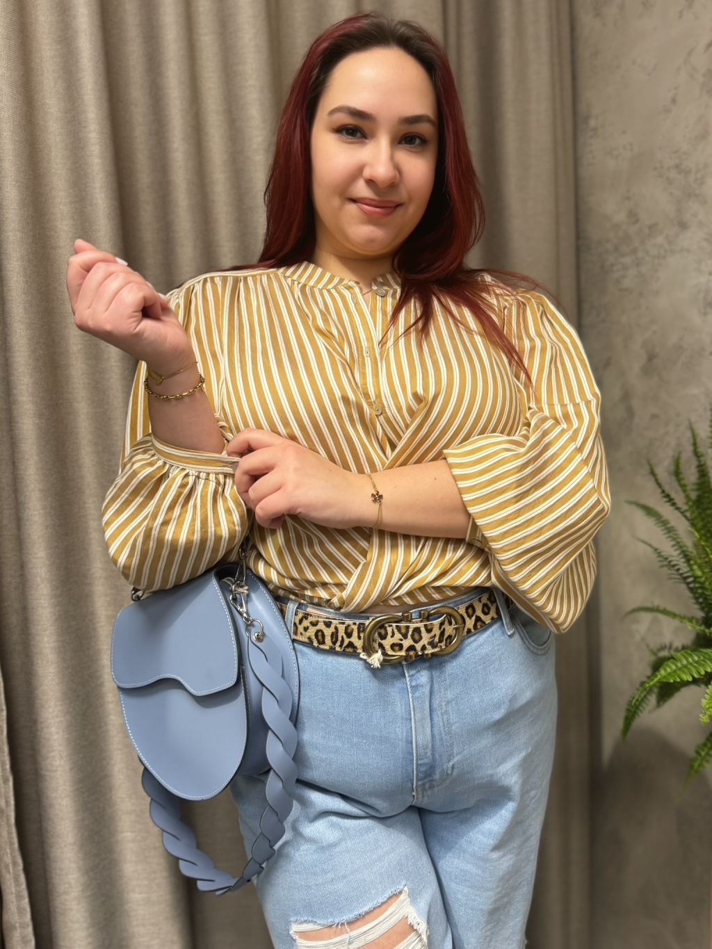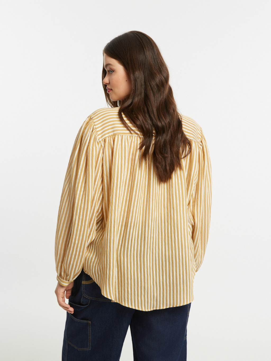 Uvolněná silueta nepůsobí těžce a díky jemné splývavosti lichotí postavě bez zbytečného obepnutí. Karamelový odstín s proužkem působí nadčasově a snadno se kombinuje s denimem, jednobarevnými kalhotami i elegantnějšími sukněmi, kde vynikne její lehkost a struktura materiálu.