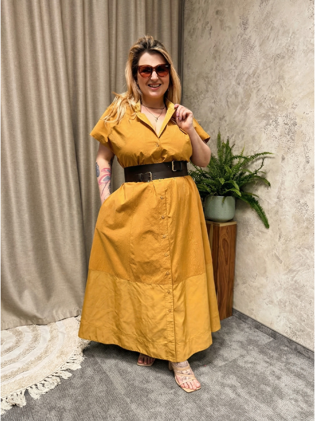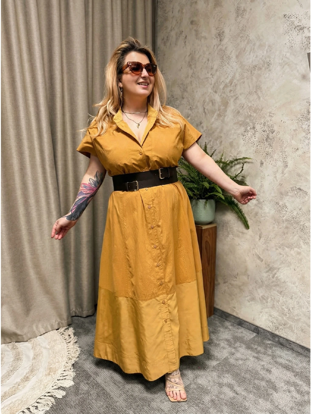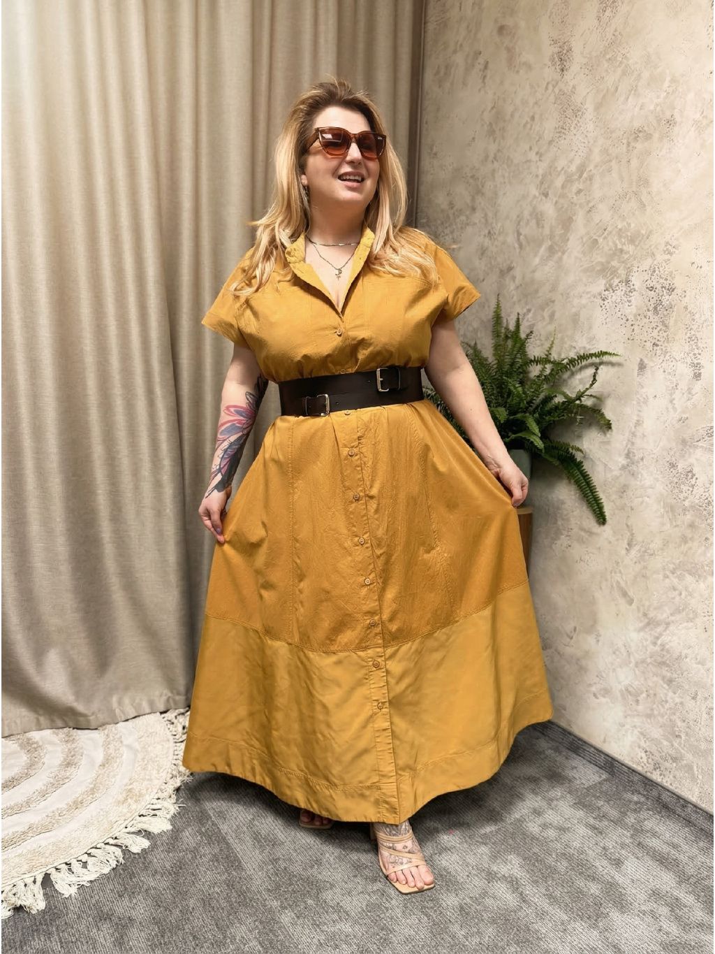 Barevné bloky v odstínech karamelu dodávají šatům moderní, safari nádech a zároveň jsou velmi lichotivé. Midi délka sahající zhruba ke kotníkům krásně kopíruje pohyb a působí chic jak s sandálky na podpatku, tak s plochými botami. Model je ideální pro plus size postavu – nestrhává pozornost na jednu partii, ale vytváří harmonickou, vyváženou siluetu.