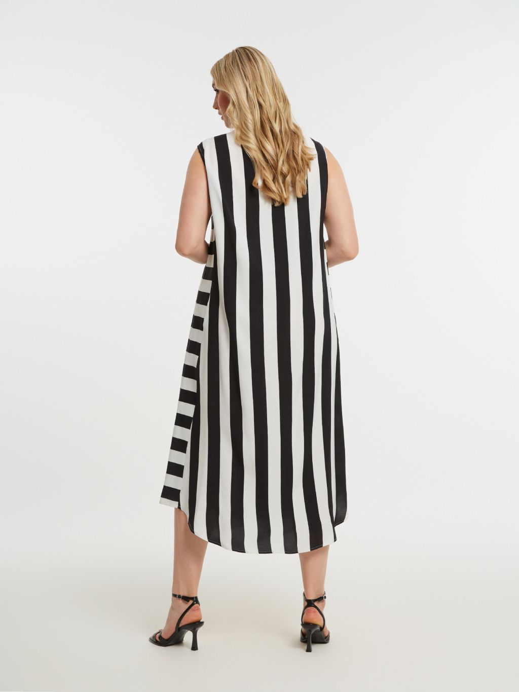 Graficky výrazné, ale dokonale jednoduché na nošení – košilové šaty STRIPES s černo‑bílými pruhy stačí obléknout a celý outfit je hotový. Volný, rovný střih bez rukávů nechává tělo volně dýchat, neobepíná bříško ani boky a přitom díky svislým pruhům krásně zeštíhluje a prodlužuje postavu.
