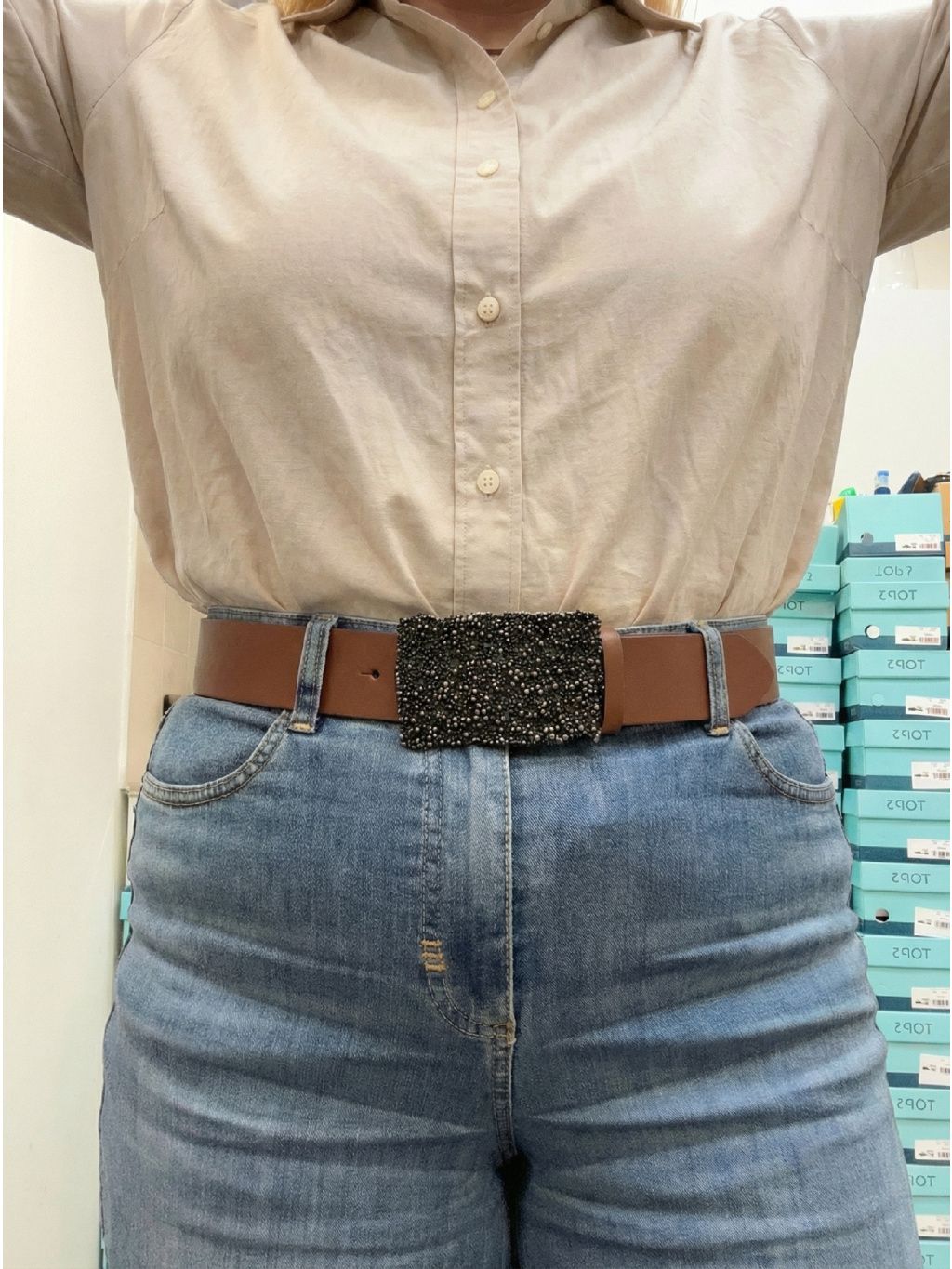 💎 Výrazná obdélníková spona s bohatým zdobením – šperkový efekt, který z pásku dělá hlavní akcent outfitu