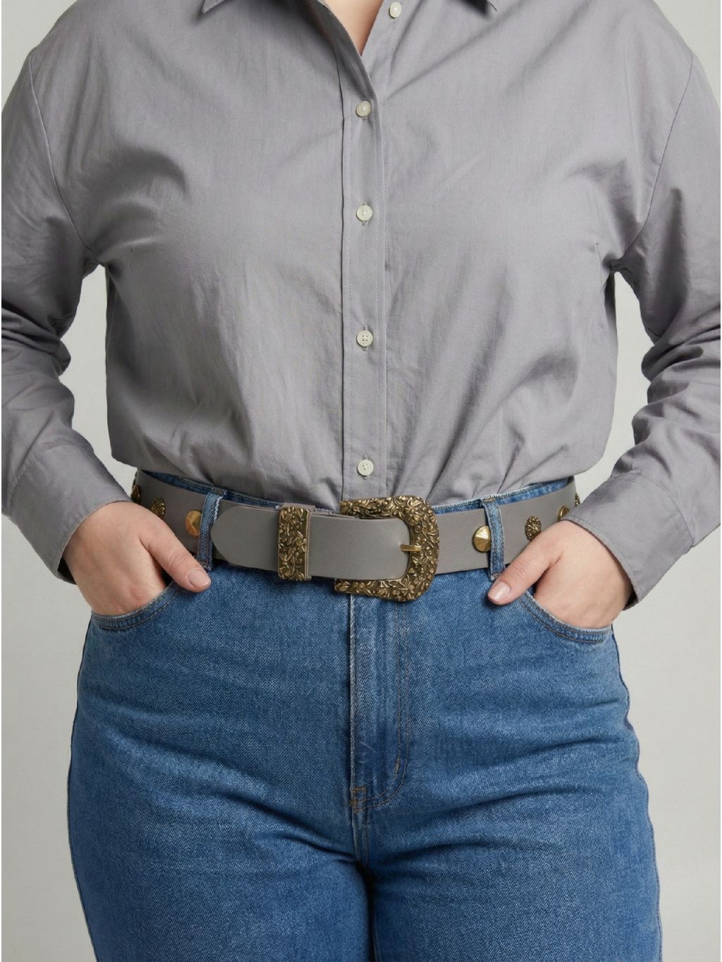 Charakter, který drží celý outfit pohromadě – kožený pásek Lina od Vice Versa zvýrazní pas, dodá tvar plus size křivkám a zároveň působí jako šperk. Výrazná, zdobná spona a dekorativní prvky po délce pásku okamžitě přitáhnou pozornost k linii pasu a promění i jednoduché džíny s košilí v promyšlený, stylový look.