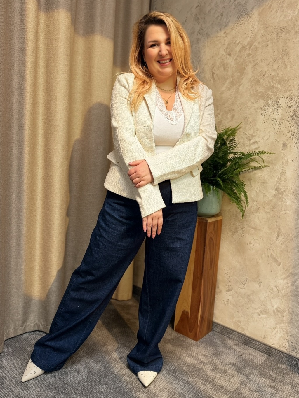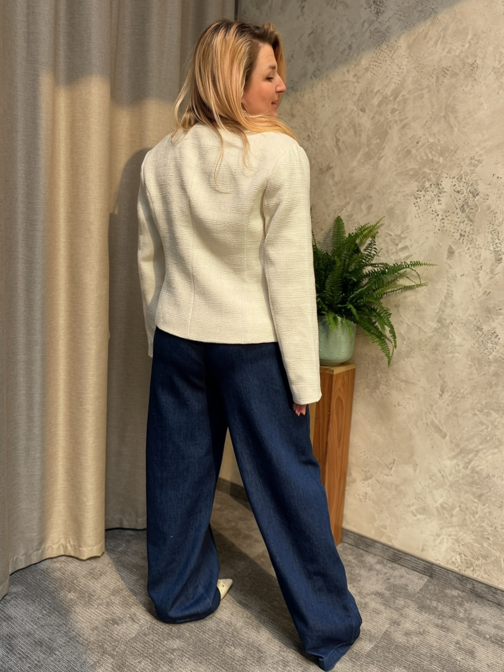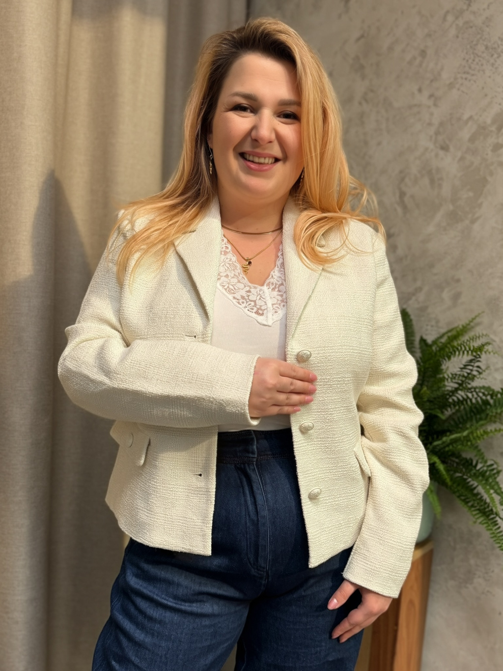Sako Jaxanja zaujme elegantní strukturou bouclé materiálu, která dodává modelu sofistikovaný a nadčasový vzhled. Krémový odstín působí velmi jemně a snadno se kombinuje s denimem, kalhotami i šaty, takže ho využijete při mnoha příležitostech. Lehce projmutý střih krásně zvýrazňuje siluetu a zároveň zůstává pohodlný při celodenním nošení. Design doplňují decentní knoflíky a čisté linie, které podtrhují jeho elegantní charakter. Sako Jaxanja je ideální volbou pro ženy, které hledají stylový kousek spojující ženskost, eleganci a moderní jednoduchost.