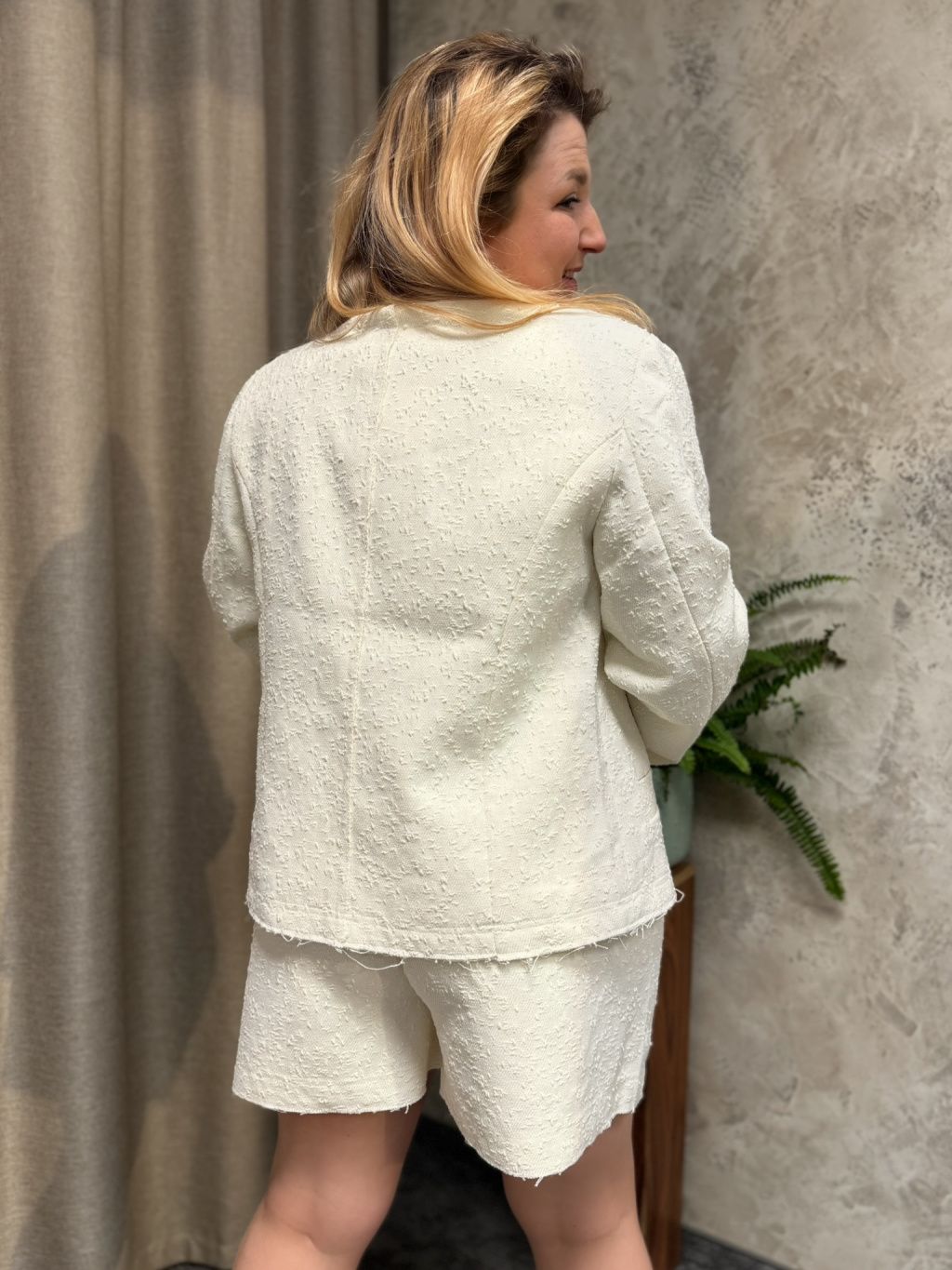 Jemná bouclé struktura, krémově bílý odstín a čistá silueta bez límce – sako z bouclé Lena od Sofie Schnoor je elegantní kousek, který snadno promění jednoduchý outfit v promyšlený look. Měkký materiál příjemně sedí, rovný střih lichotí postavě a hluboký výstřih vybízí ke hře s topy, krajkou a šperky.