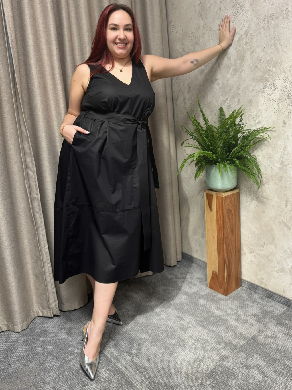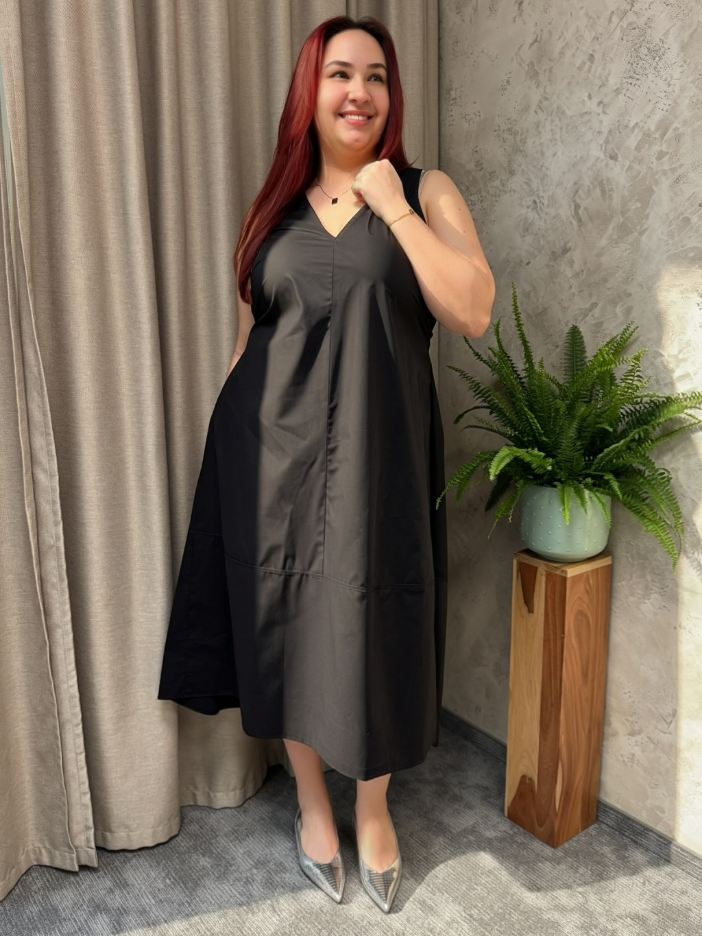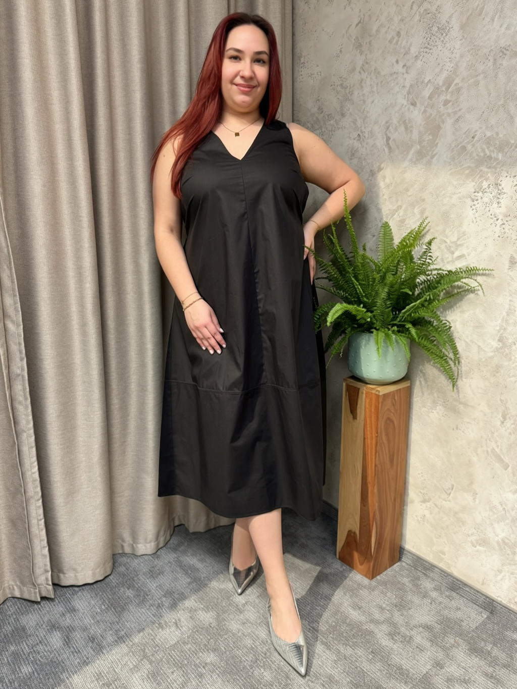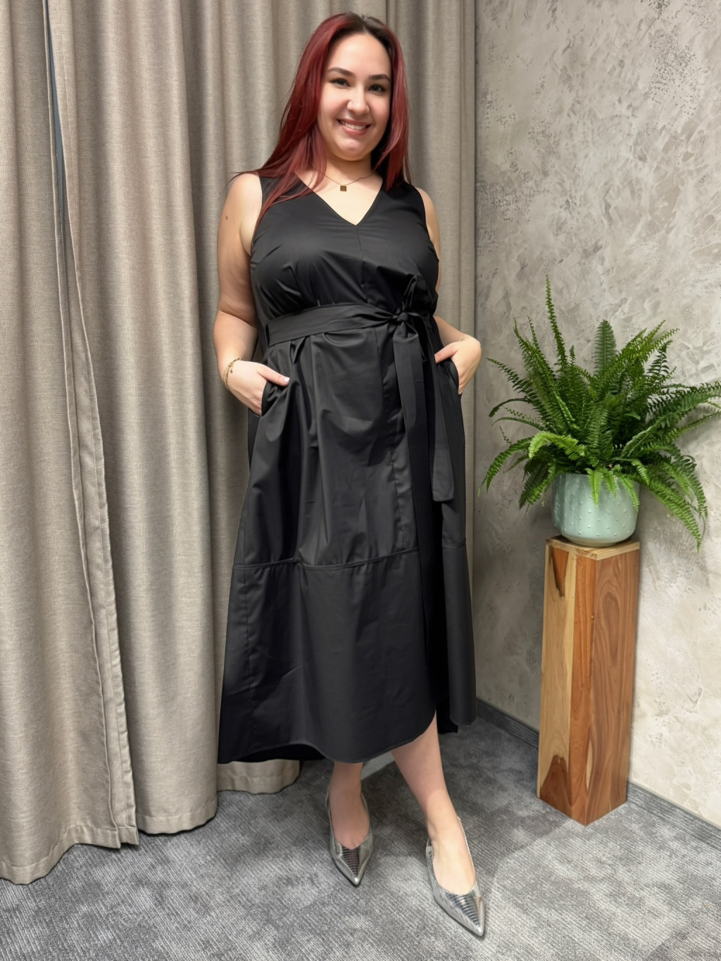 Černá verze šatů Celeste je esencí jednoduché elegance. Čistý střih s výstřihem do V vytváří lichotivou linii a nechává prostor pro vlastní styl. Díky 100% bavlně jsou šaty lehké, vzdušné a pohodlné i během teplejších dnů. Vázání v pase umožňuje model upravit podle nálady – volně splývavě nebo s jemně zvýrazněnou siluetou.