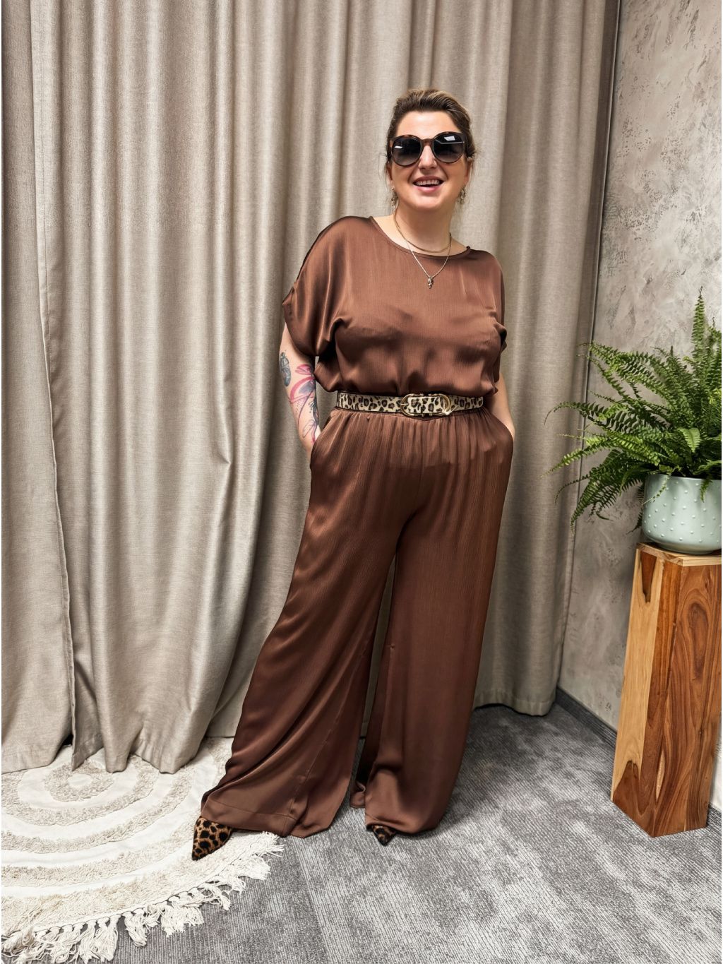 Pružný pas s gumou se přizpůsobí křivkám, nezařezává se a umožňuje nosit kalhoty jak lehce výš v pase, tak pohodlně na bocích. Jemný lesk materiálu dodává outfitu šmrnc – stačí přidat jednoduchý top nebo košili a vznikne outfit, který působí promyšleně a uhlazeně. V kompletu s ladícím topem Goa ve stejné čokoládové barvě vytvoříš efektní monochromatický look, který vypadá luxusně, ale je pohodlný jako domácí set.