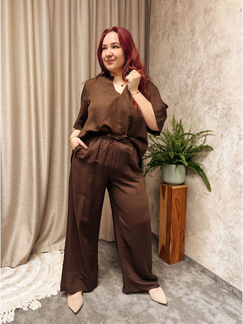 - Jako komplet: s širokými kalhotami ve stejné nebo podobné hnědé pro luxusní monochromatický look