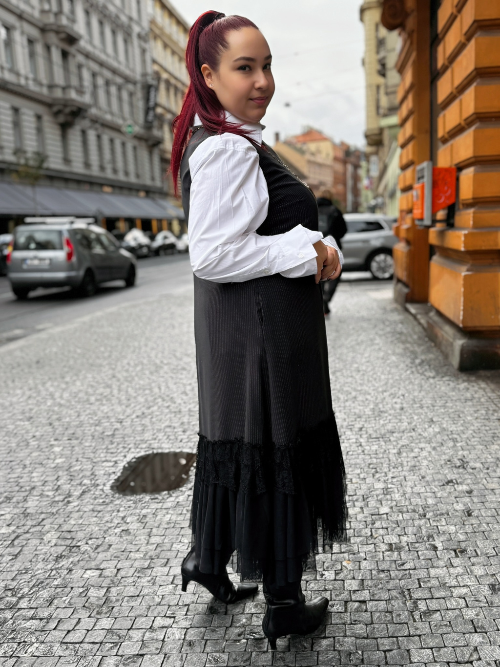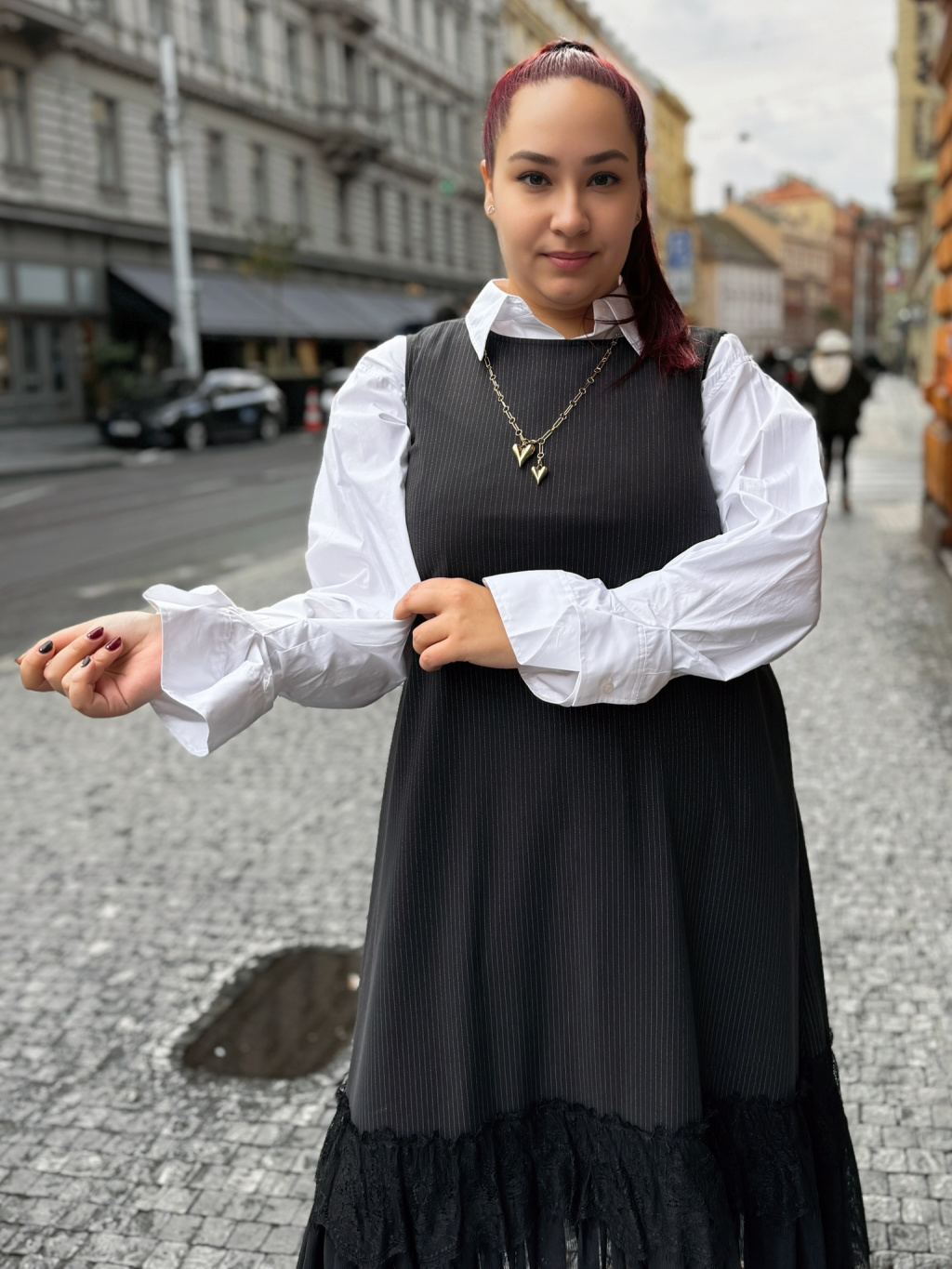 Díky střihu bez rukávů jsou šaty ideální pro vrstvení – na fotkách vidíš, jak skvěle vypadají s bílou košilí s vyšším límcem, ale stejně dobře je oblékneš i samostatně s elegantními sandálky nebo kozačkami. V chladnějších dnech se hodí i přes rolák nebo pod sako.