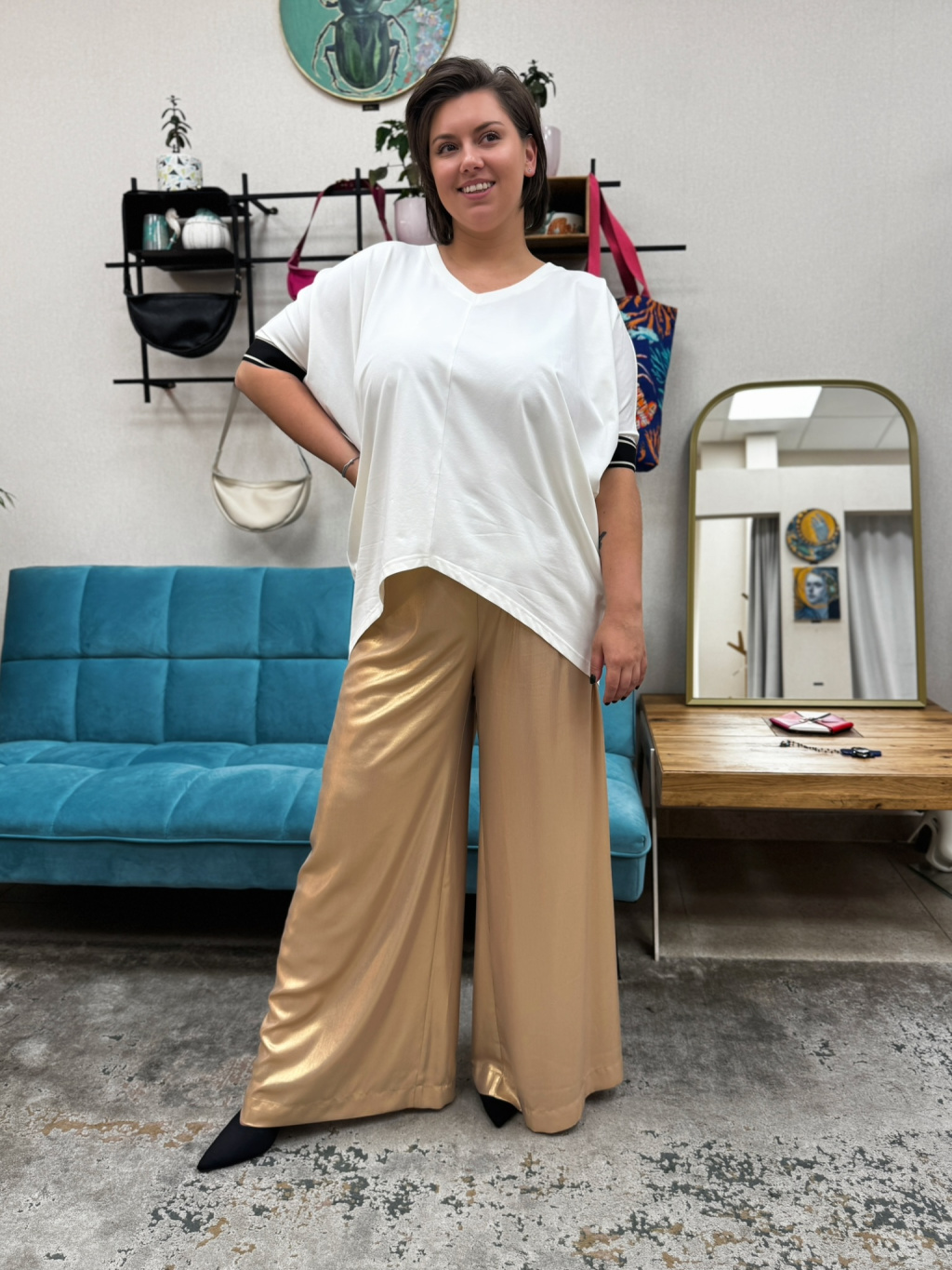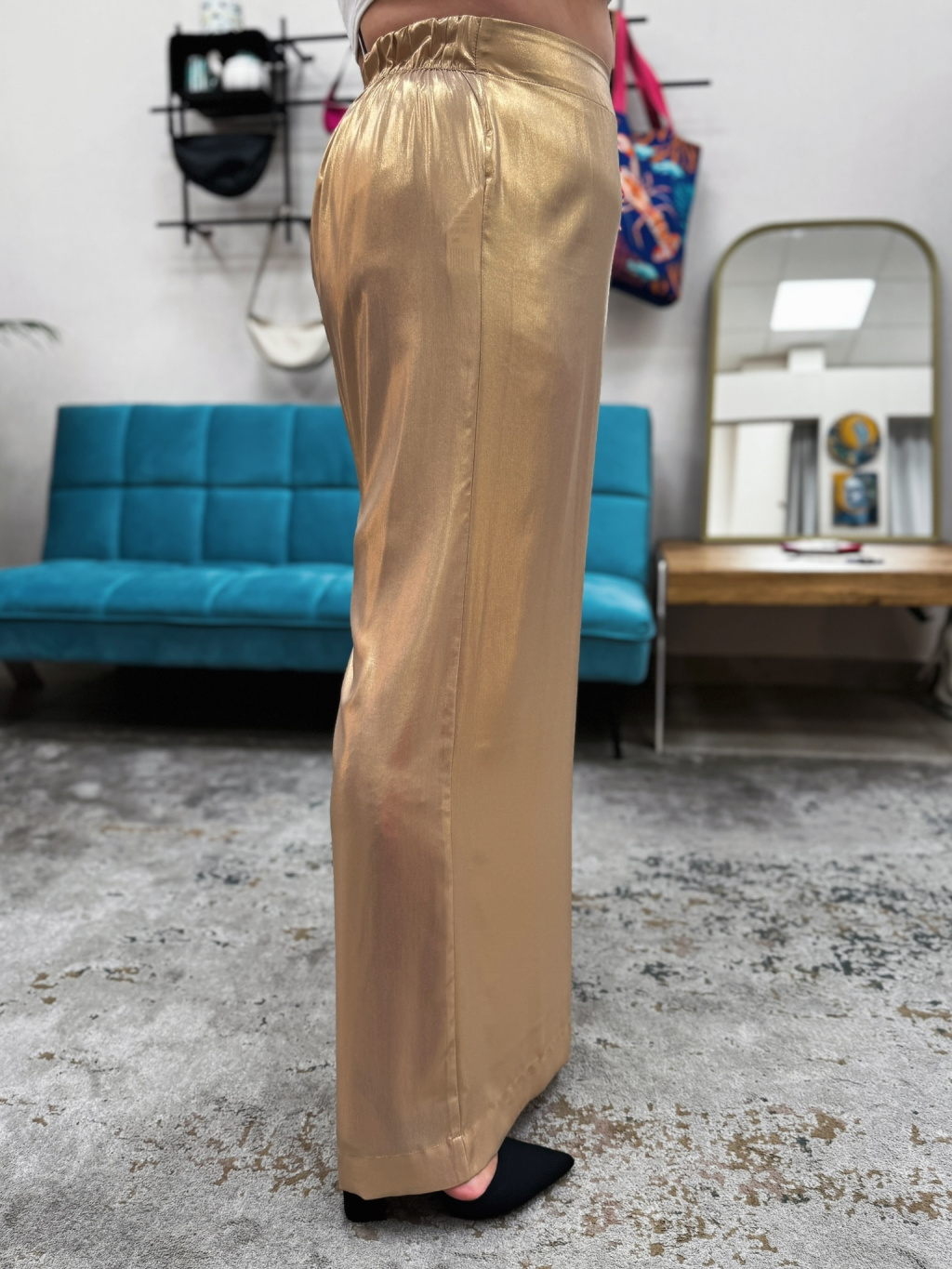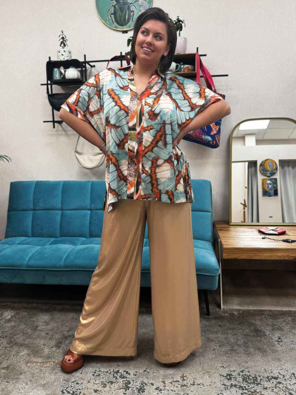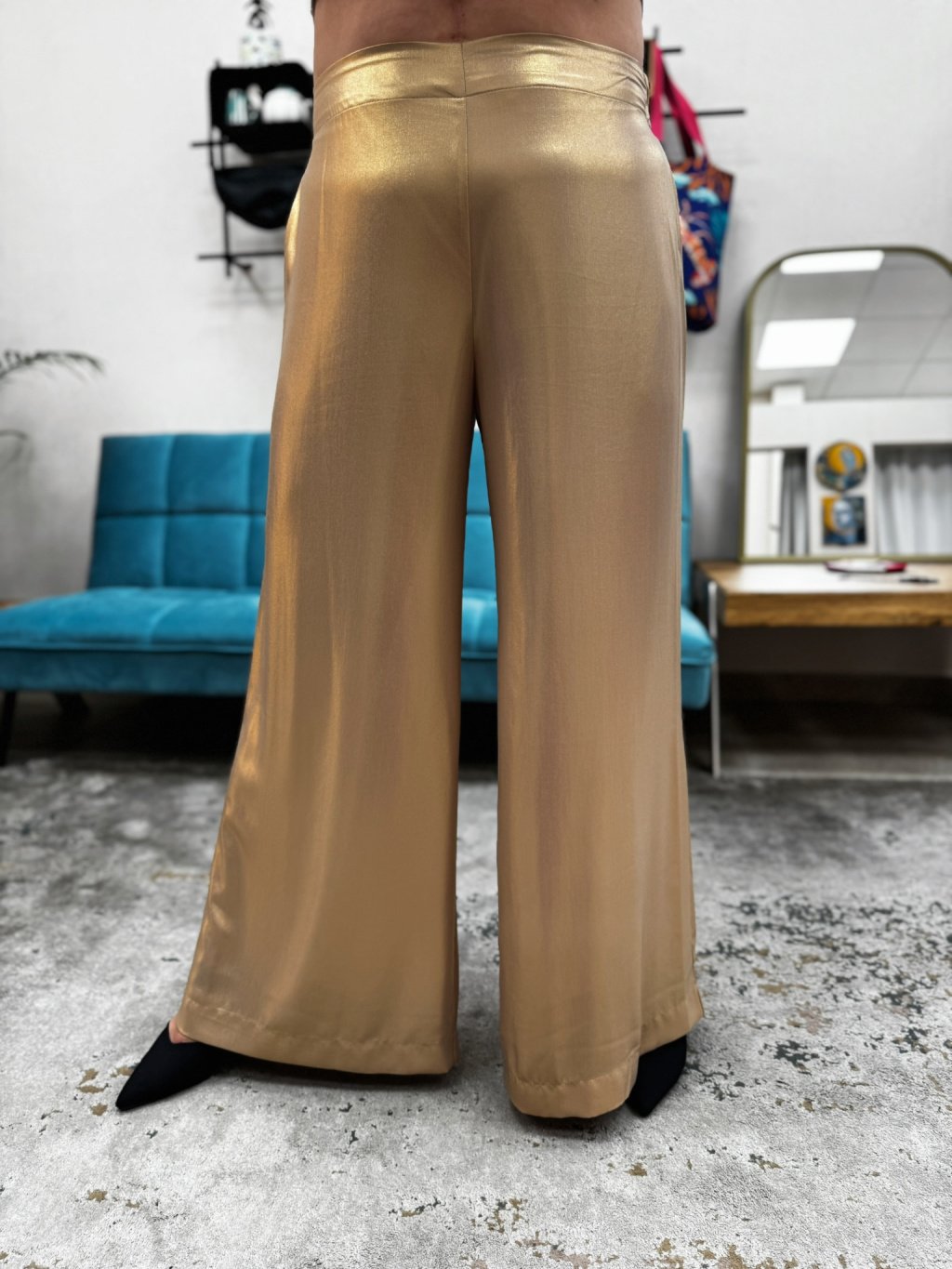 Zahalte se do lesku luxusu s těmito elegantními kalhotami flare od značky matfashion, které okouzlí jemně zlatou barvou a splývavým, chladivým materiálem, ideálním pro teplejší dny i večery.