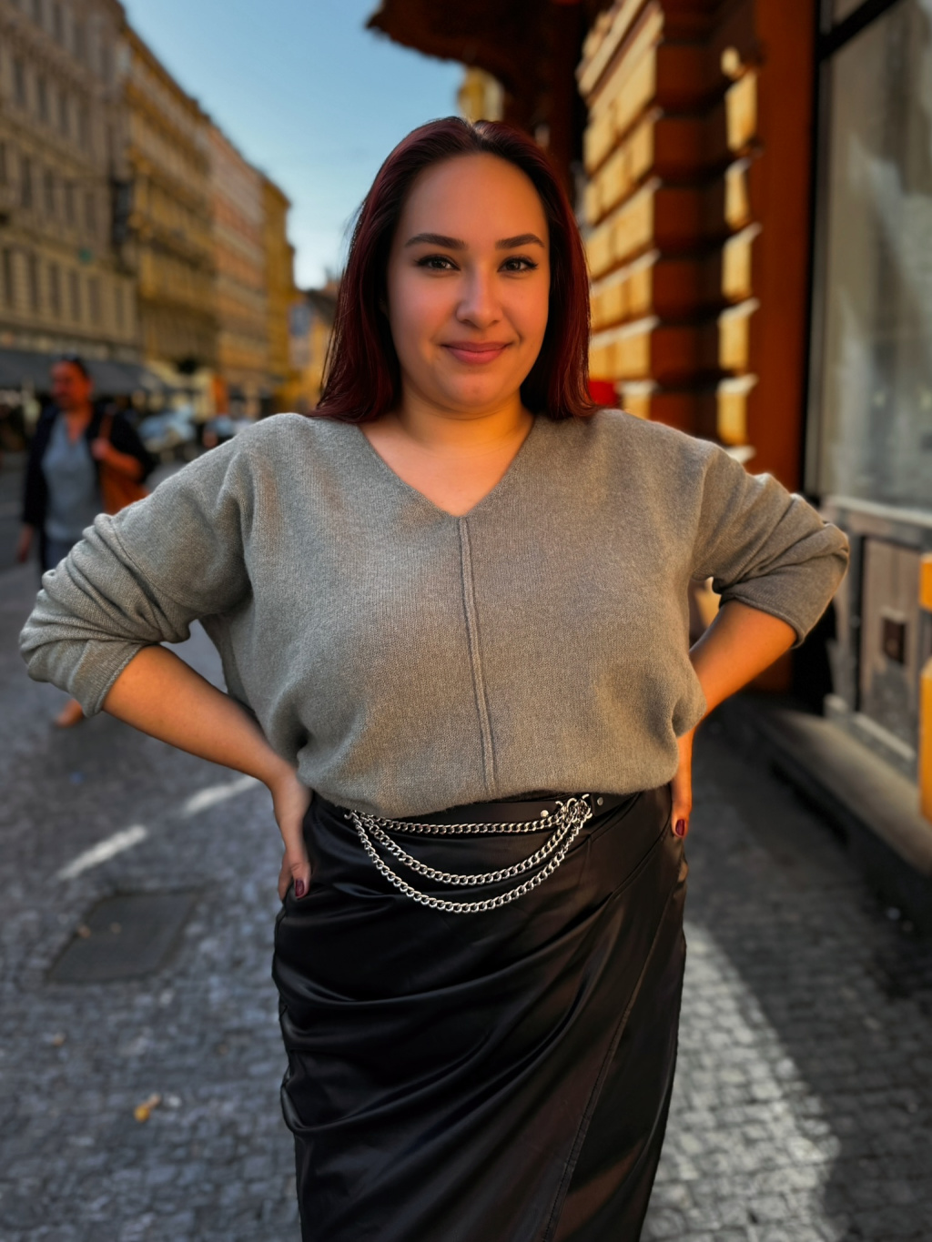 slušivý výstřih do V, který opticky prodlužuje krk a působí jemně ženským dojmem. Díky volnějšímu střihu padne na různé typy postav a dodává outfitu ležérně chic náladu.