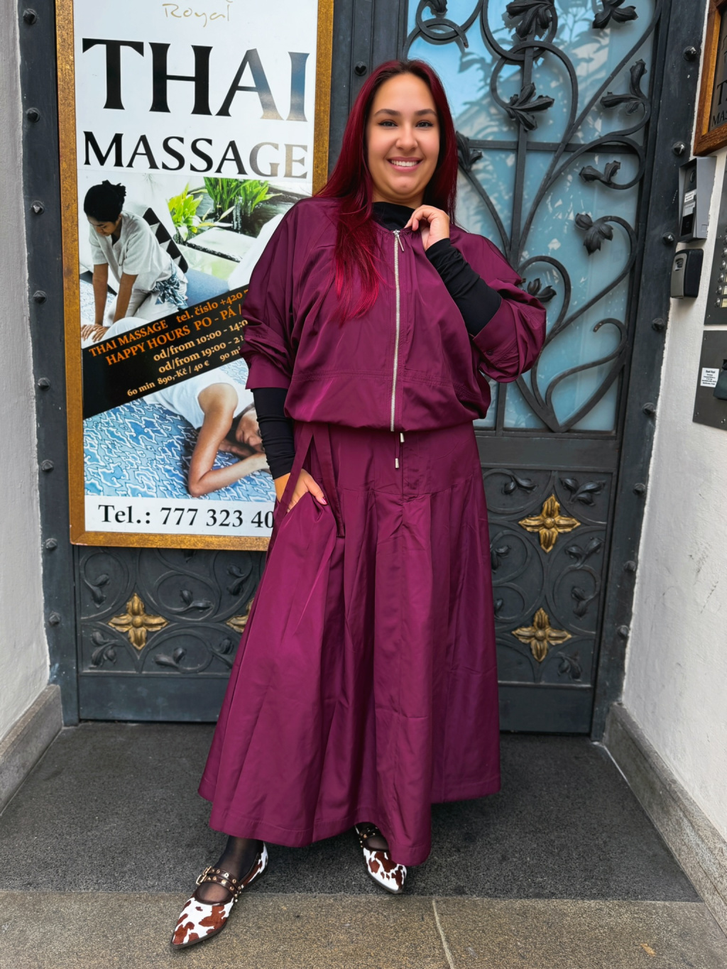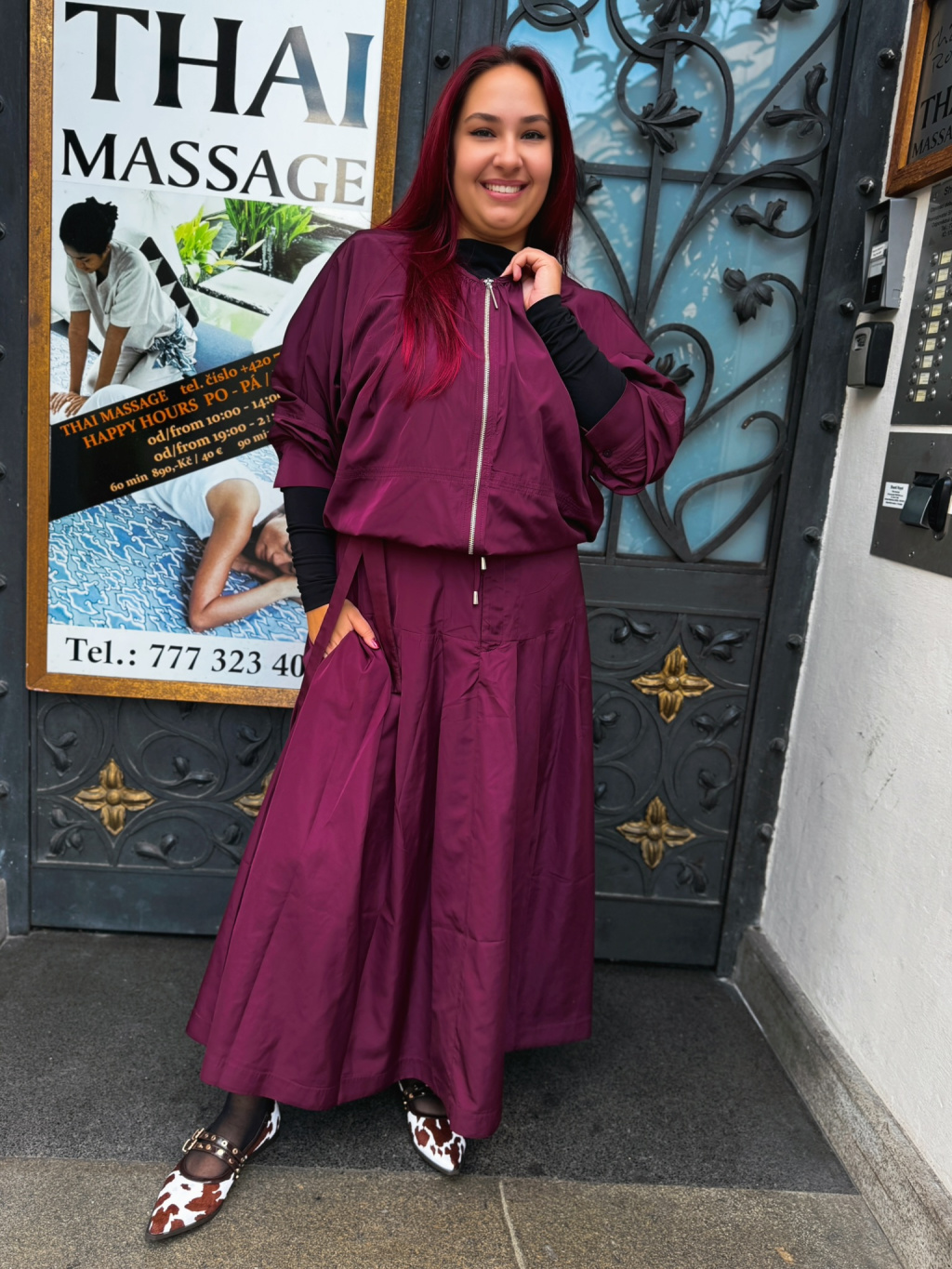 ŠUSŤÁKOVÁ SUKNĚ SE SKLADY PLUS SIZE BORDÓ
