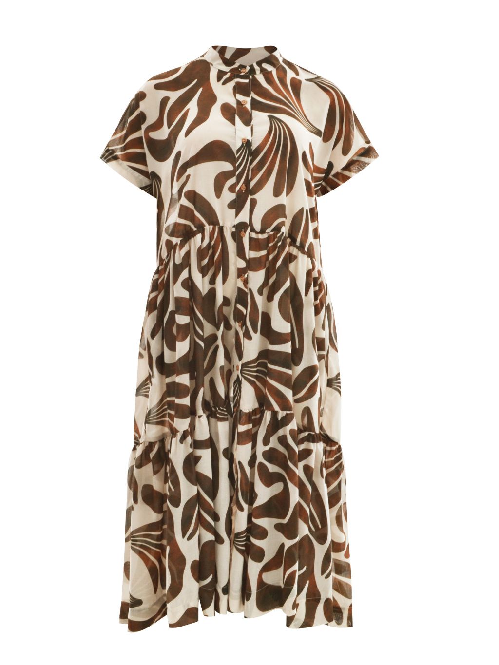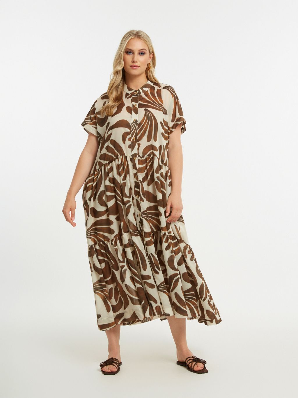 Letní bezstarostnost v luxusním printu – maxi košilové šaty ASTERI s volánkem spojují vzdušný, volný střih s uměleckým hnědo-béžovým vzorem, který působí elegantně, ale neformálně. Lehce rozšířená linie s přestřižením a volánem směrem dolů se krásně pohybuje při chůzi, neschovává tvoje já, ale jemně skryje vše, co nechceš řešit.