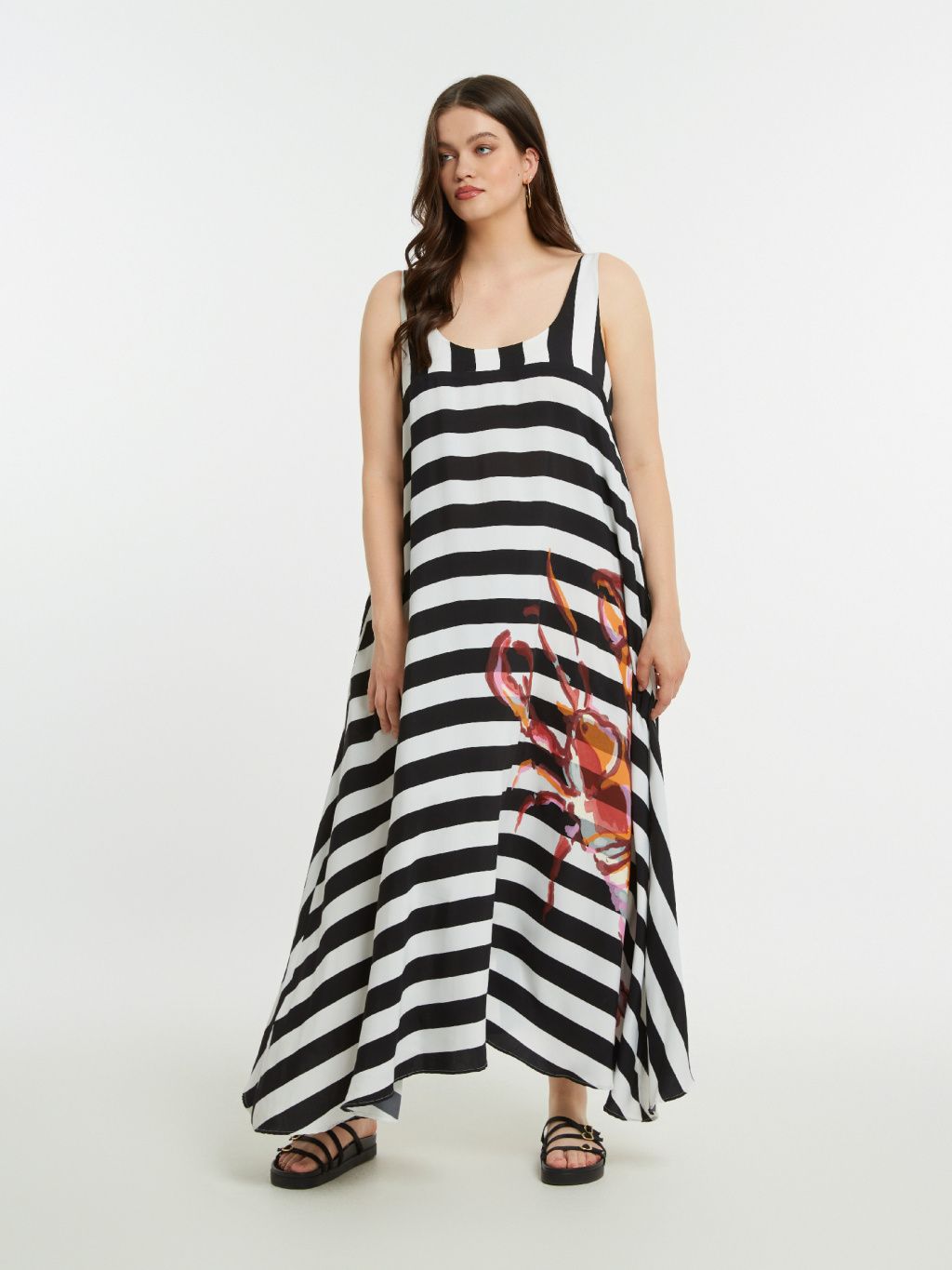 Maxi šaty, ve kterých se každým krokem rozlije vlna elegance – model NEVE na ramínka kombinuje výrazné černo‑bílé pruhy s originálním motivem humra, který dodává celku hravý, letně sofistikovaný nádech. Volný, splývavý áčkový střih z lehké viskózy se nádherně pohybuje kolem postavy, nikde netáhne a v horku příjemně chladí, zatímco hlubší kulatý výstřih na zádech působí smyslně, ale stále vkusně.