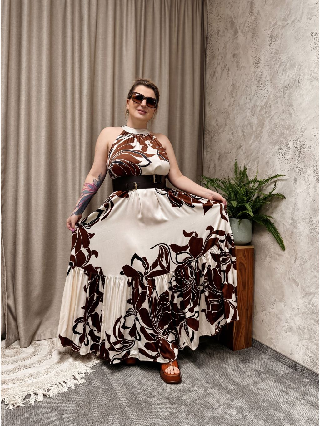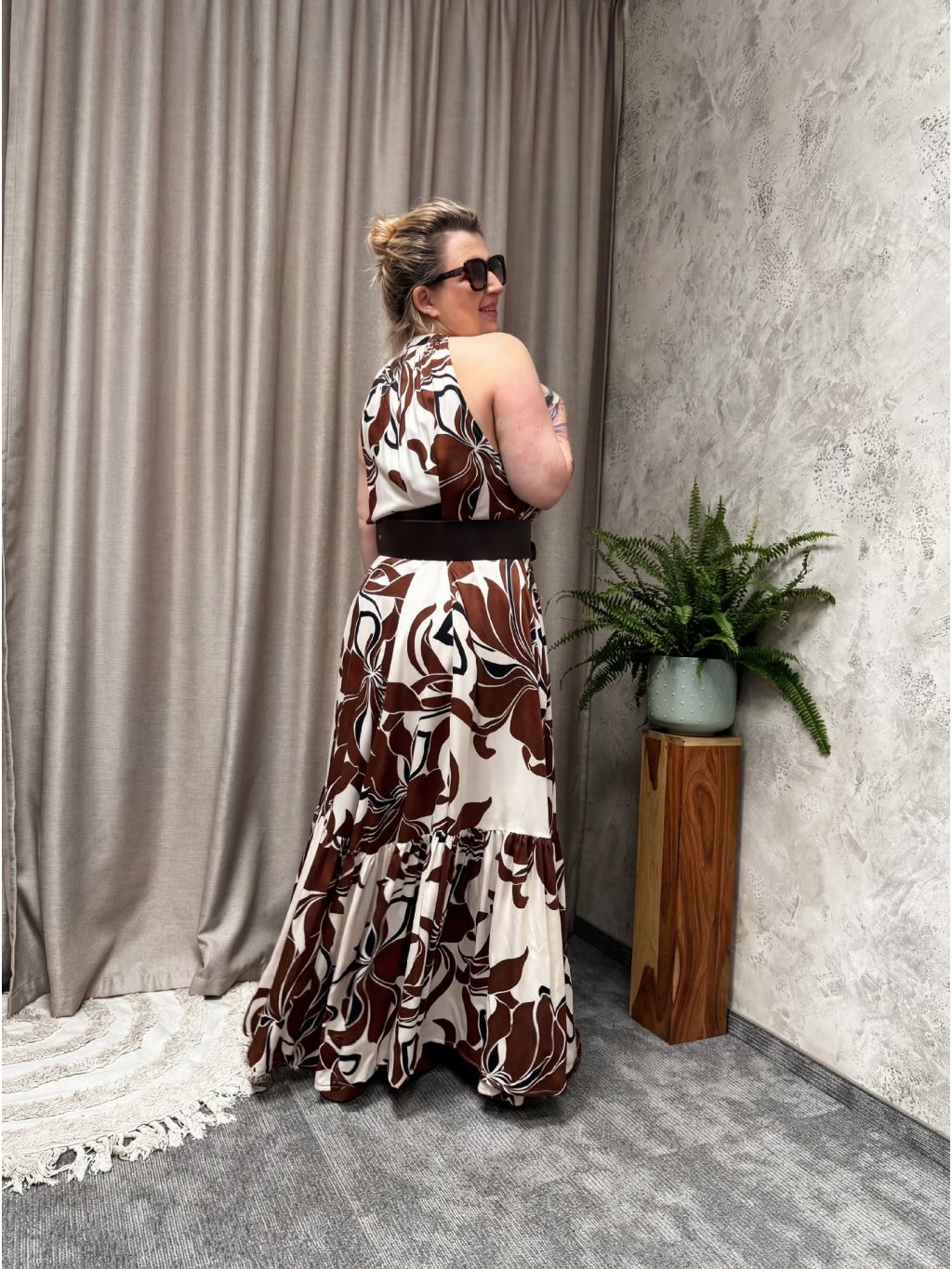 Výrazný květinový potisk v tónech hnědé a krémové funguje jako šperk sám o sobě – nepotřebuješ složité doplňky, stačí sandálky a kabelku. Spodní široký volán dodává šatům pohyb a boho náladu, která vypadá skvěle jak v plné, nespoutané šíři, tak stažená páskem do ženské siluety. V pase je můžeš dotáhnout širokým páskem a vytvořit tak „wow efekt“ se zvýrazněným pasem, nebo je nechat volně padat pro absolutní pohodlí.