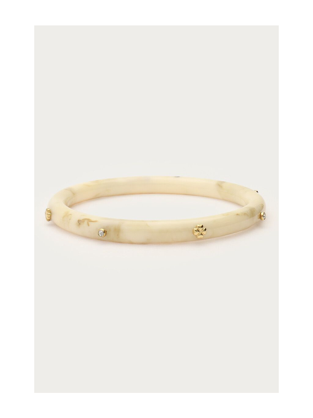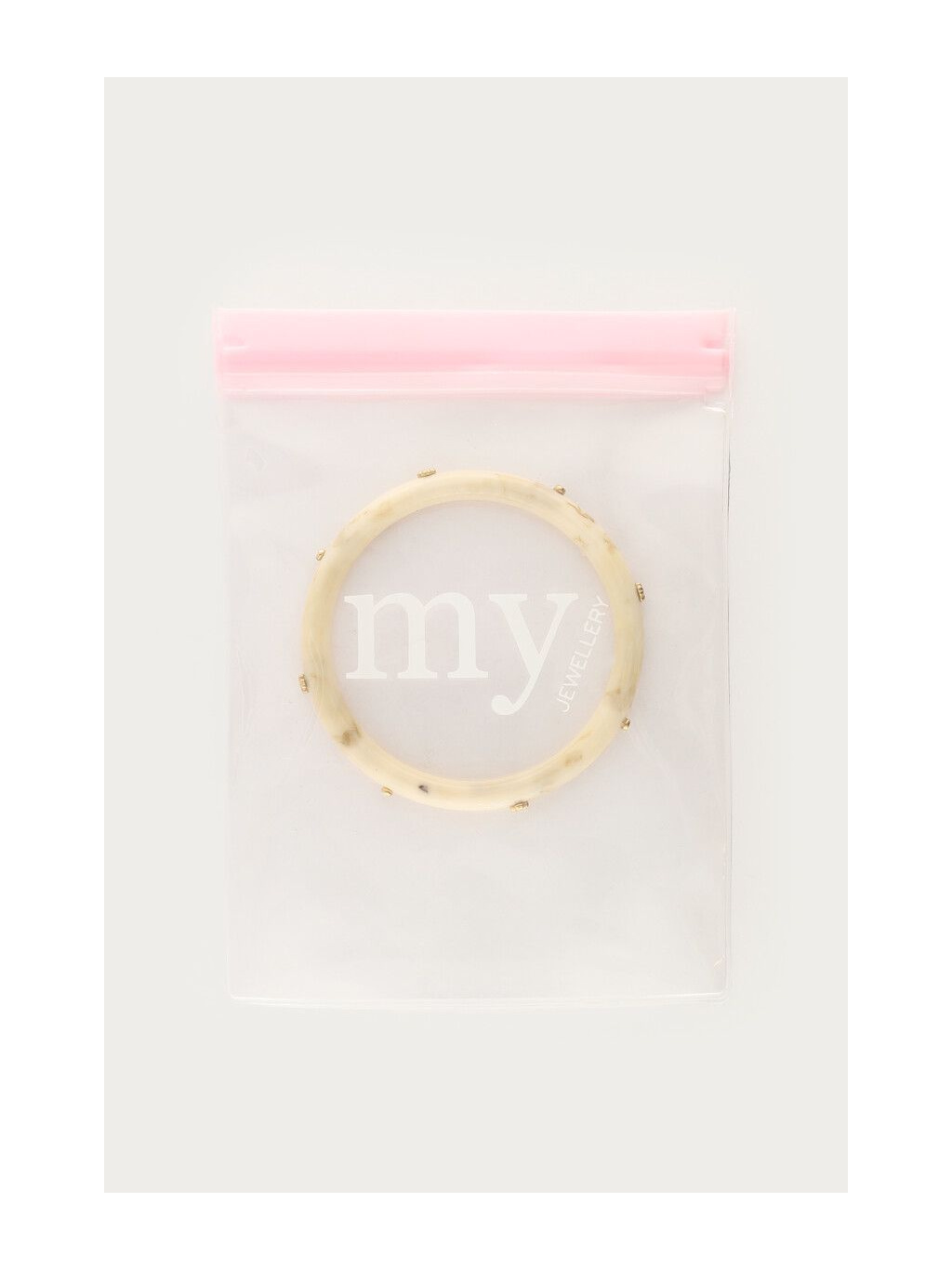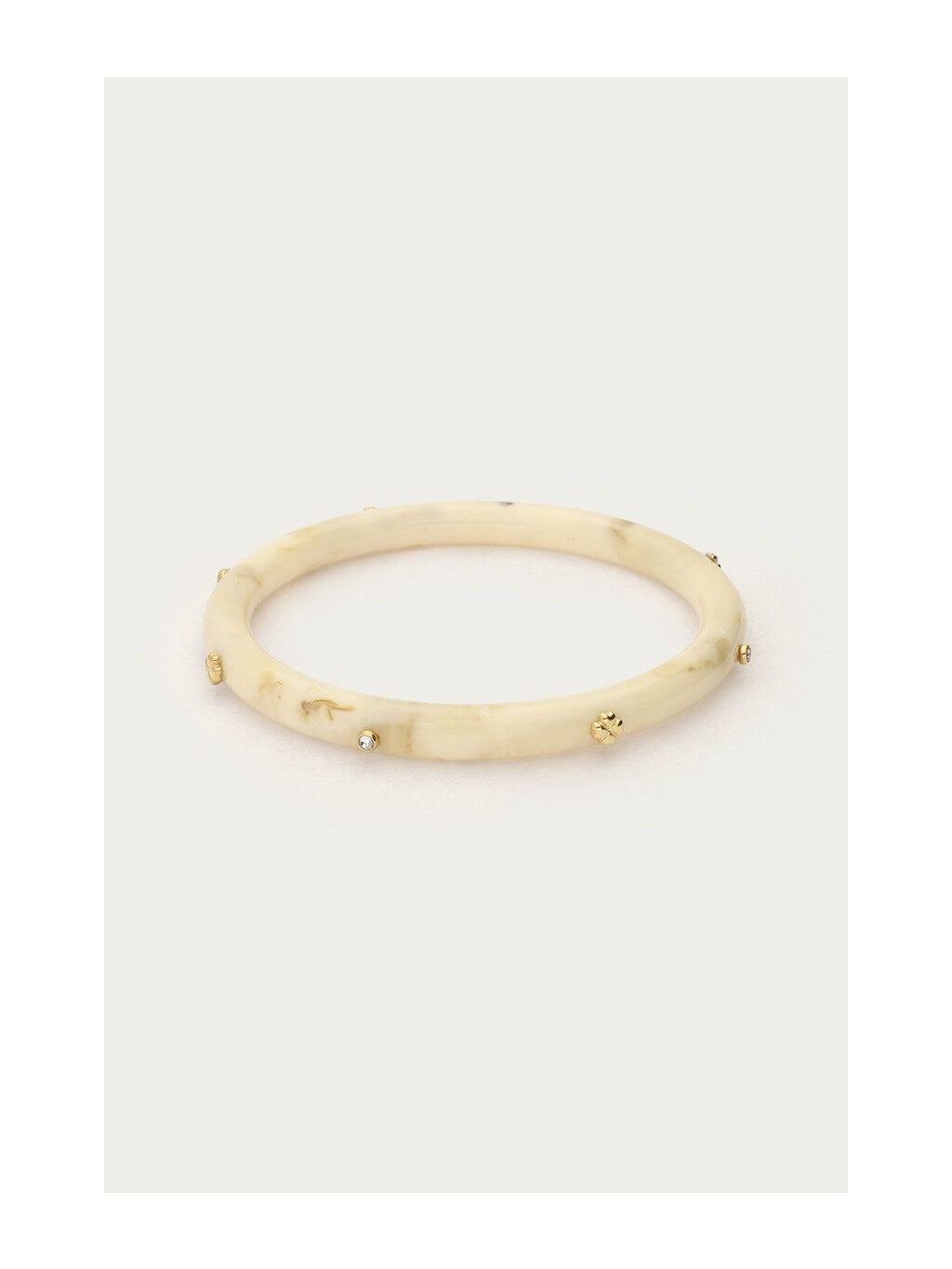 Elegantní náramek Ivory Shine vyniká svou krémově bílou barvou s jemným mramorováním, která působí luxusně a zároveň přirozeně. Drobné zlaté aplikace a krystalky dodávají náramku decentní třpyt a podtrhují jeho sofistikovaný vzhled.