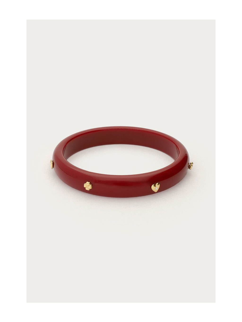 Stylový náramek Ruby Heart v hlubokém rubínově červeném odstínu okamžitě upoutá pozornost svým elegantním leskem a detaily v podobě zlatých aplikací ve tvaru srdce a kvítku. Je ideálním doplňkem pro ženy, které chtějí dodat svému outfitu šmrnc a jemnou dávku romantiky.