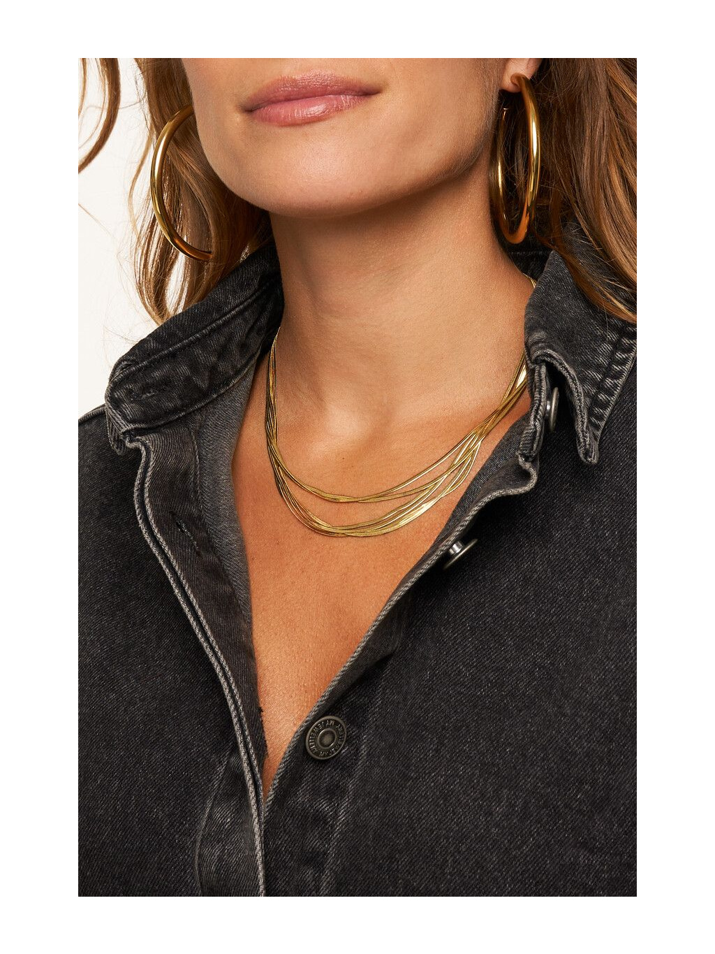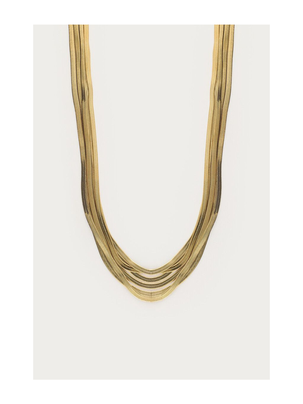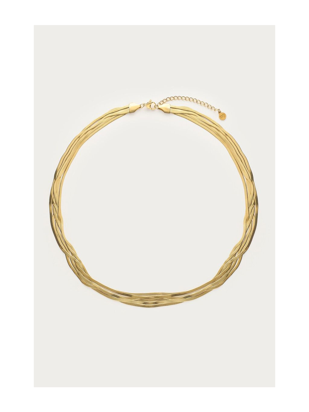 Náhrdelník Twist Layers je stylový kousek, který na první pohled zaujme vícero propojenými linkami v bronzově-zlatém tónu. Díky svému vrstvenému a lehce splývavému designu působí sofistikovaně, přesto velmi moderně – skvěle se hodí k jednoduchým outfitům i k výrazným šatům.
