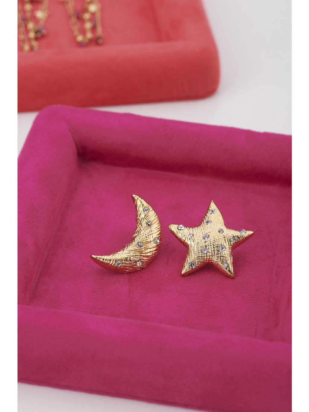 Hravý a elegantní pár, který si zamilujete na první pohled. Tyto asymetrické náušnice ve tvaru hvězdy a půlměsíce dodají vašemu outfitu originální nádech a jemný večerní třpyt. Každý kus je zdobený jemně broušenými krystaly, které krásně odrážejí světlo a zvýrazňují texturovaný zlatý povrch.