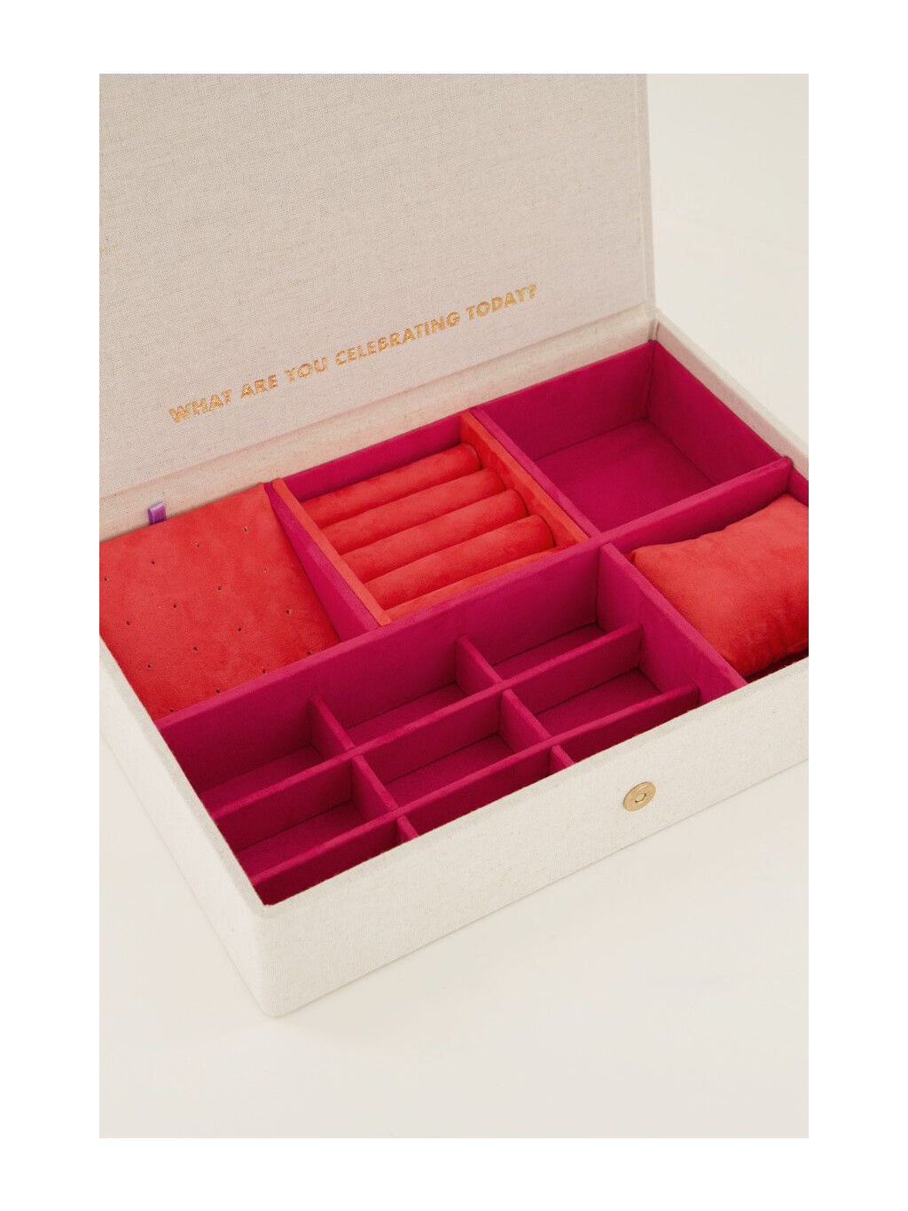 Vyrobena z kvalitního polyesteru, který šperkovnici dodává jemný vzhled a zároveň chrání tvé poklady. Uvnitř najdeš 5 přihrádek, které si můžeš uspořádat přesně podle svých představ — na náušnice, prsteny, náramky i náhrdelníky. 💖