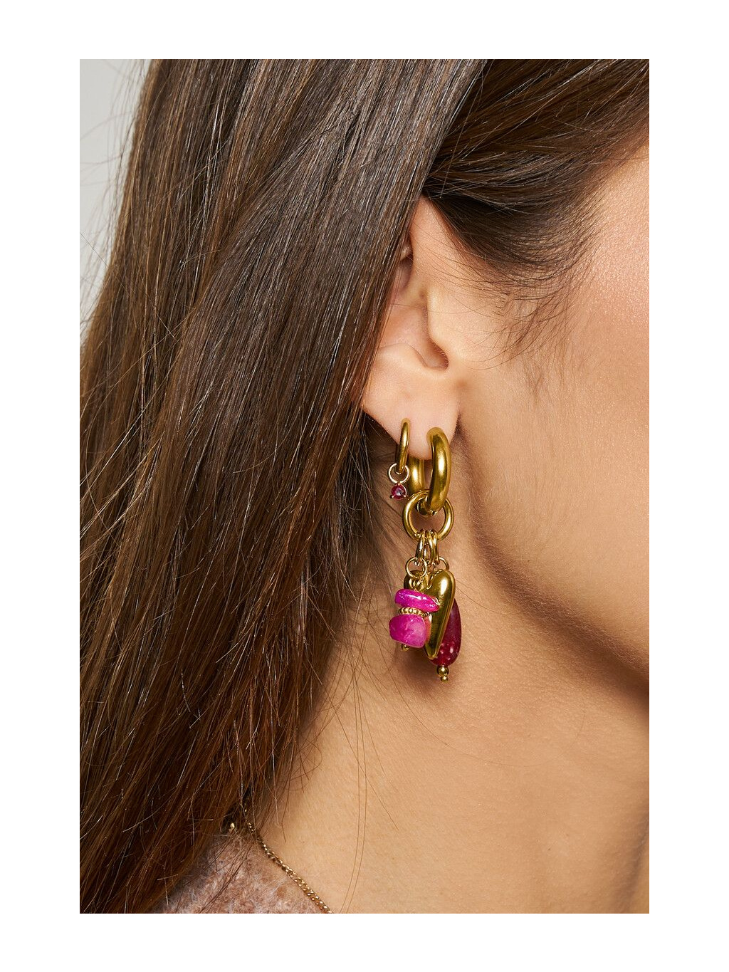 Stylové náušnice Heart & Stone jsou dokonalým spojením elegance a hravosti. Zlaté srdce doplněné o výrazné korálky v odstínech červené a růžové vytváří šperk, který okamžitě zaujme a rozzáří každý outfit.