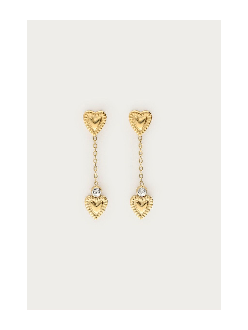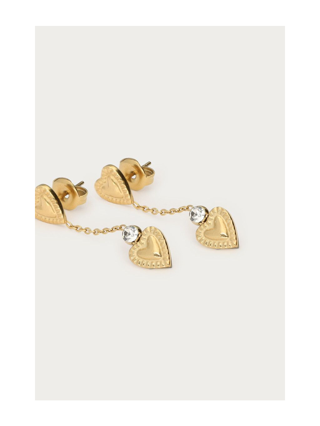 Design tvoří drobné reliéfní srdíčko u ušní dírky, na které navazuje tenký řetízek zakončený druhým srdíčkem doplněným o decentní třpytivý kamínek. Celek působí lehce, žensky a krásně se pohybuje při každém kroku.