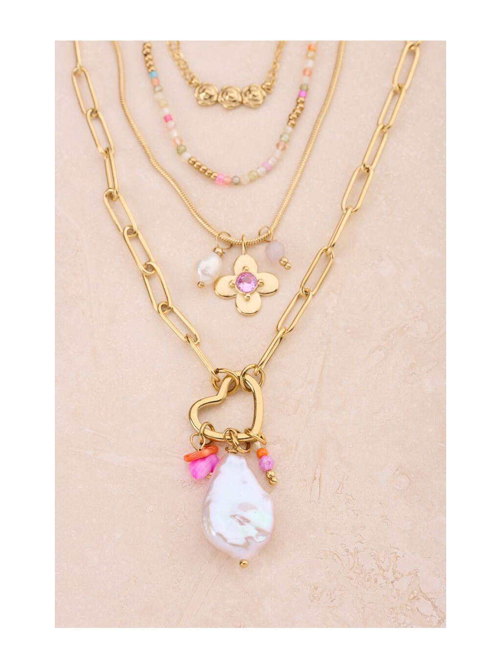Stylový zlatý náhrdelník s přívěskem ve tvaru srdce je moderním šperkem s jemně hravým charakterem. Dominantou je zlaté srdce, ze kterého visí výrazná nepravidelná perla doplněná drobnými barevnými korálky. Kombinace zlata, perly a barevných detailů vytváří originální design, který působí svěže a velmi ženským dojmem. Náhrdelník krásně vynikne při vrstvení s dalšími řetízky a dodá outfitu stylový a lehce bohémský nádech. Ideální volba pro ženy, které milují výrazné šperky s romantickým motivem a moderním designem.