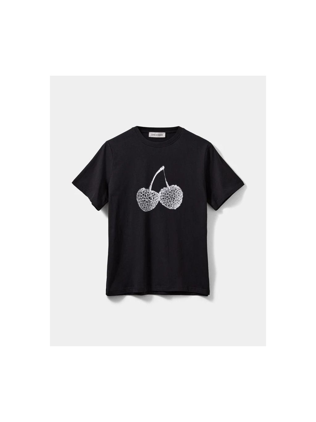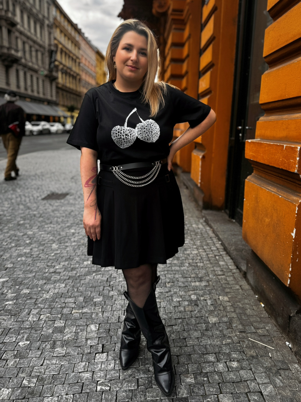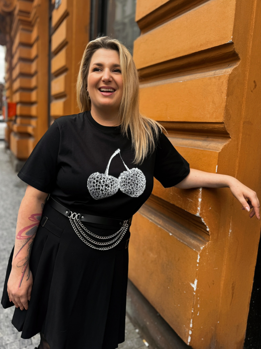 Černé tričko od značky Sofie Schnoor je kousek, který na první pohled zaujme svou jednoduchostí, ale zároveň originálním detailem. Na hrudi se vyjímá výrazný motiv třešní z kamínků, který dodává tričku hravý a sofistikovaný nádech. Díky volnějšímu střihu se nosí maximálně pohodlně a padne různým typům postavy. Je ušité z čisté, kvalitní bavlny, takže je příjemné na těle, prodyšné a ideální na celodenní nošení. Klasický kulatý výstřih a krátké rukávy podtrhují jeho univerzálnost – skvěle se hodí jak k džínům a teniskám pro ležérní look, tak i k elegantnějším kouskům, když chceš dodat outfitu šmrnc.