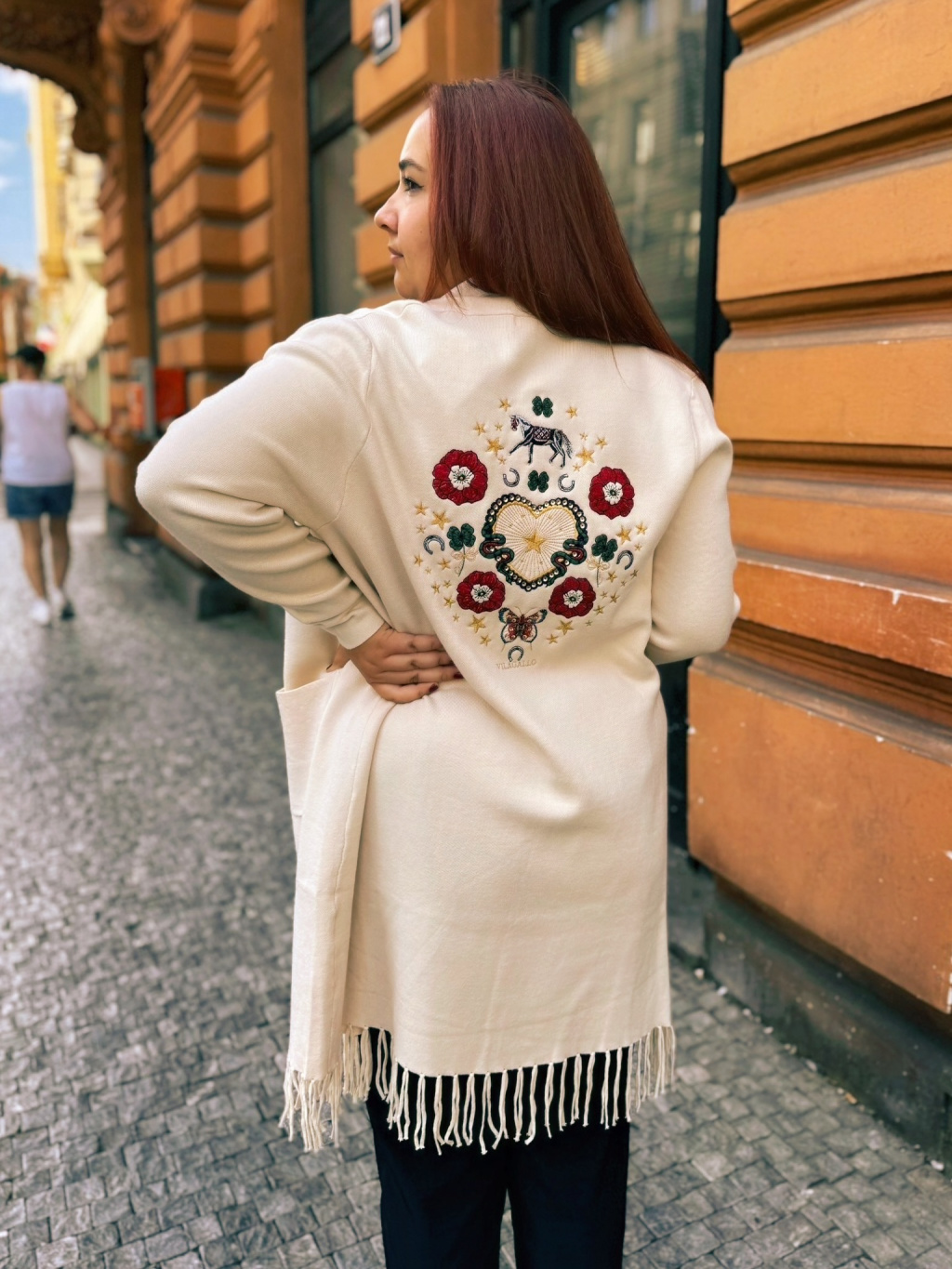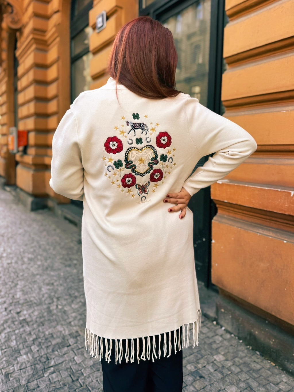 Světlý kardigan s velkolepou výšivkou s jezdeckými motivy na zádech, která působí originálně a sofistikovaně.