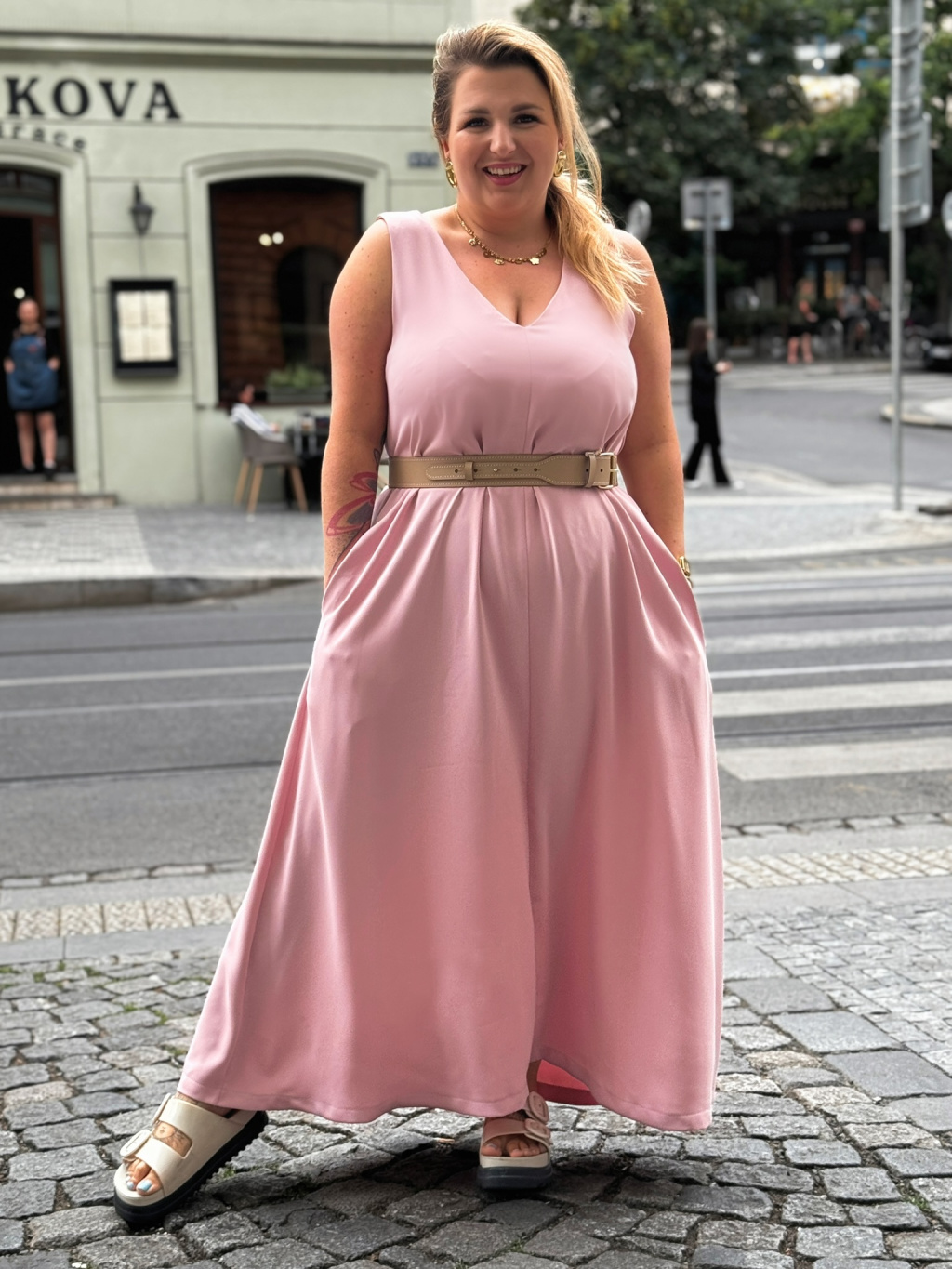 Šaty mají pohodlná široká ramínka a efektní výstřih do V – a to jak zepředu, tak zezadu, což jim dodává jemný, ale rafinovaný nádech. Zezadu jsou doplněné skrytým zipem, díky kterému krásně sedí, a nechybí ani praktické kapsy, které milujeme úplně všechny.