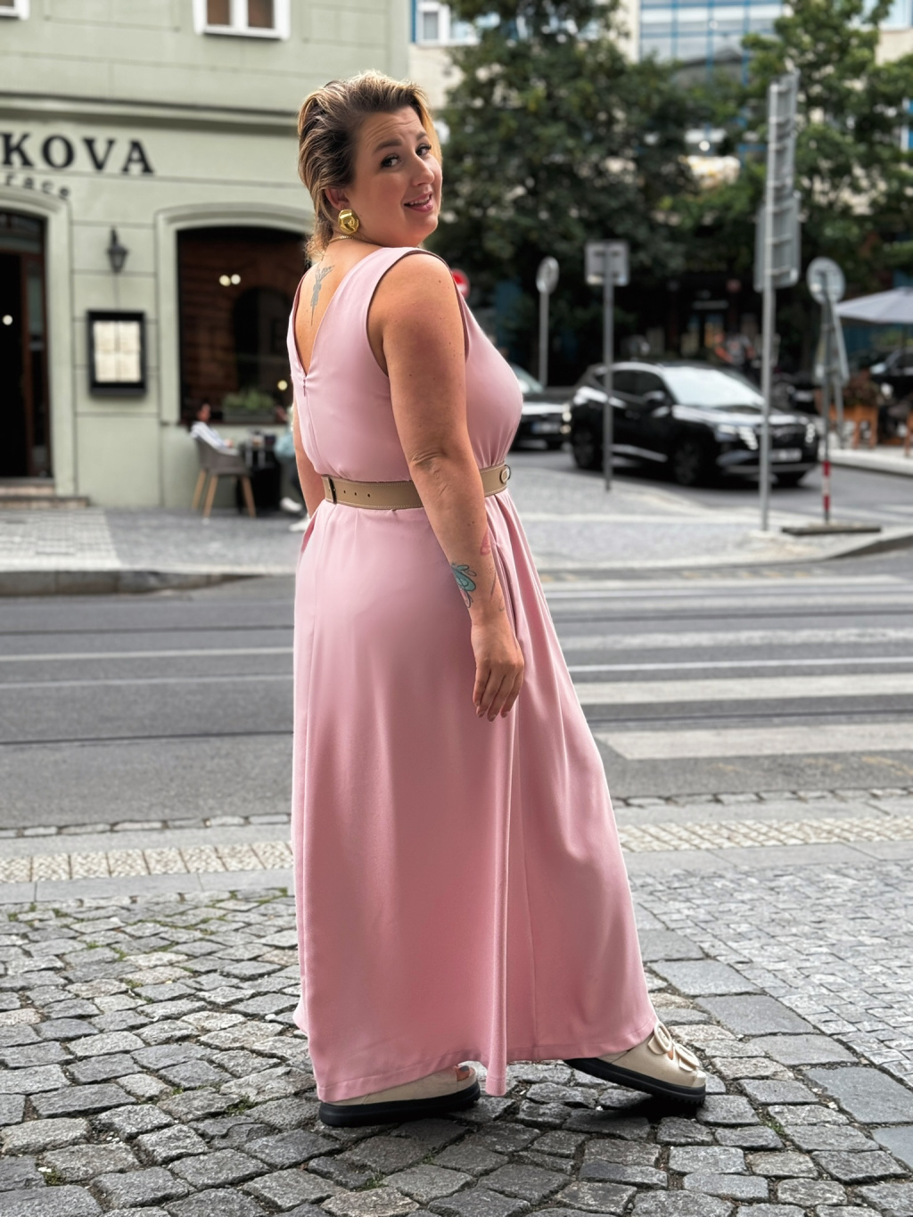 Lehoučká áčková sukně se vzadu jemně prodlužuje a při chůzi nádherně splývá. Délka šatů sahá přibližně nad kotníky, takže působí elegantně, ale zůstávají ležérní a pohodlné.