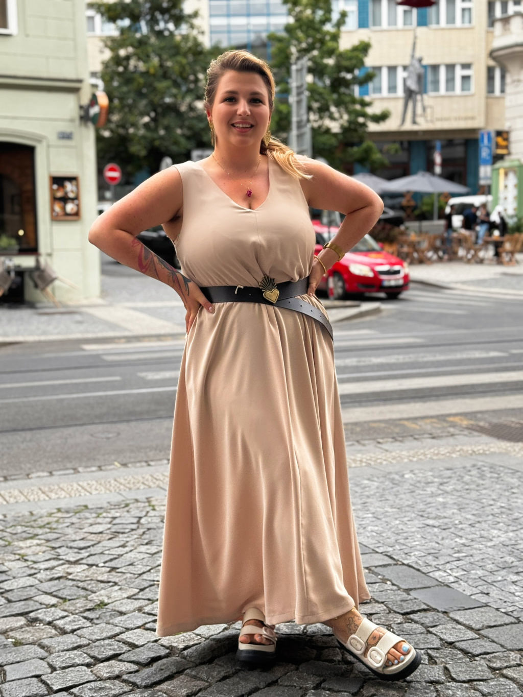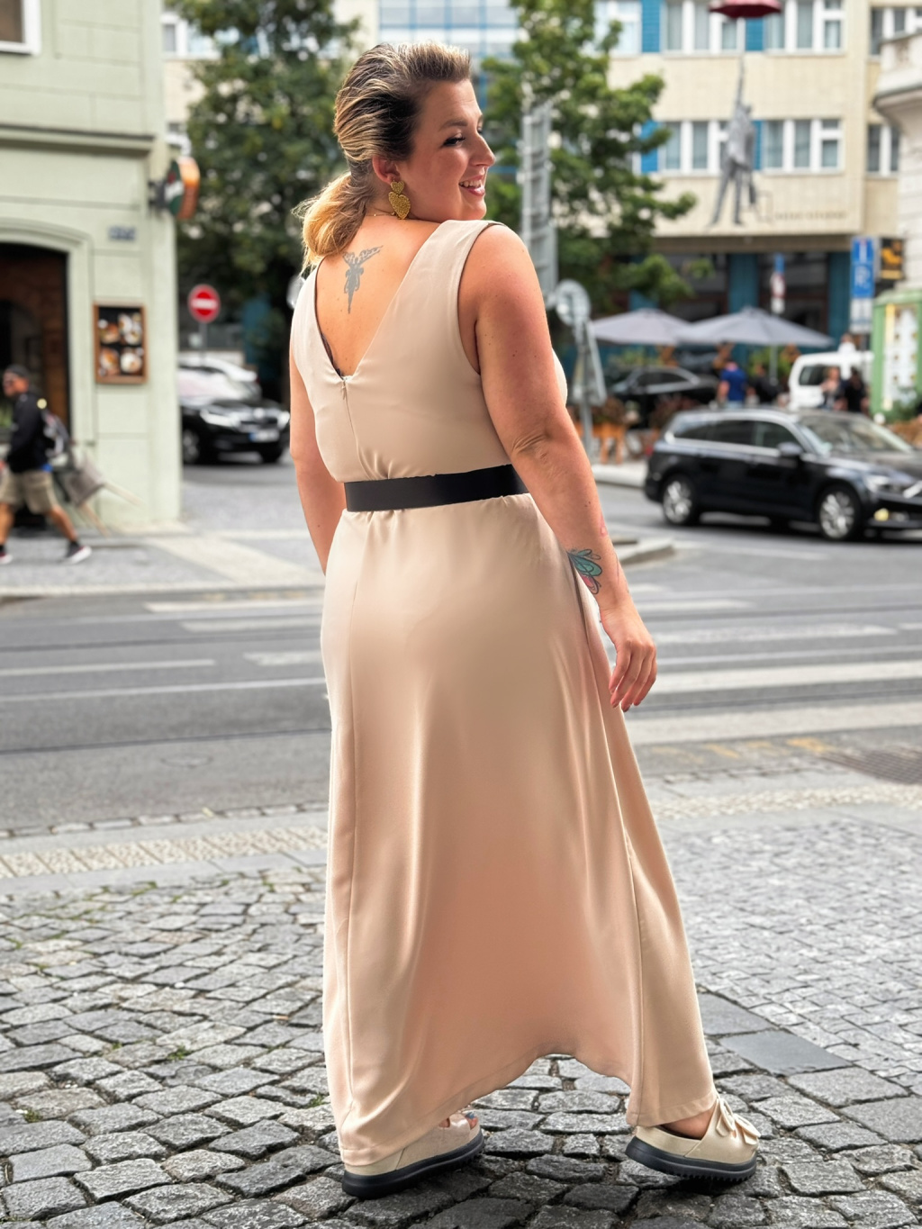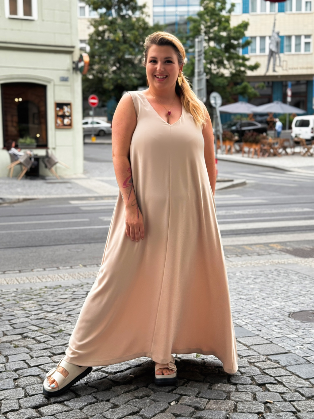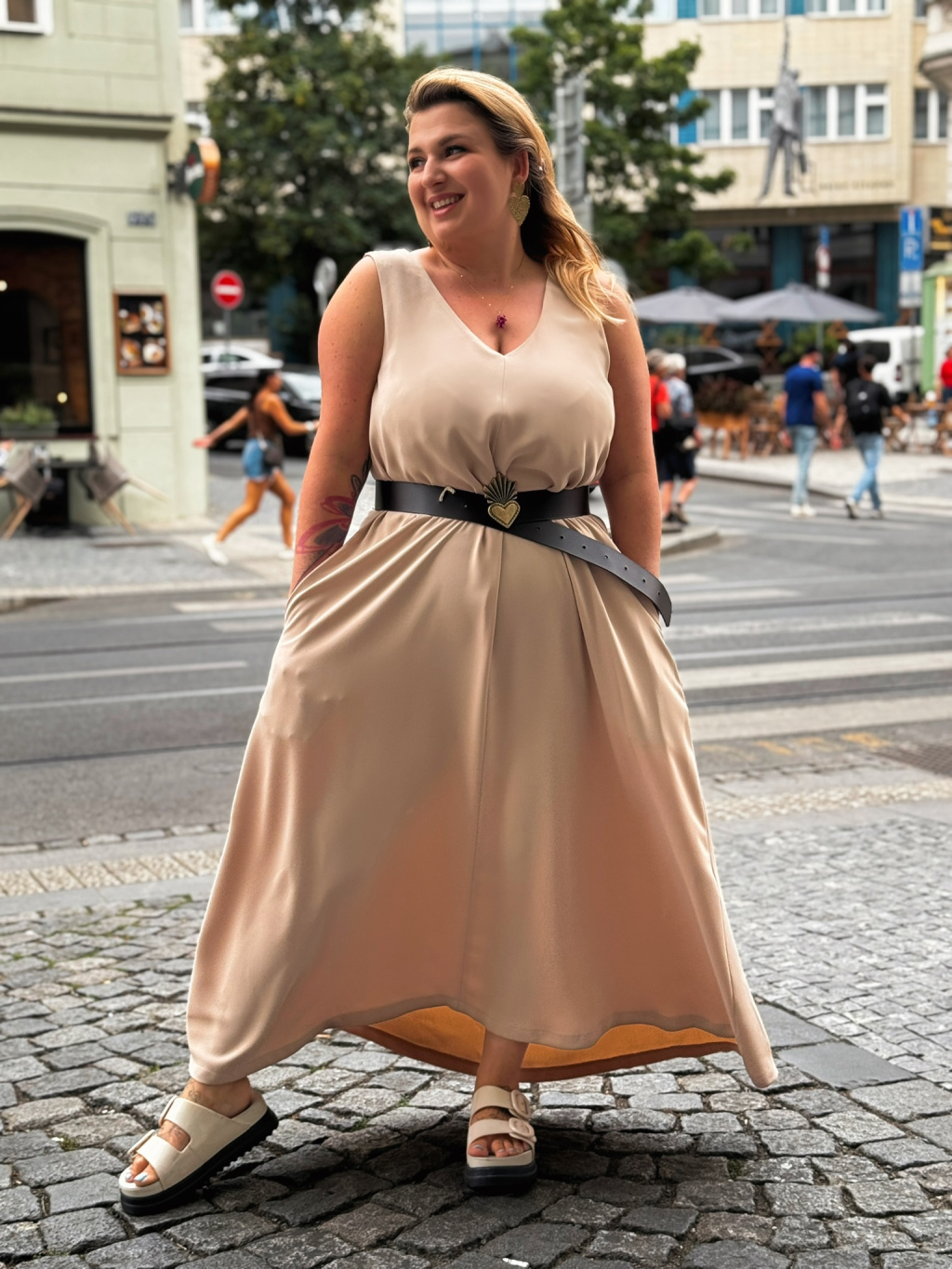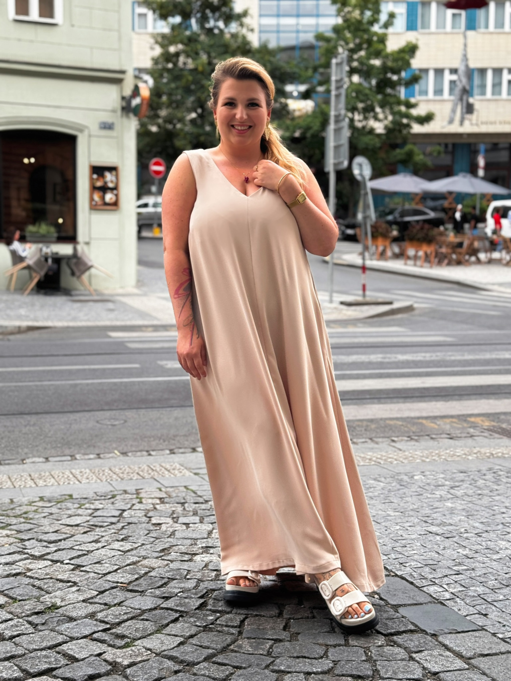 Šaty mají pohodlná široká ramínka a efektní výstřih do V – a to jak zepředu, tak zezadu, což jim dodává jemný, ale rafinovaný nádech. Zezadu jsou doplněné skrytým zipem, díky kterému krásně sedí, a nechybí ani praktické kapsy, které milujeme úplně všechny.