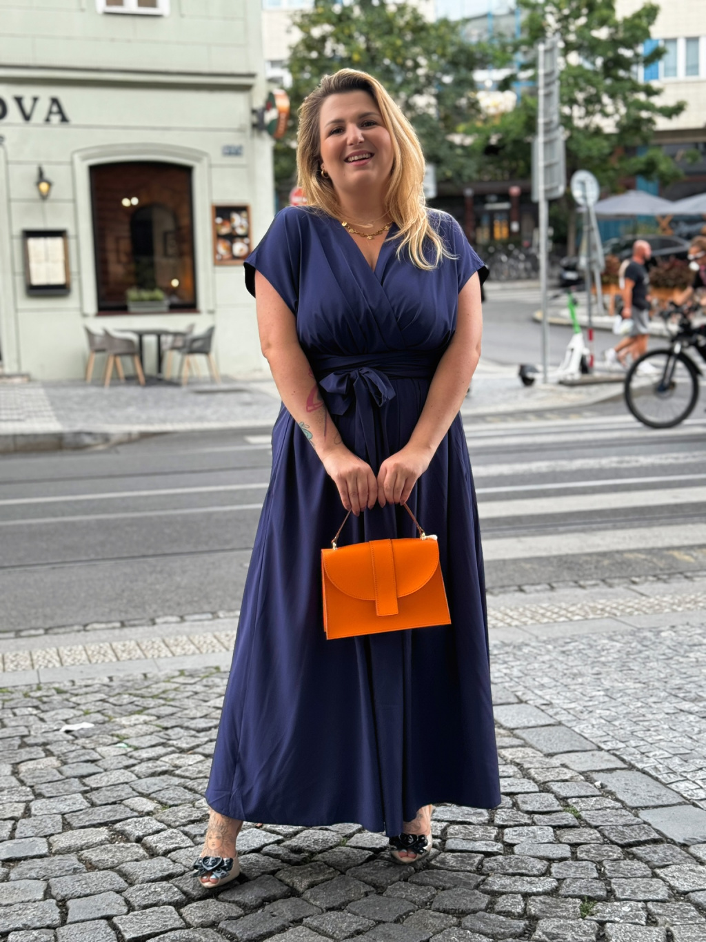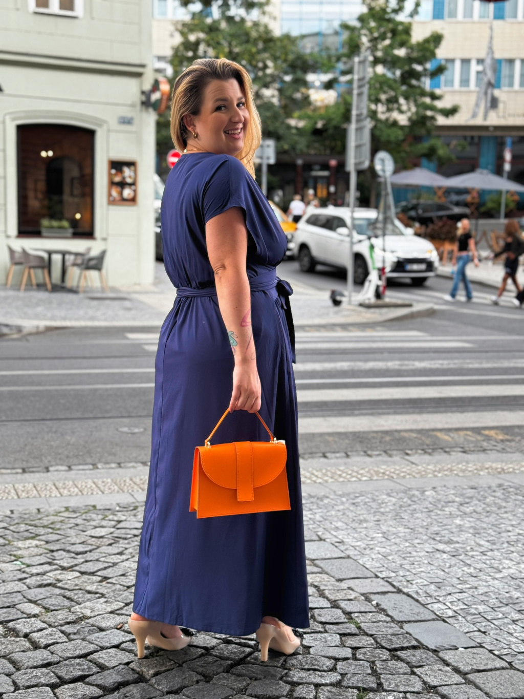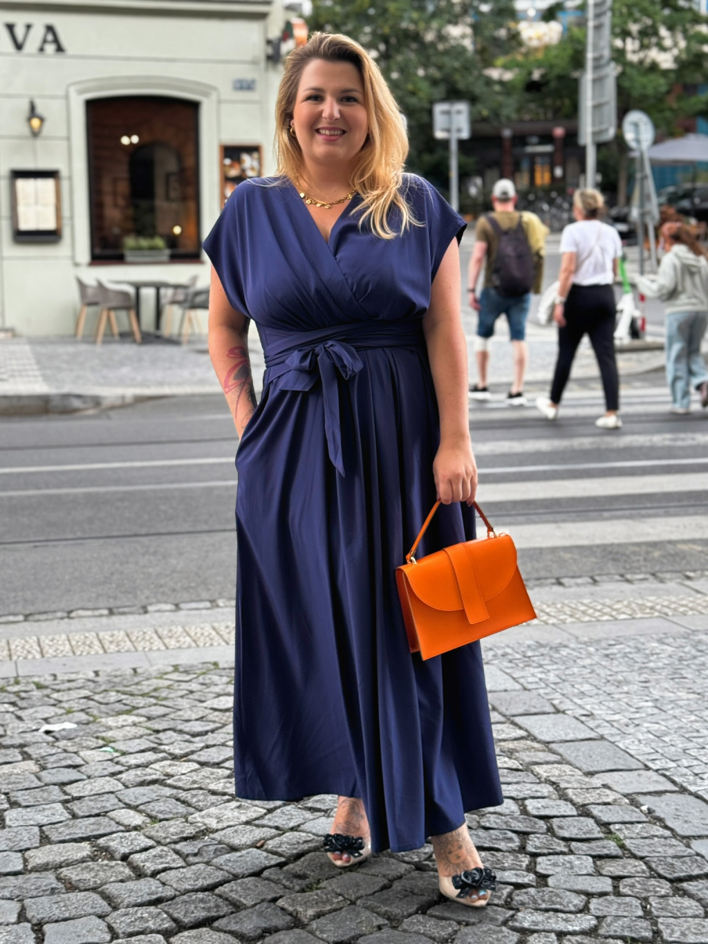 Šaty mají pohodlný střih s délkou do půlky lýtek, krátkým rukávem a výstřihem do V, který lichotí každé postavě. V pase najdeš širokou zavazovací část, se kterou můžeš kouzlit a vytvořit několik variant vázání podle nálady nebo příležitosti. A jako třešnička na dortu – kapsy! Protože styl a praktičnost můžou jít ruku v ruce.