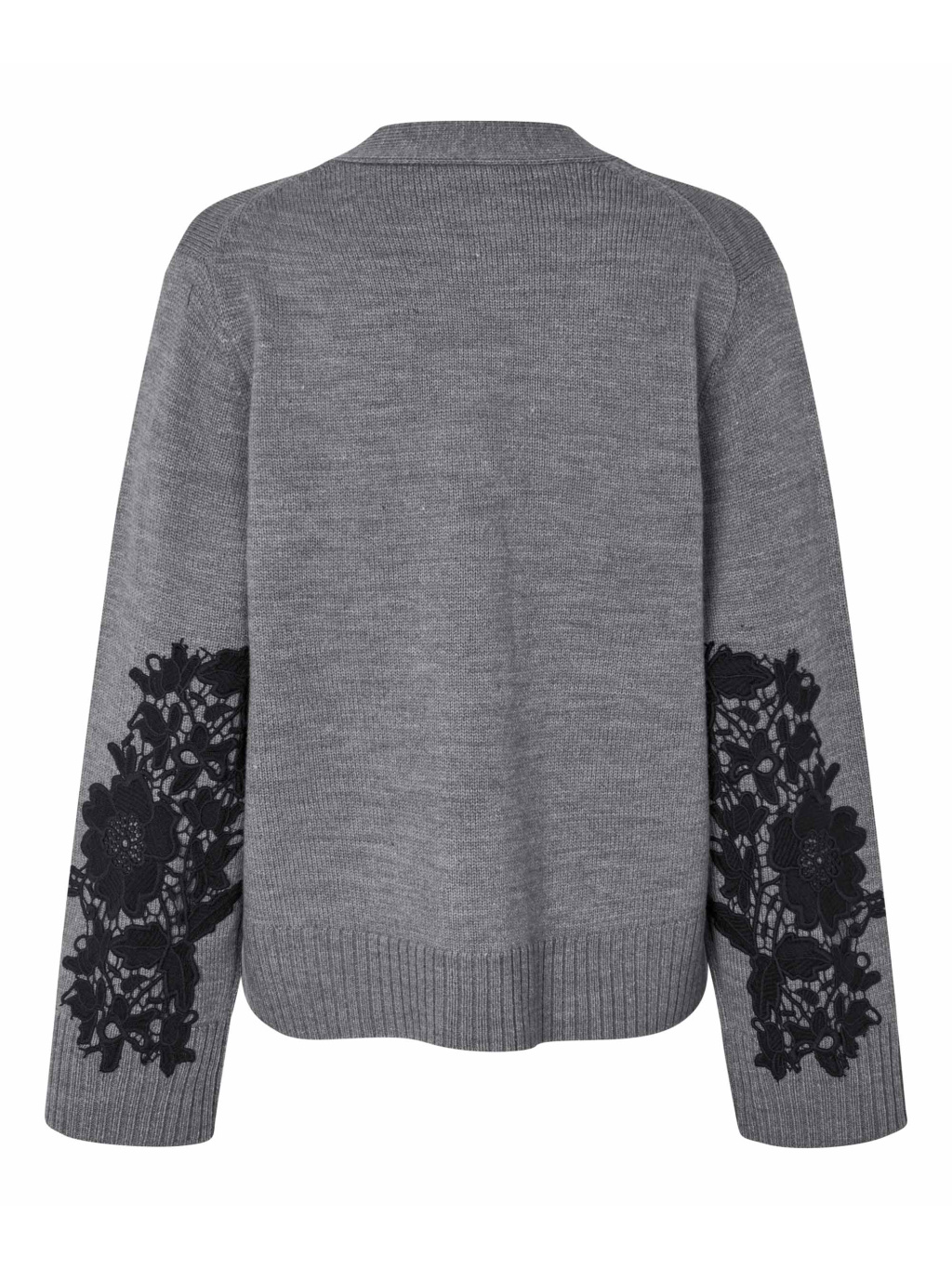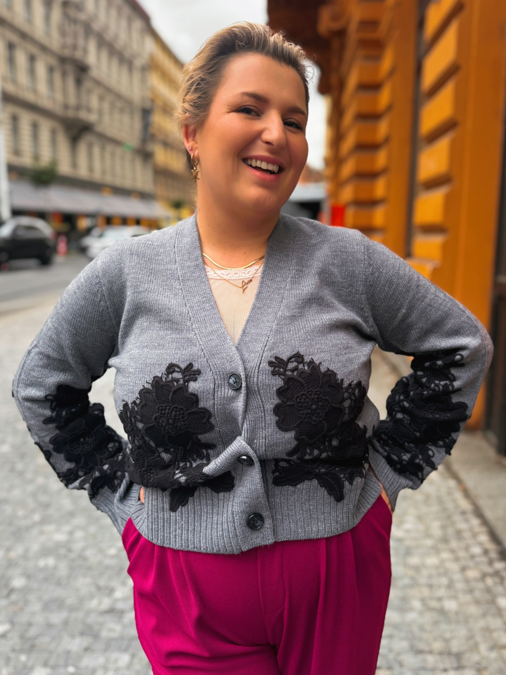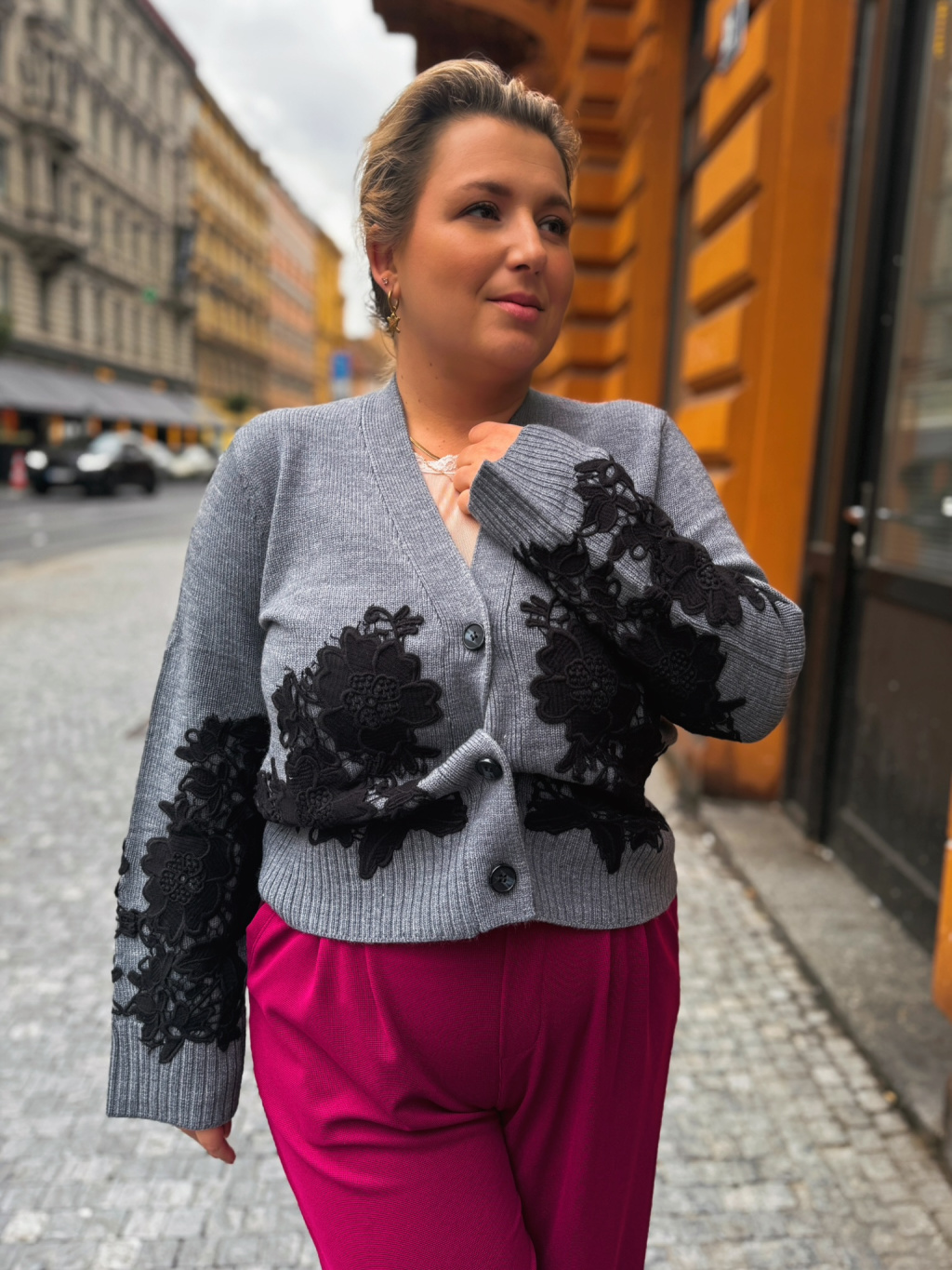 Tento propínací svetr Leviane od MASAI je skutečným klenotem mezi pleteninami. Vyrobený z luxusního pružného úpletu s 50% podílem vlny, spojuje v sobě hřejivost, komfort a eleganci. Jeho šedý základ doplňuje výrazná černá krajková aplikace, která je našitá na předním dílu i na rukávech. Právě tento detail dodává svetru výjimečný a ženský charakter.