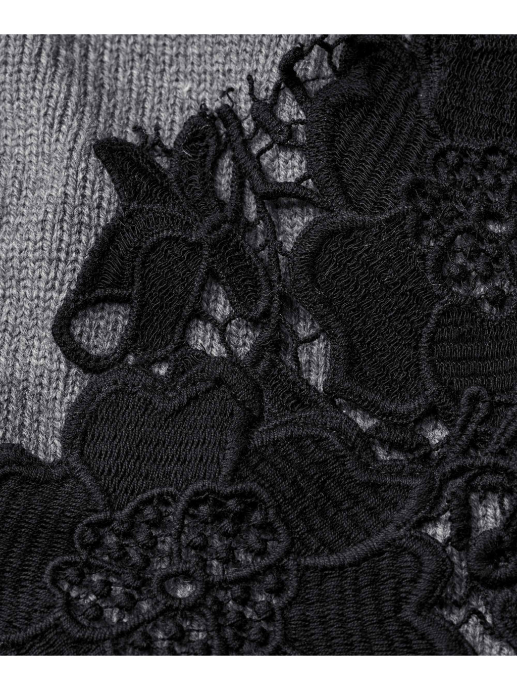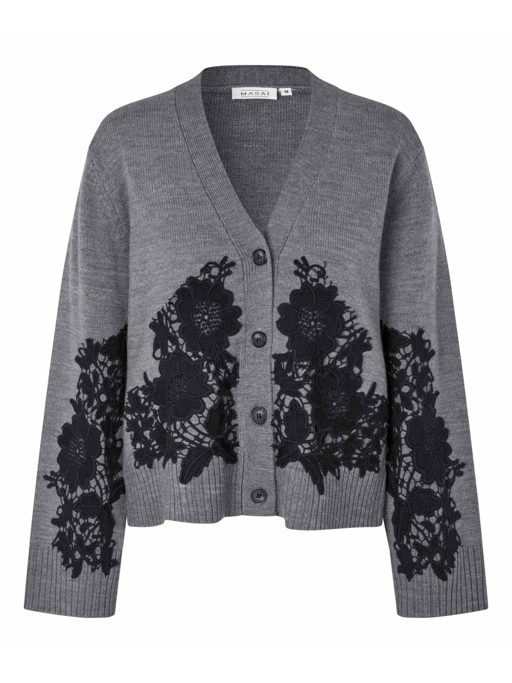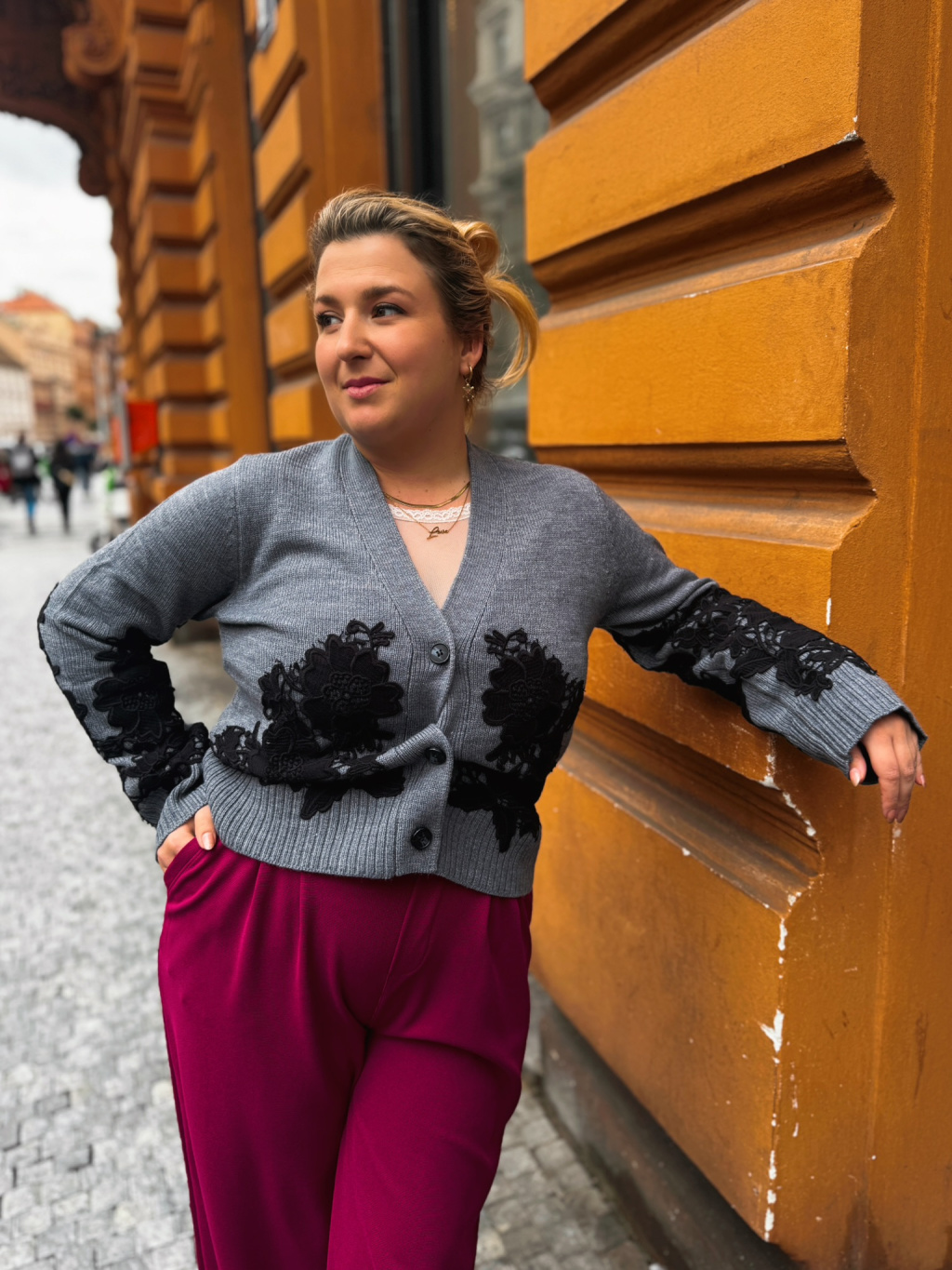 Tento propínací svetr Leviane od MASAI je skutečným klenotem mezi pleteninami. Vyrobený z luxusního pružného úpletu s 50% podílem vlny, spojuje v sobě hřejivost, komfort a eleganci. Jeho šedý základ doplňuje výrazná černá krajková aplikace, která je našitá na předním dílu i na rukávech. Právě tento detail dodává svetru výjimečný a ženský charakter.