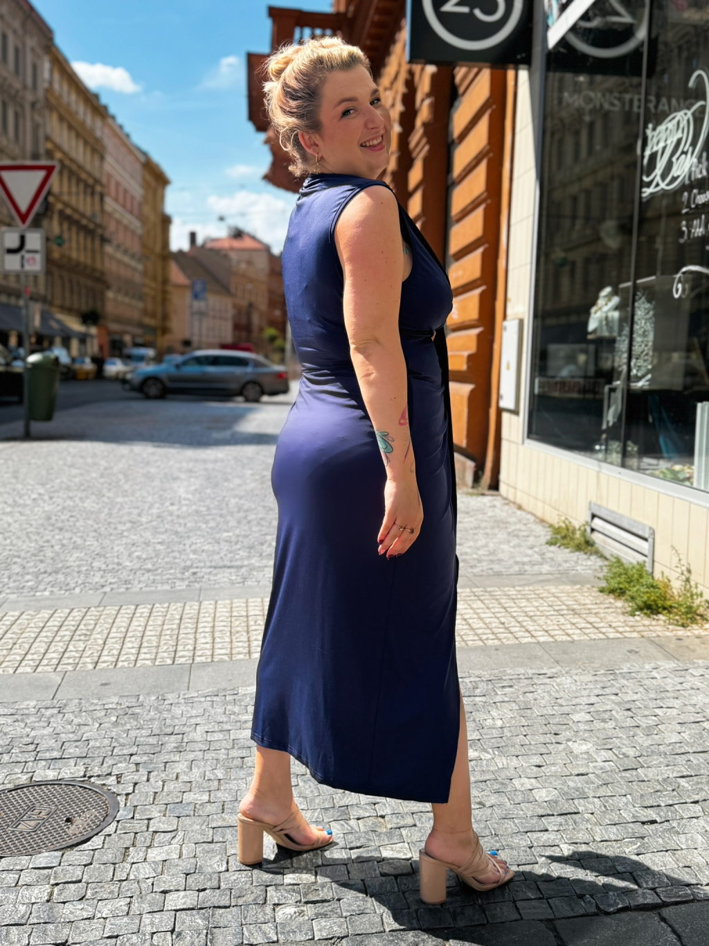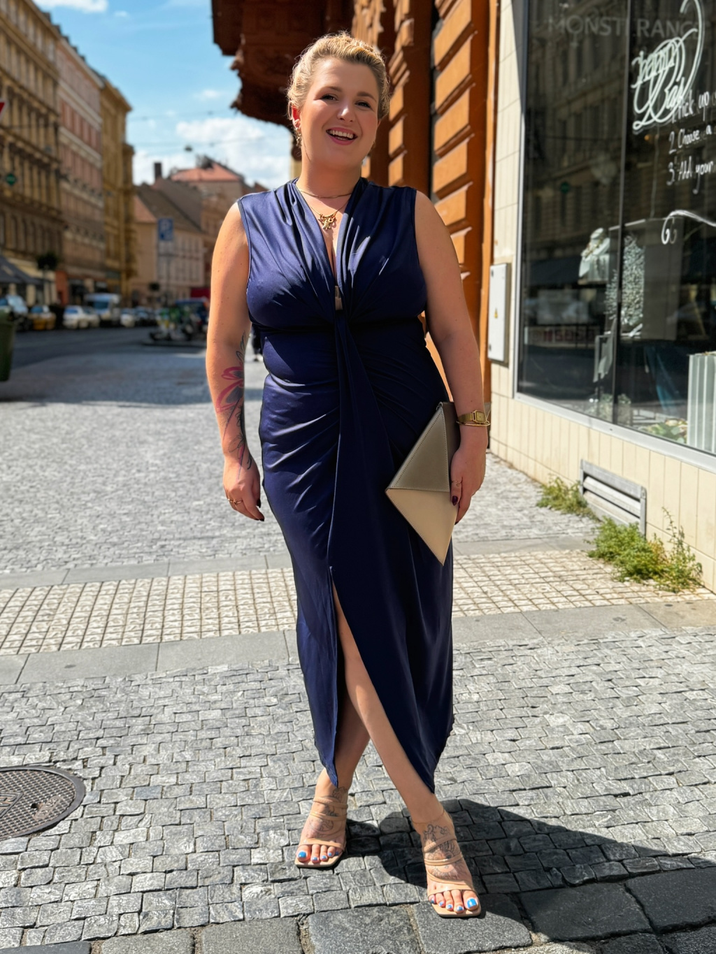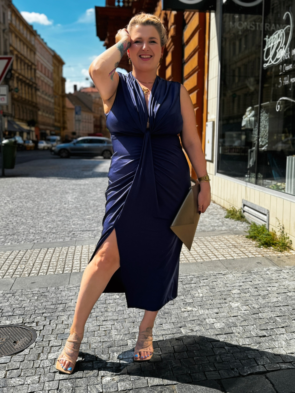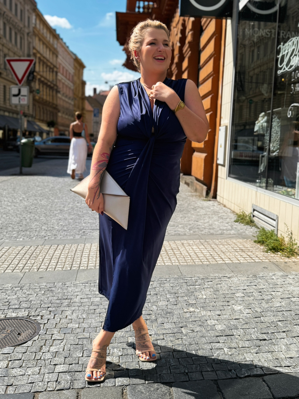 Skvělým detailem je uzel pod prsy, který nejen zvýrazní siluetu, ale zároveň šikovně schová drobné nedokonalosti v oblasti bříška. Šaty nemají rukávy, a tak se dají skvěle vrstvit – vypadají výborně třeba s křivákem, oversized sakem nebo kardiganem.