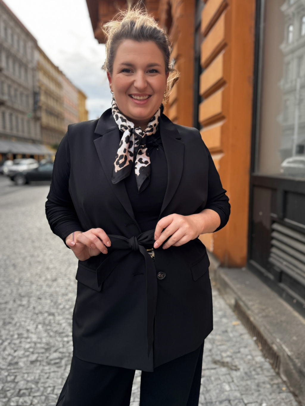Součástí je látkový pásek ve stejné barvě, díky kterému si můžeš snadno zvýraznit pas a dotvořit ženskou siluetu. Klasické klopy, jeden knoflík a decentní kapsy podtrhují její sofistikovaný vzhled.