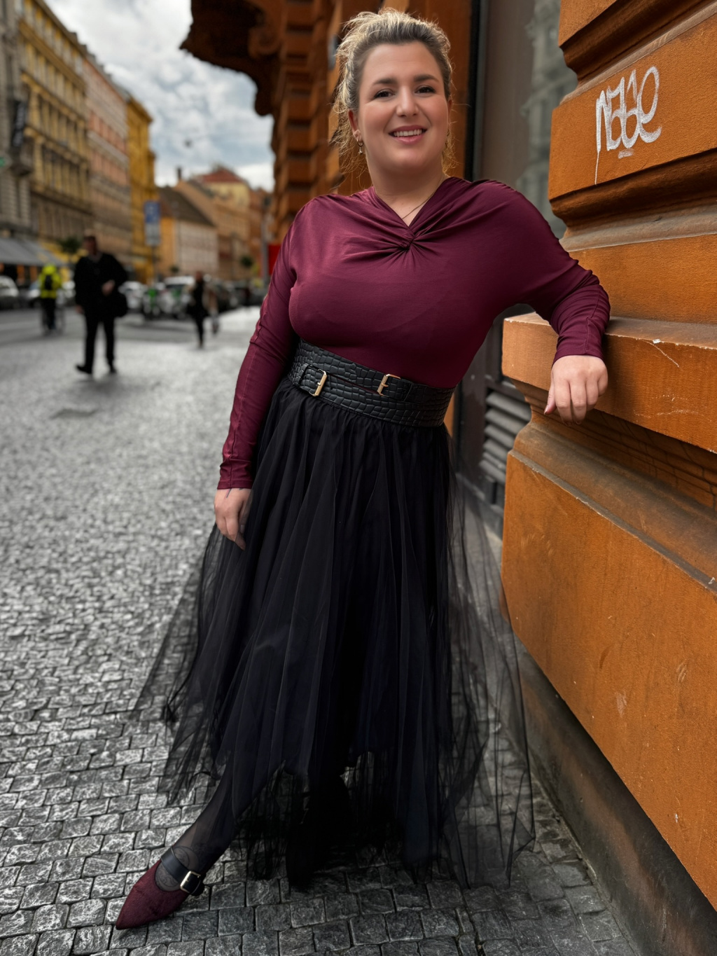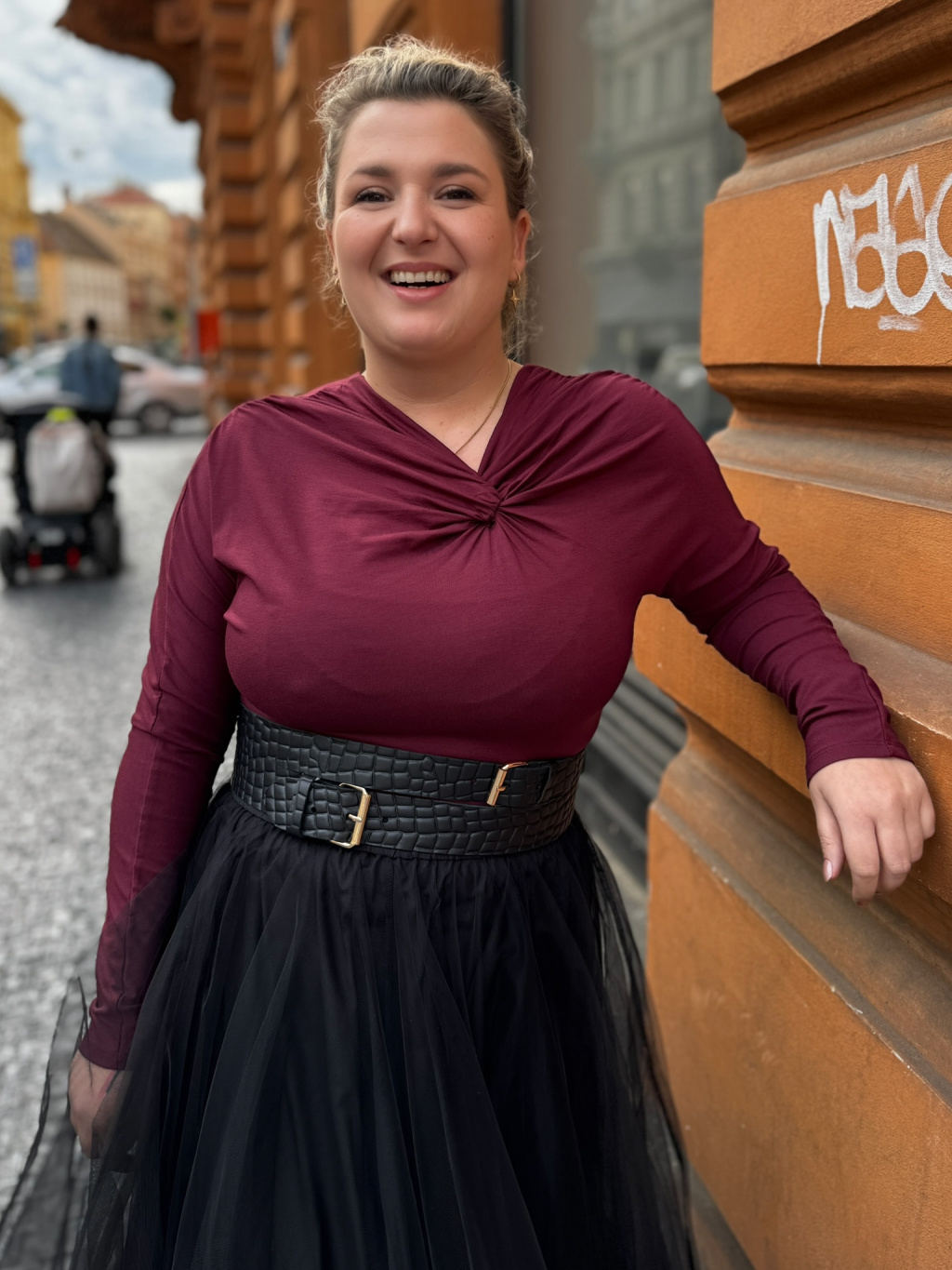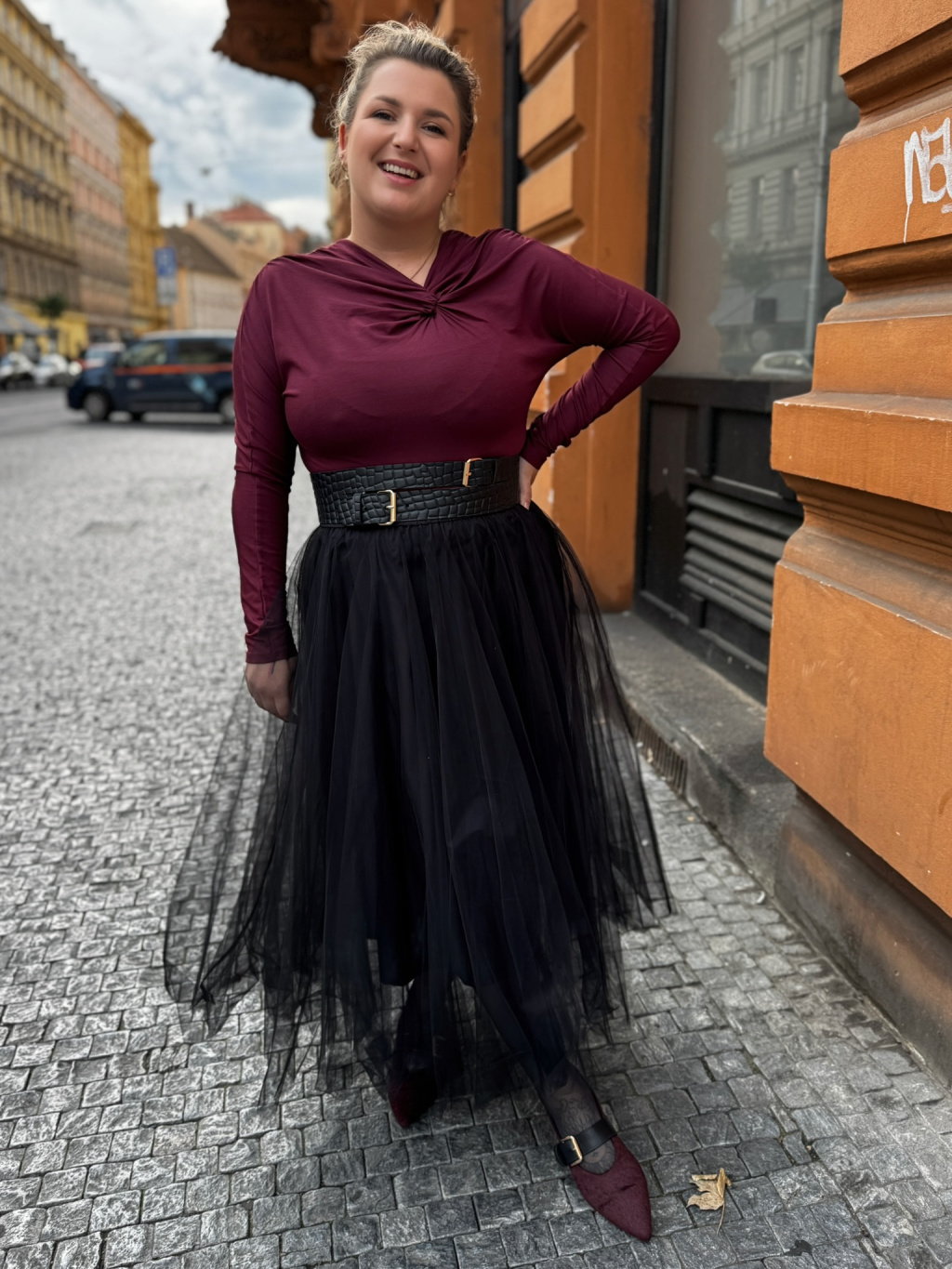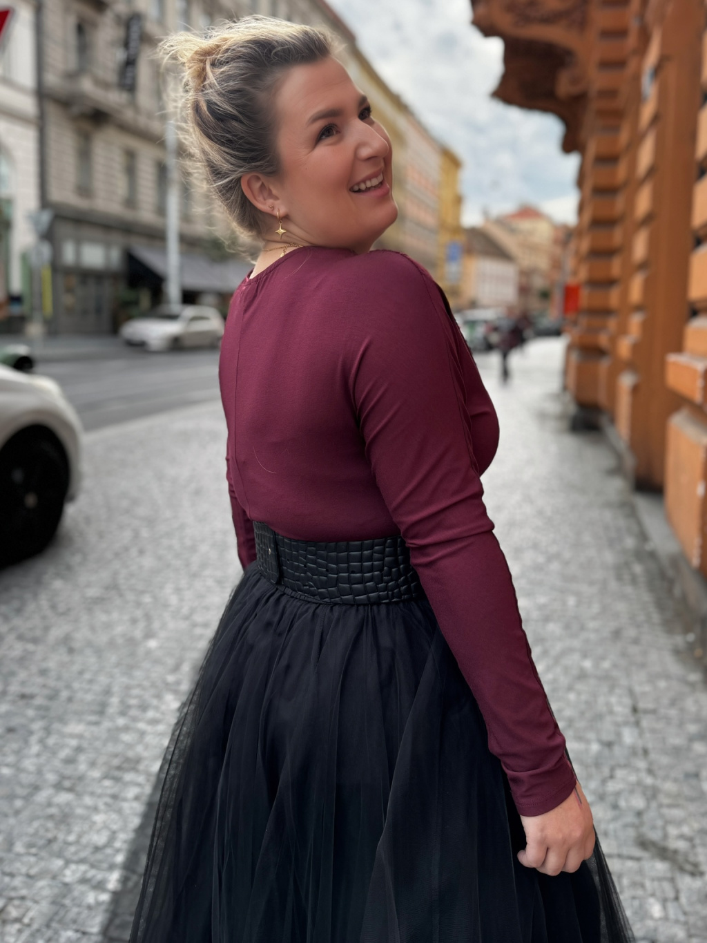 Dostupný je ve dvou variantách – klasické černé a syté bordo červené, takže si můžeš vybrat podle nálady i příležitosti. Elegantní, univerzální a pohodlný – top, který v šatníku rozhodně využiješ naplno.