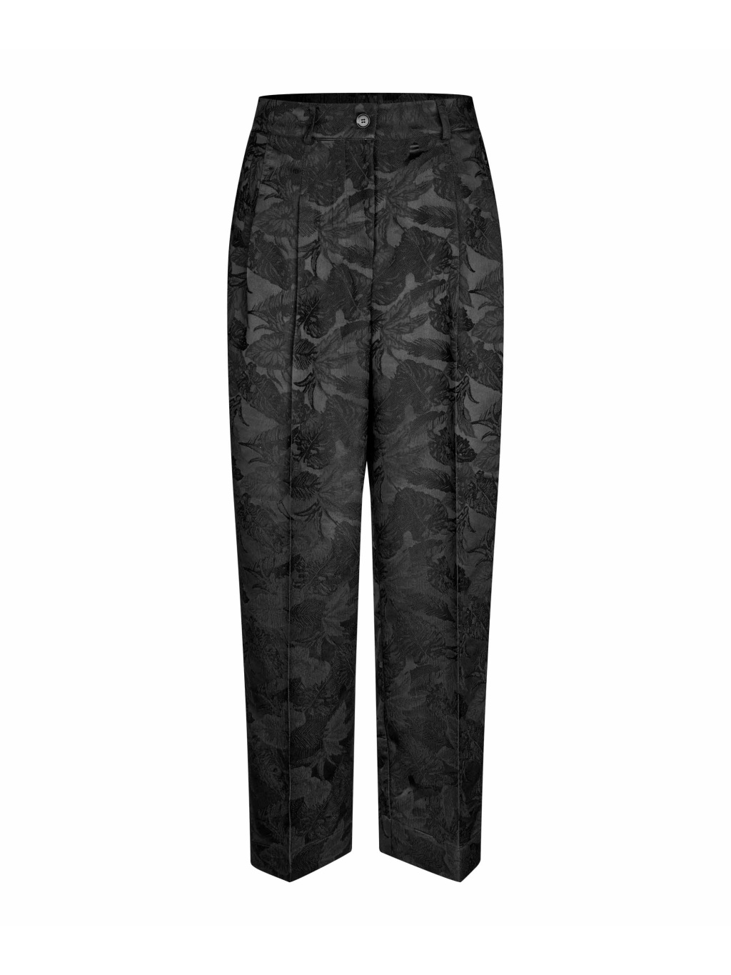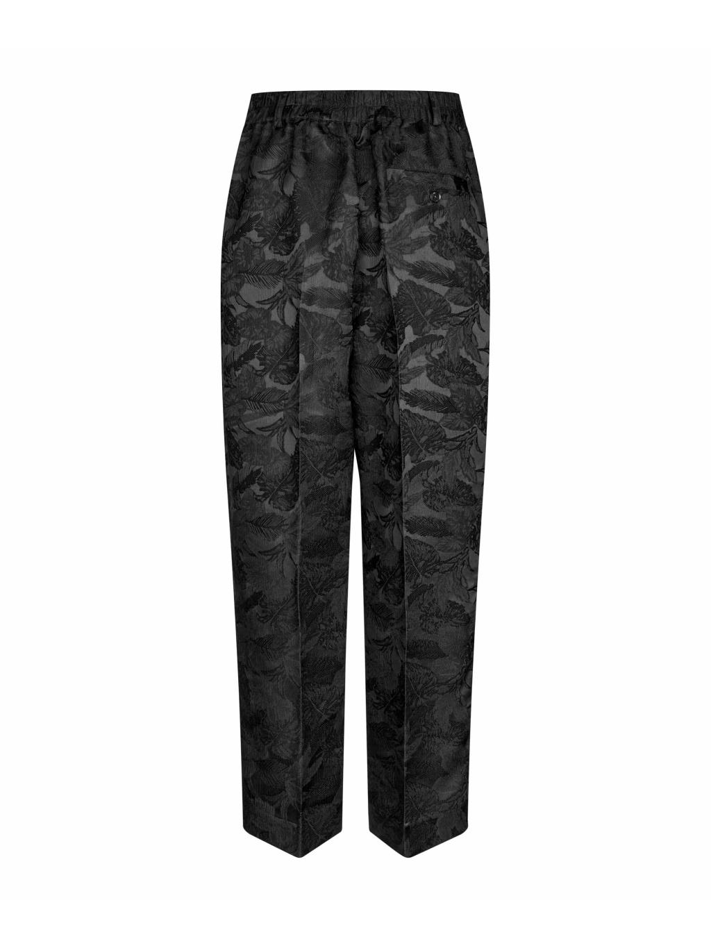 Kalhoty Perli od MASAI jsou perfektním kouskem, který spojuje pohodlí a originalitu. Jsou ušité z kvalitního žakárového materiálu, který na první pohled zaujme decentním květinovým vzorem v černém tónu. Díky volnějšímu střihu a pružnému pasu na zadní straně se pohodlně nosí a zároveň působí elegantně. Přední část je doplněna zapínáním na knoflík a zip, takže kalhoty drží krásně tvar.