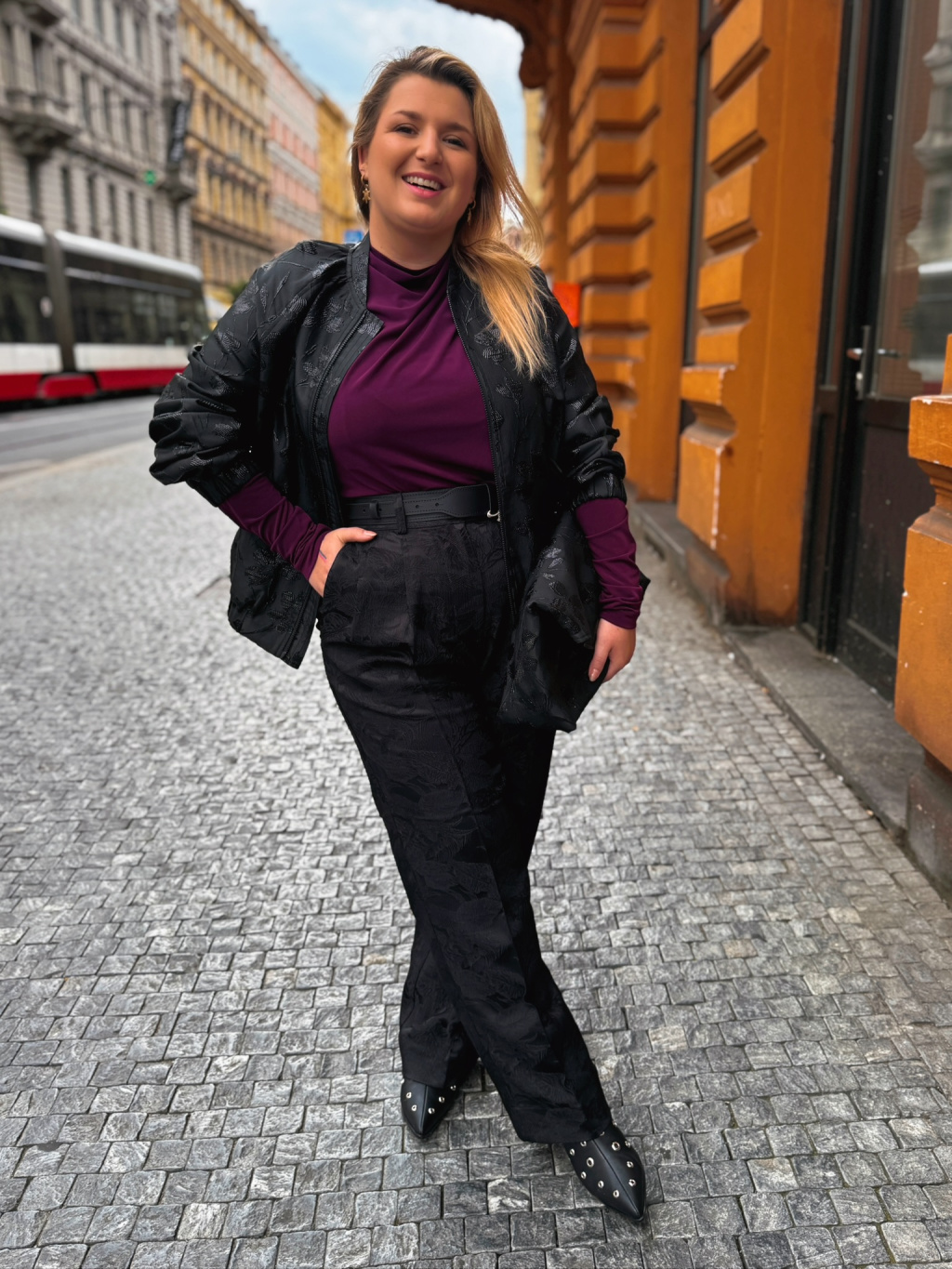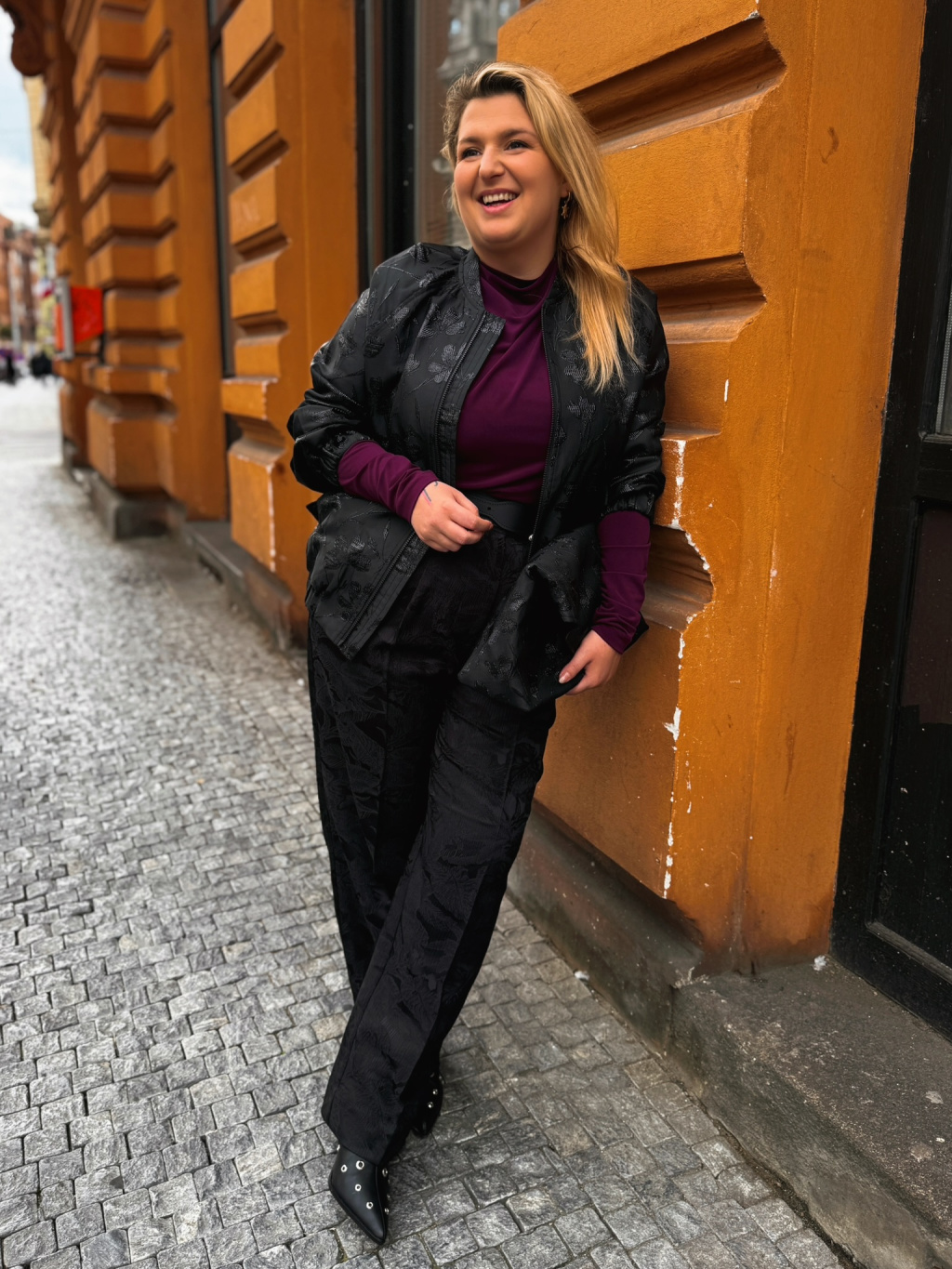 Kalhoty můžeš nosit jako součást setu s bomberem Josanna ve stejném provedení, čímž vznikne luxusní a výrazný outfit, nebo je zkombinovat s jednoduchým jednobarevným topem či svetrem, pokud chceš dát vyniknout jejich vzoru. Díky černé barvě je snadno sladíš i s výraznějšími doplňky.